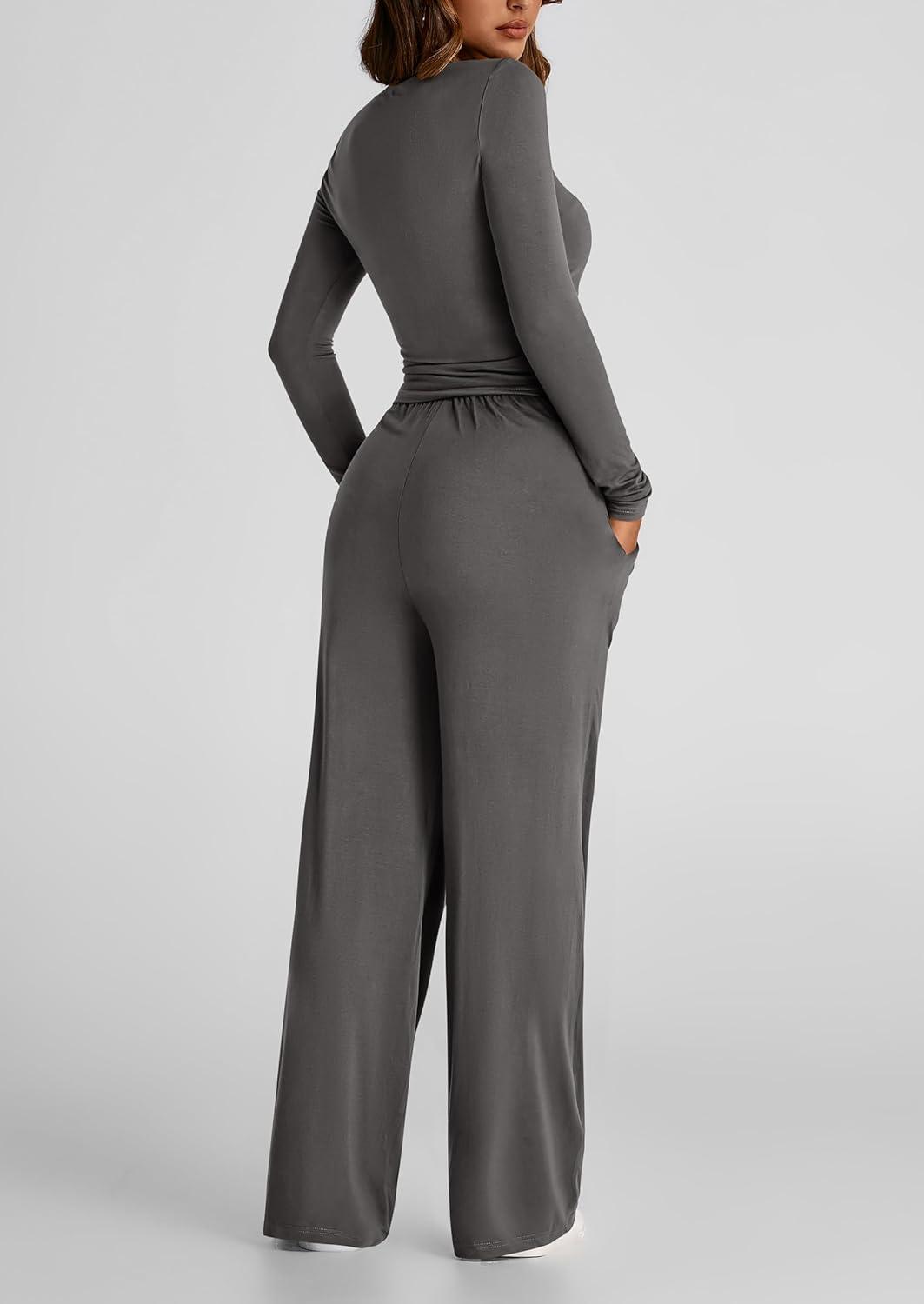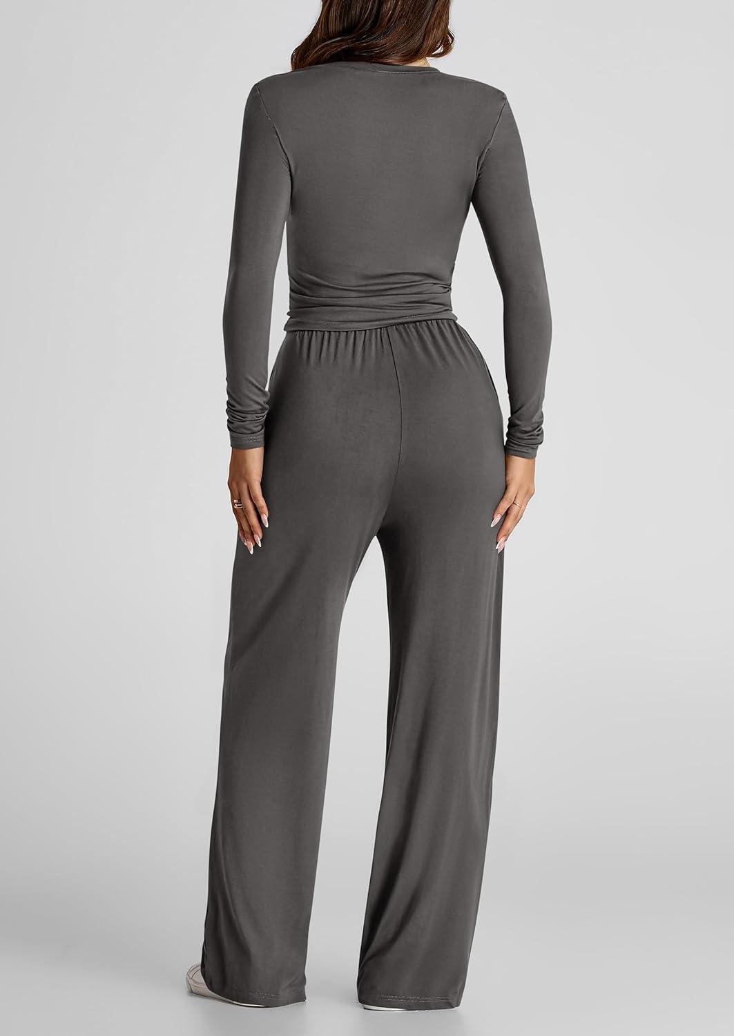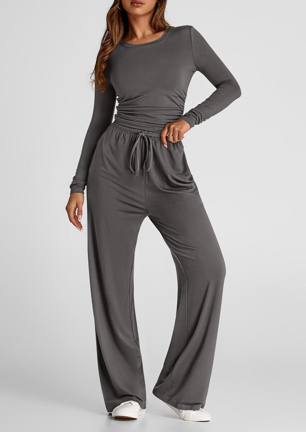 PRETTYGARDEN Women’s 2 Piece Outfits Fall Tracksuits Long Sleeve Crop Tops Wide Leg Pants Spring Matching Lounge Travel Sets(Dark Grey)