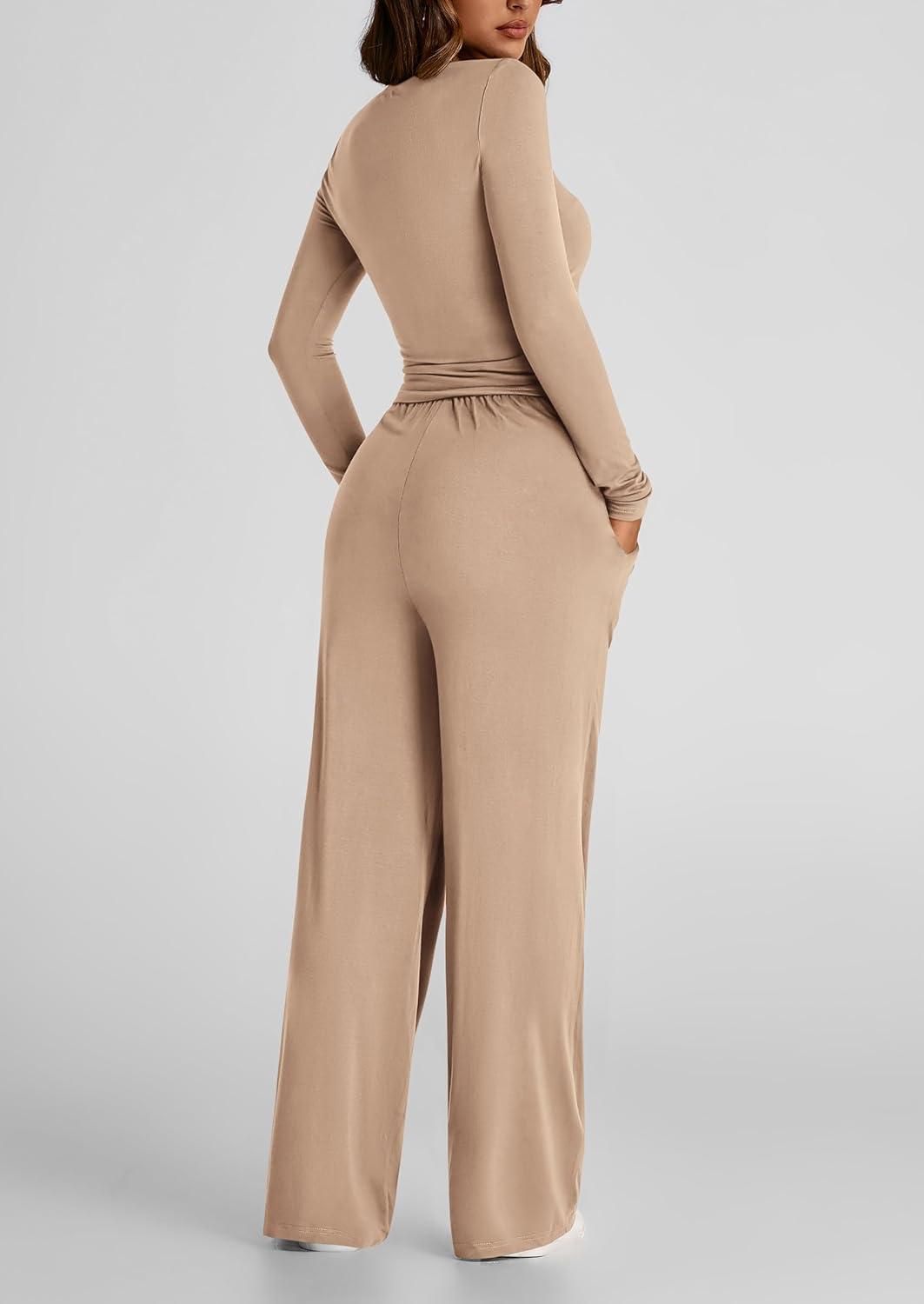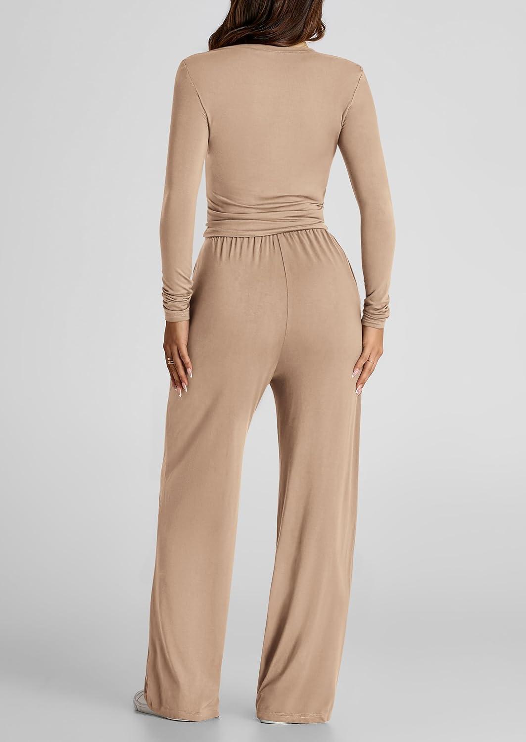 PRETTYGARDEN Women’s 2 Piece Outfits Fall Tracksuits Long Sleeve Crop Tops Wide Leg Pants Spring Matching Lounge Travel Sets(Camel)