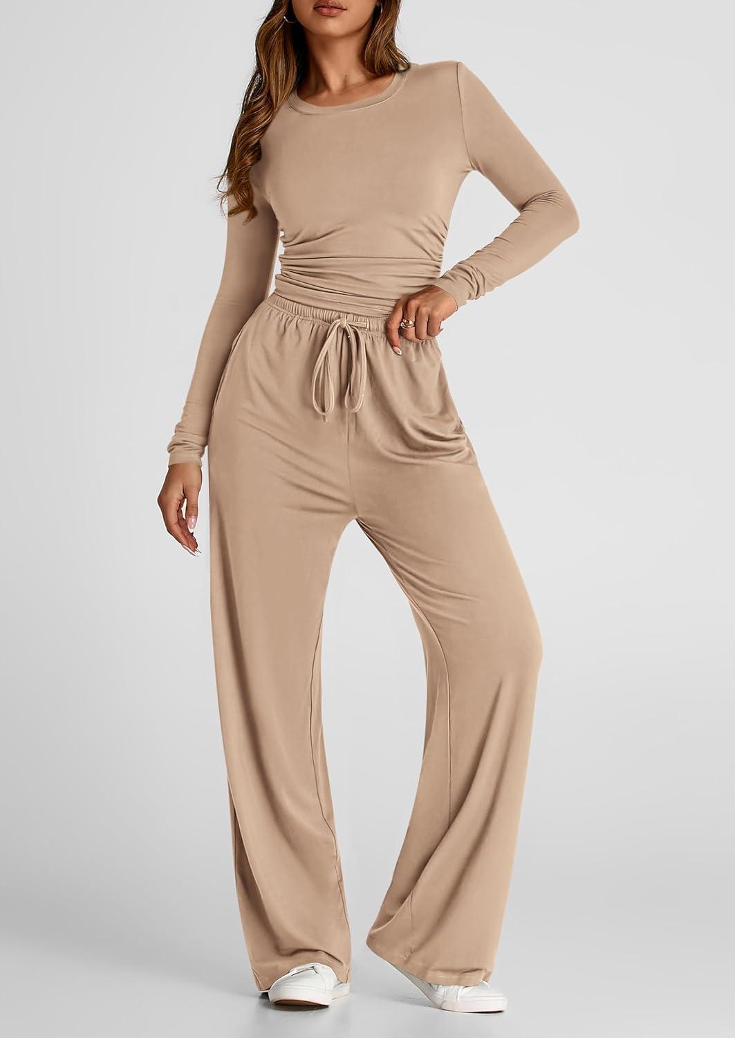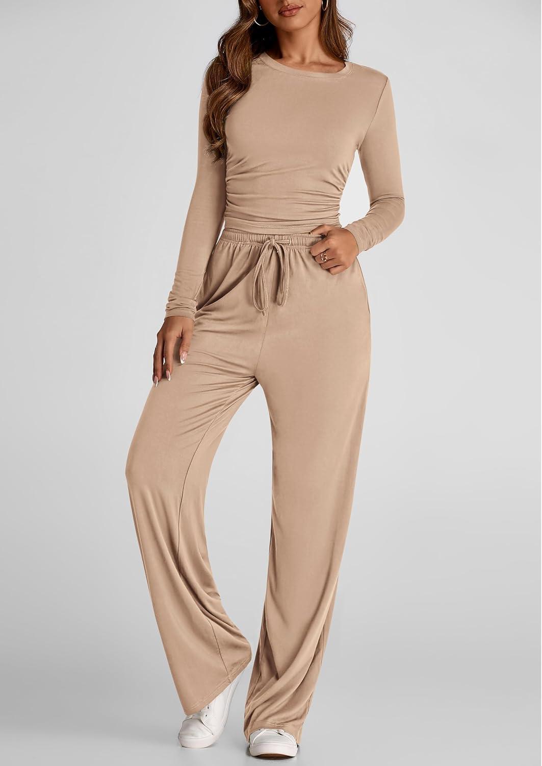 PRETTYGARDEN Women’s 2 Piece Outfits Fall Tracksuits Long Sleeve Crop Tops Wide Leg Pants Spring Matching Lounge Travel Sets(Khaki)