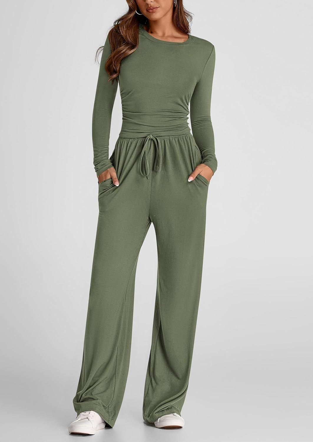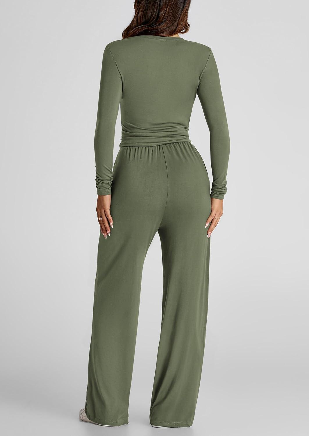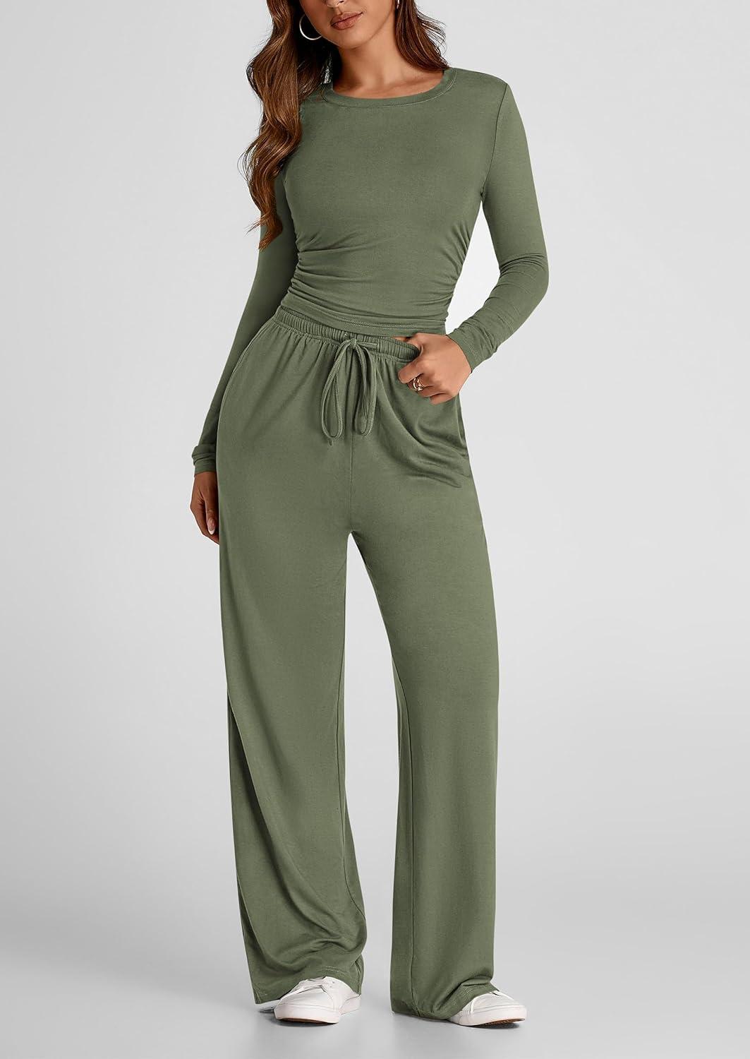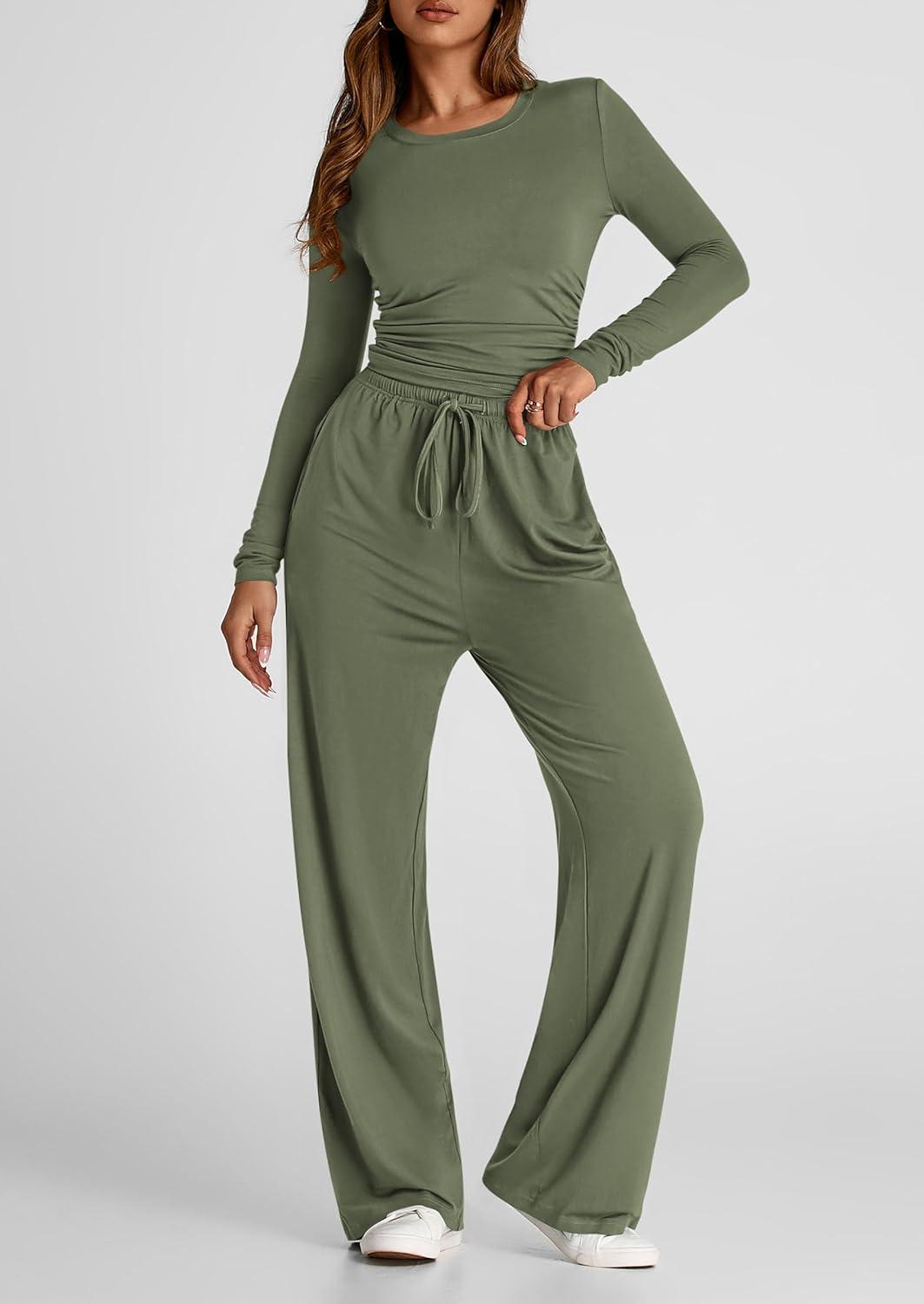 PRETTYGARDEN Women’s 2 Piece Outfits Fall Tracksuits Long Sleeve Crop Tops Wide Leg Pants Spring Matching Lounge Travel Sets(Light Army Green)