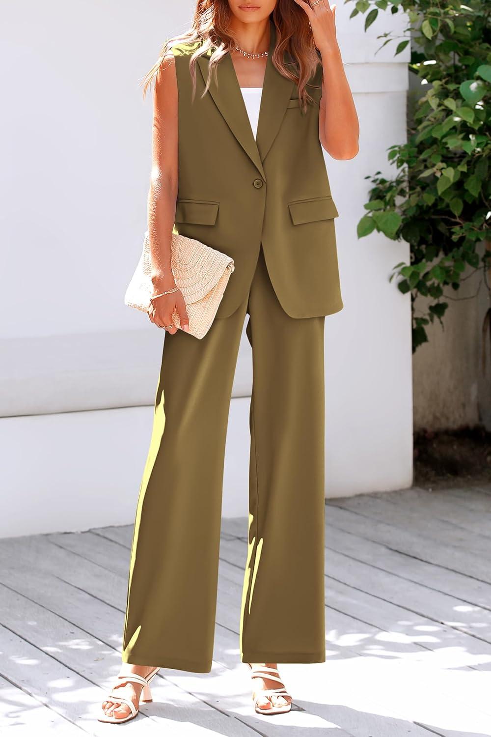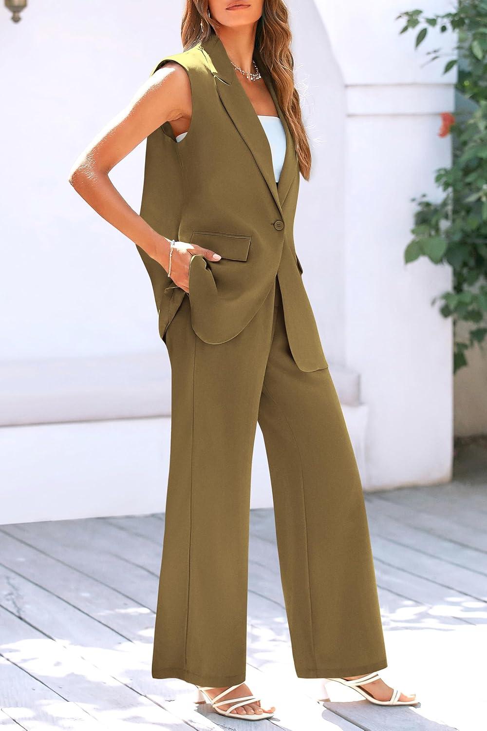 PRETTYGARDEN Women’s 2 Piece Outfits Sleeveless Suit Vest and Wide Leg Pants Business Casual Blazer Sets(Army Green)