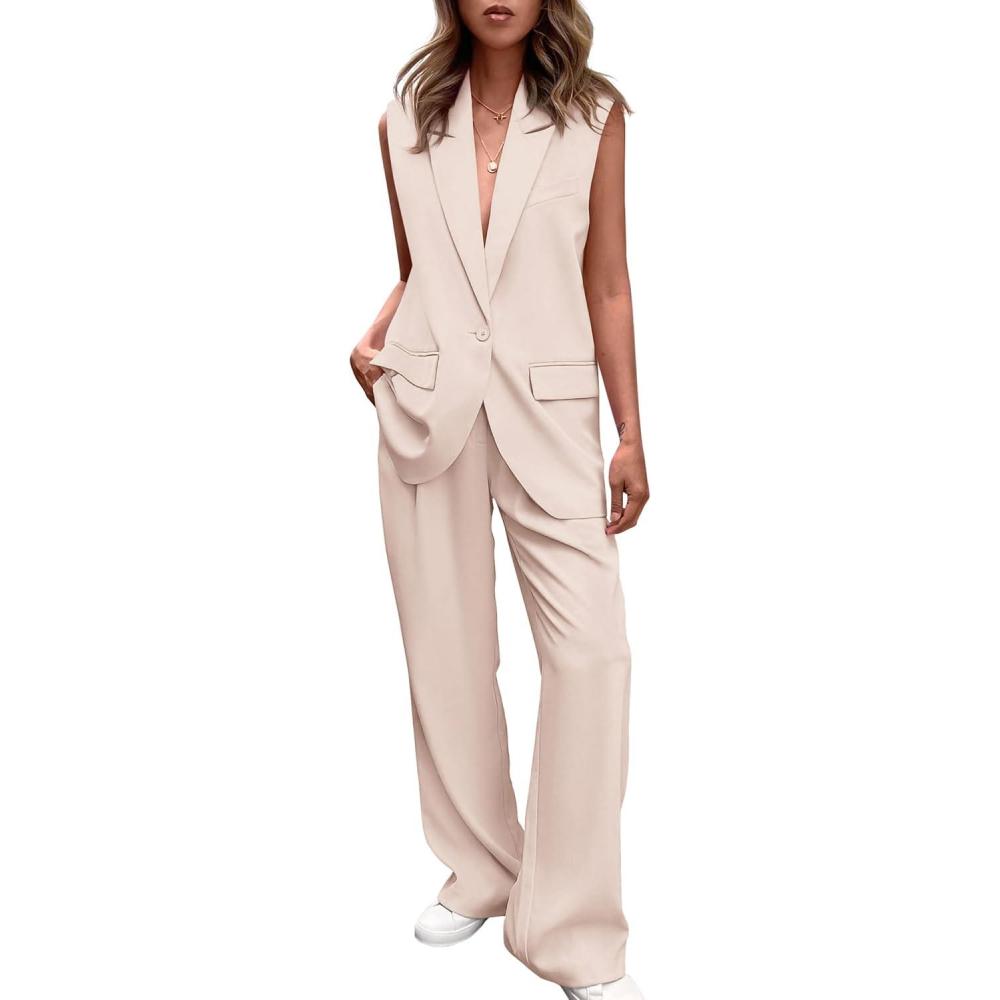 PRETTYGARDEN Women’s 2 Piece Outfits Sleeveless Suit Vest and Wide Leg Pants Business Casual Blazer Sets(Beige)