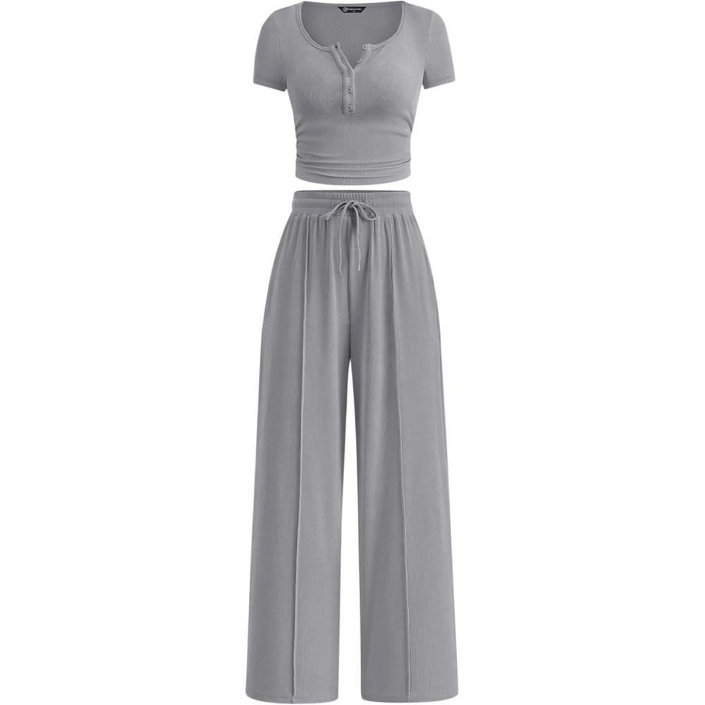 PRETTYGARDEN Womens 2 Piece Outfits Summer 2025 Ribbed Knit Button Short Sleeve Tops Casual Wide Leg Pants Lounge Sets(Grey)