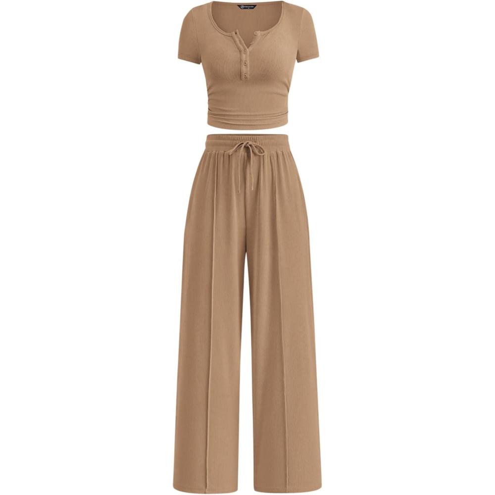 PRETTYGARDEN Womens 2 Piece Outfits Summer 2025 Ribbed Knit Button Short Sleeve Tops Casual Wide Leg Pants Lounge Sets(Khaki)