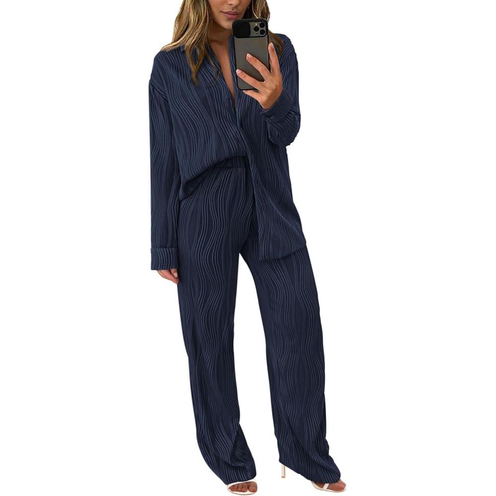 PRETTYGARDEN Women's 2 Piece Sets 2025 Fall Casual Textured Button Down Shirt Wide Leg Pants Outfits Loungewear Tracksuit(Dark Blue)