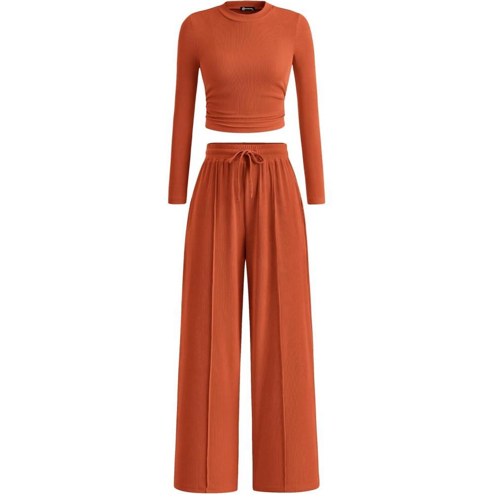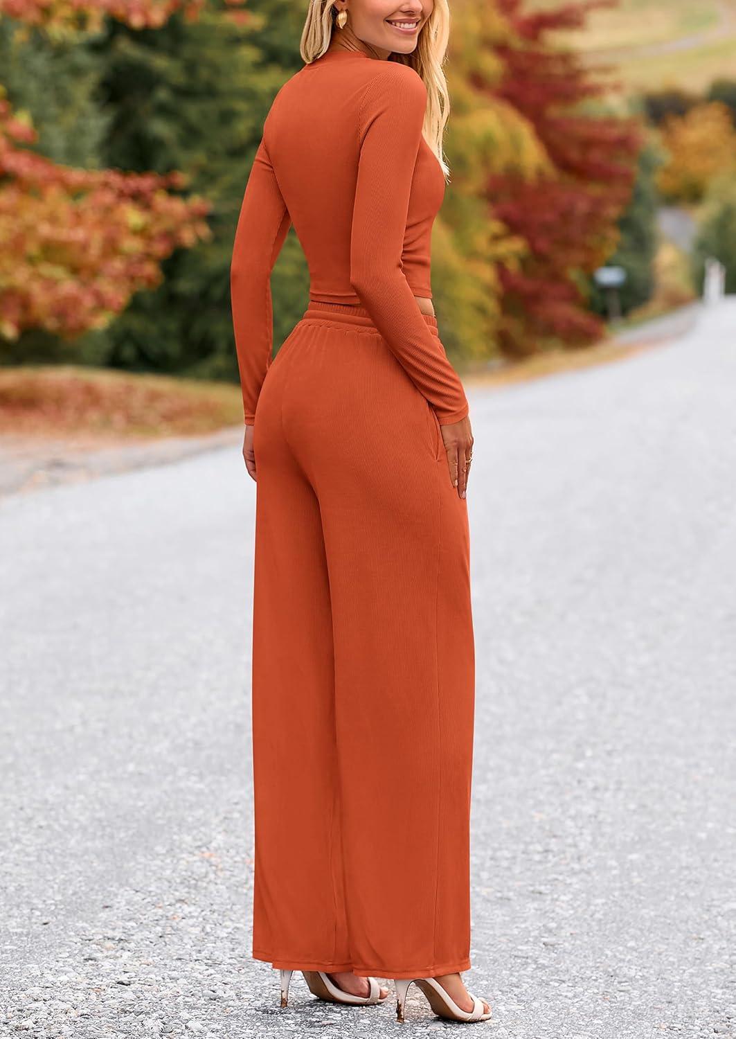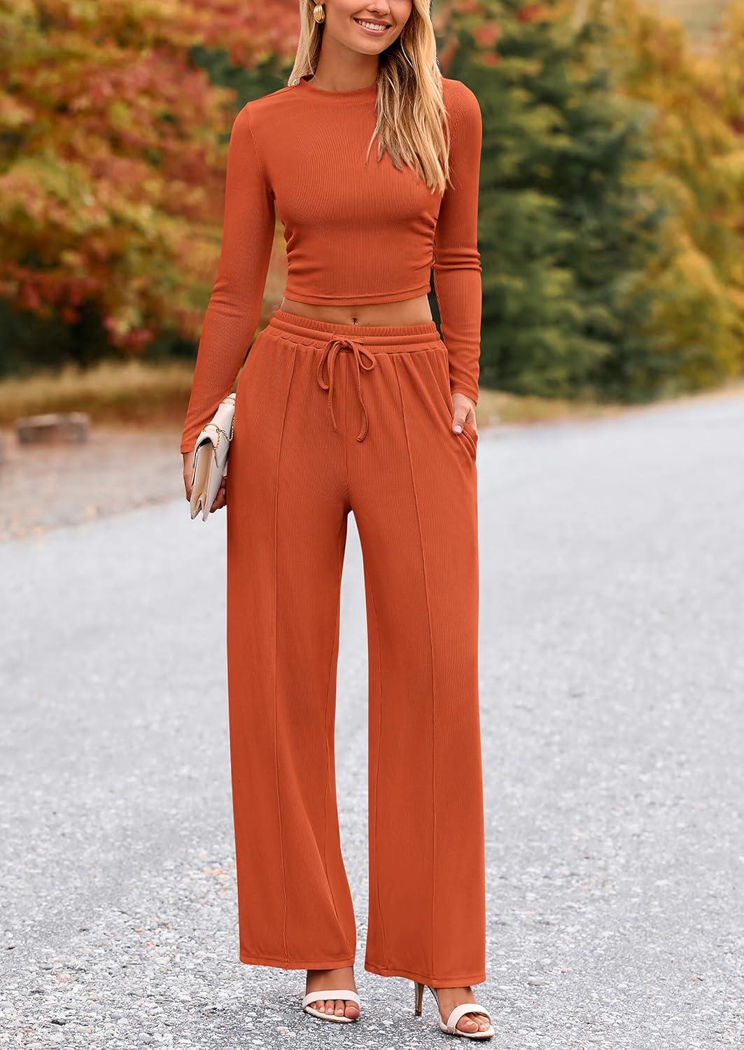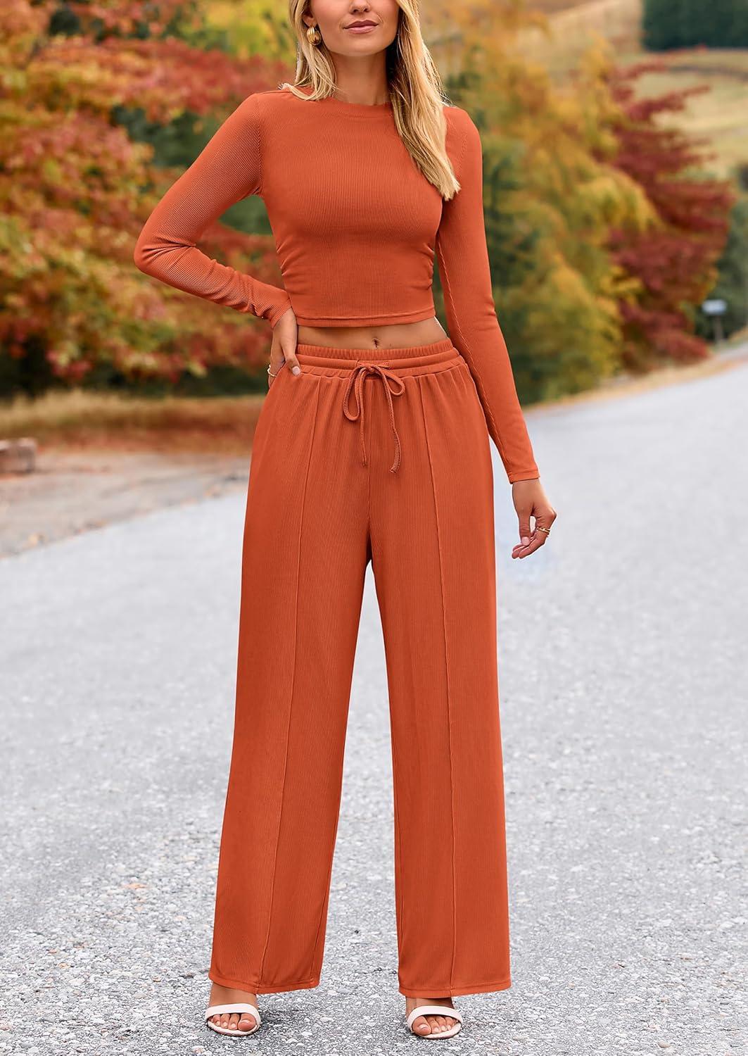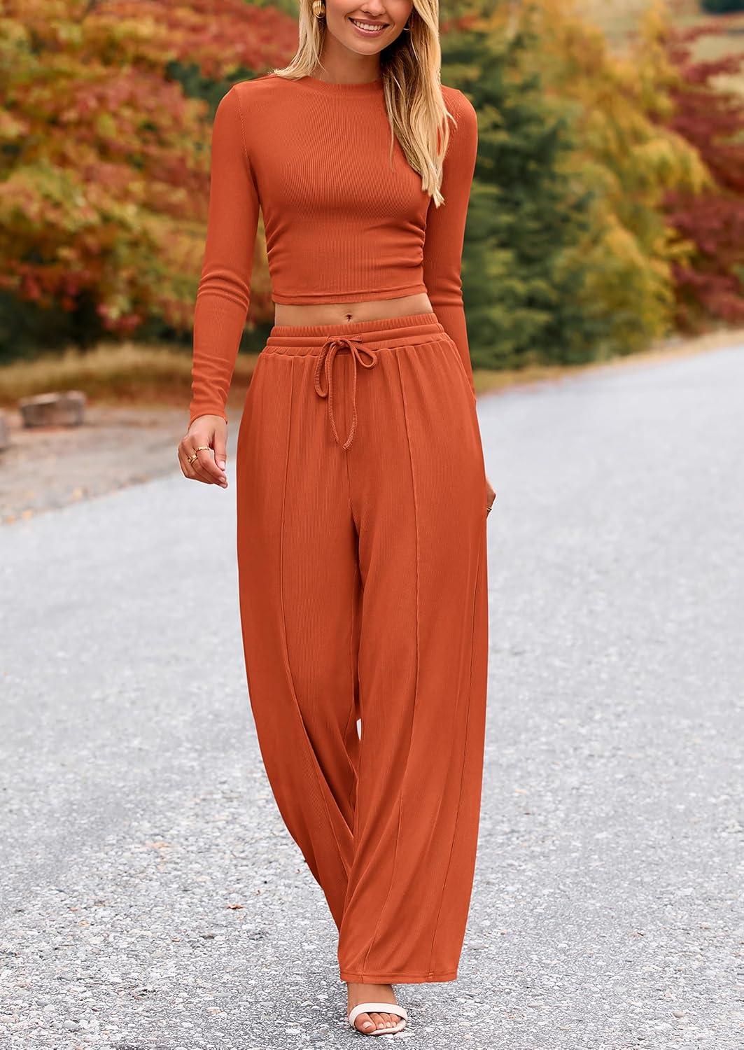 PRETTYGARDEN Women's 2 Piece Sets 2025 Fall Long Sleeve Crop Tops Wide Leg Pants Matching Outfit Tracksuits Fashion Clothing(Brick Red)