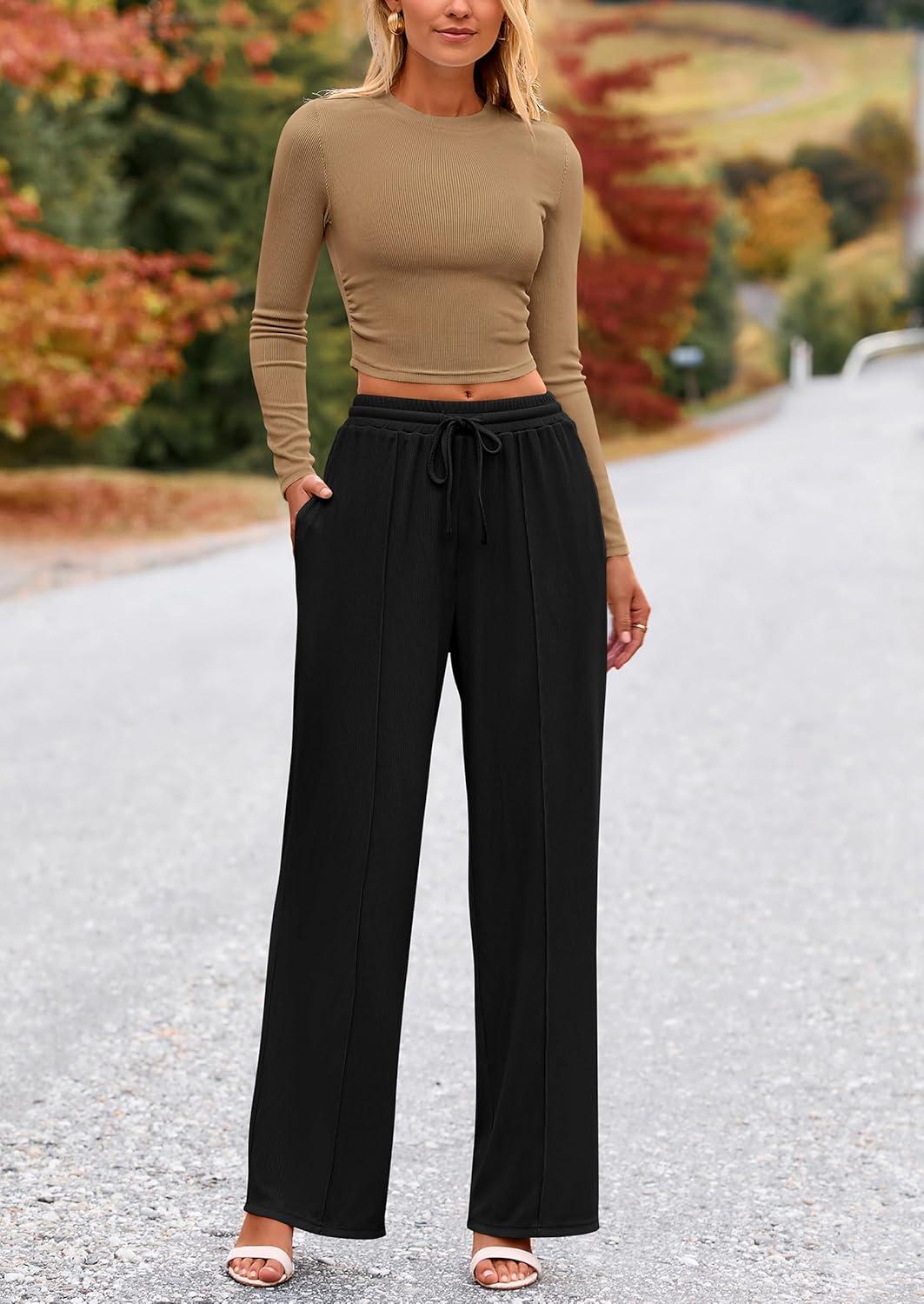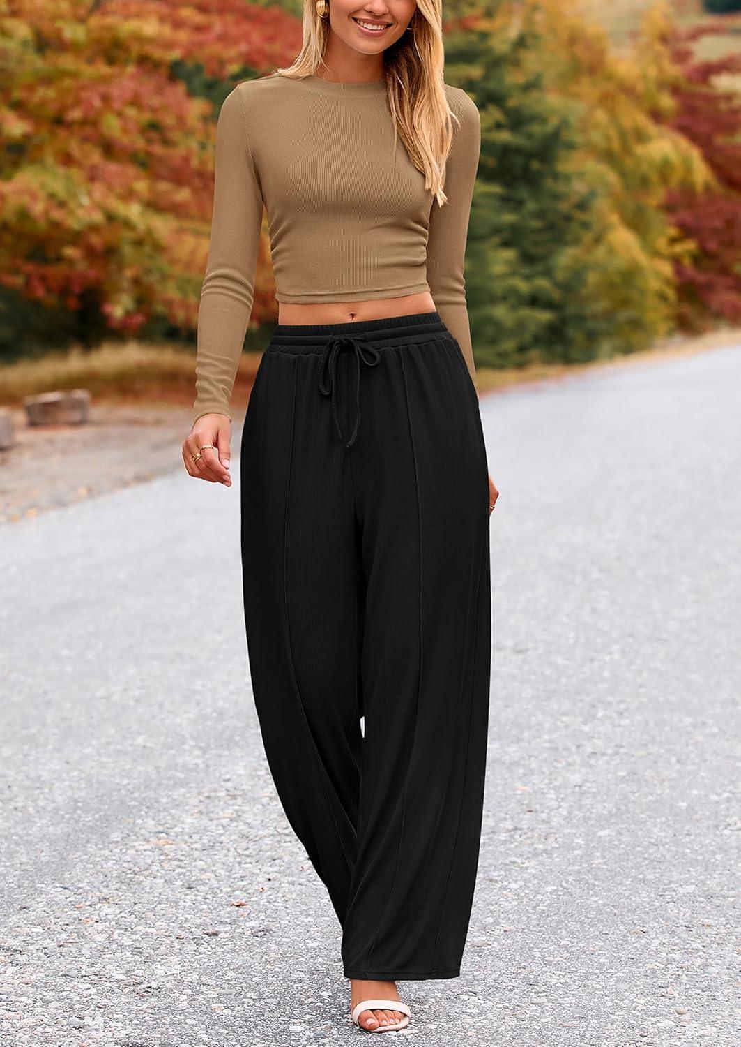 imagePRETTYGARDEN Womens 2 Piece Sets 2025 Fall Long Sleeve Crop Tops Wide Leg Pants Matching Outfit Tracksuits Fashion ClothingCamel Black