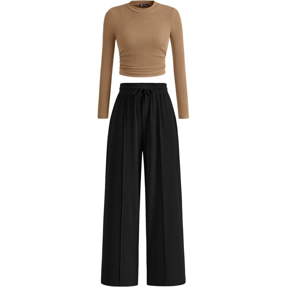 PRETTYGARDEN Women's 2 Piece Sets 2025 Fall Long Sleeve Crop Tops Wide Leg Pants Matching Outfit Tracksuits Fashion Clothing(Camel Black)