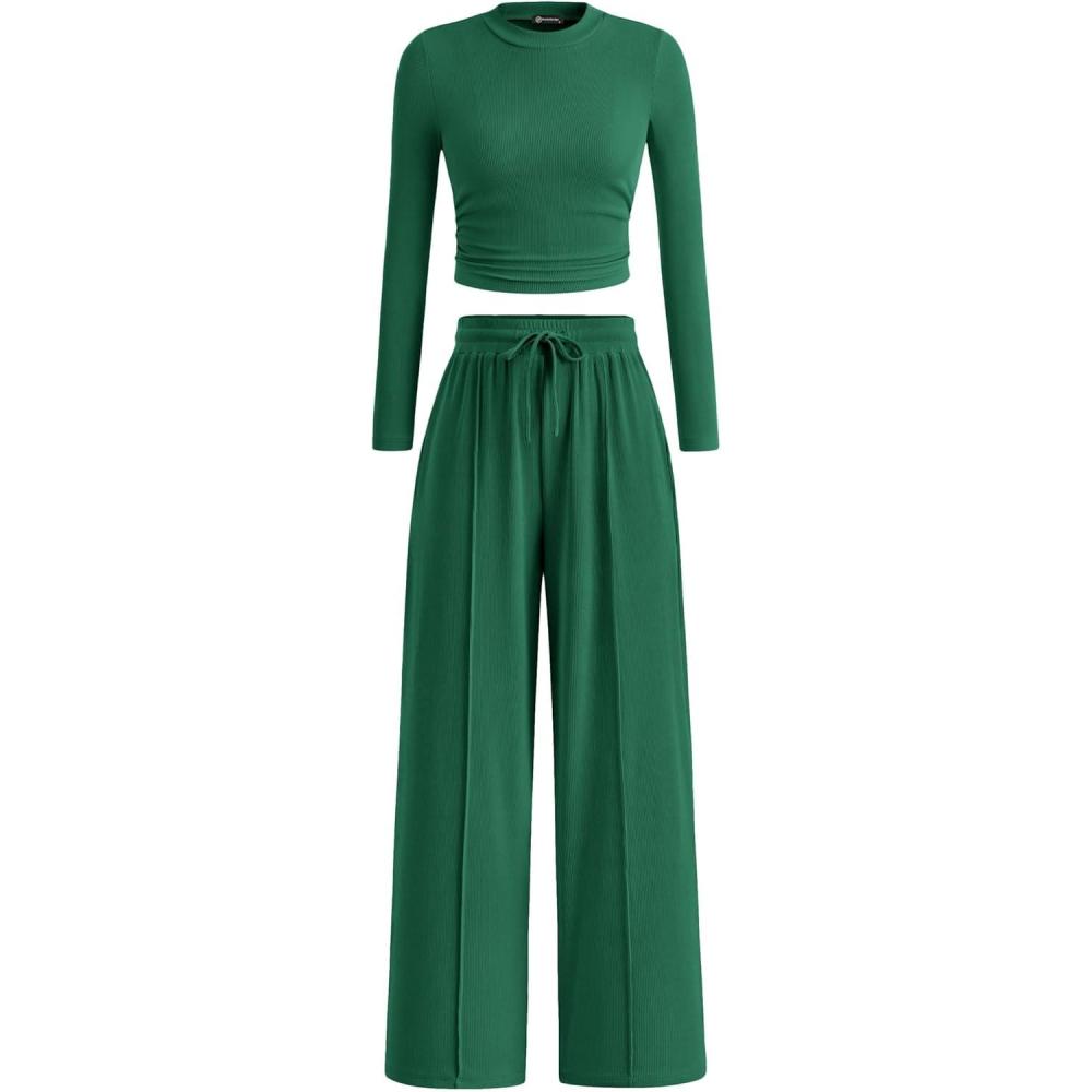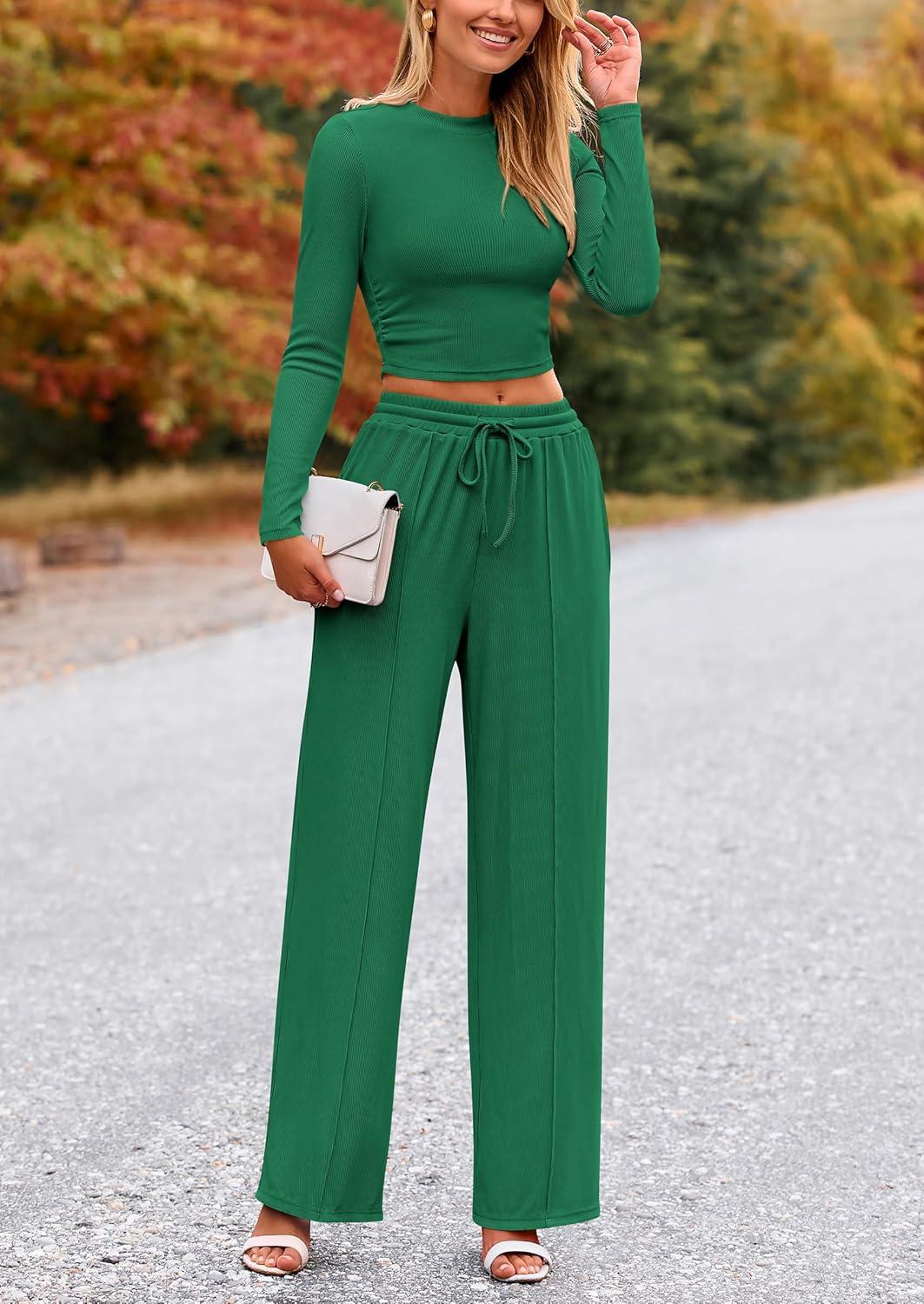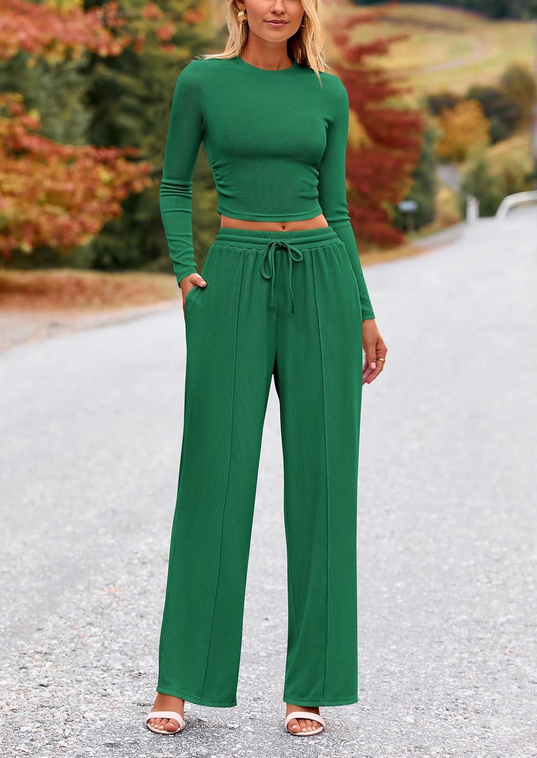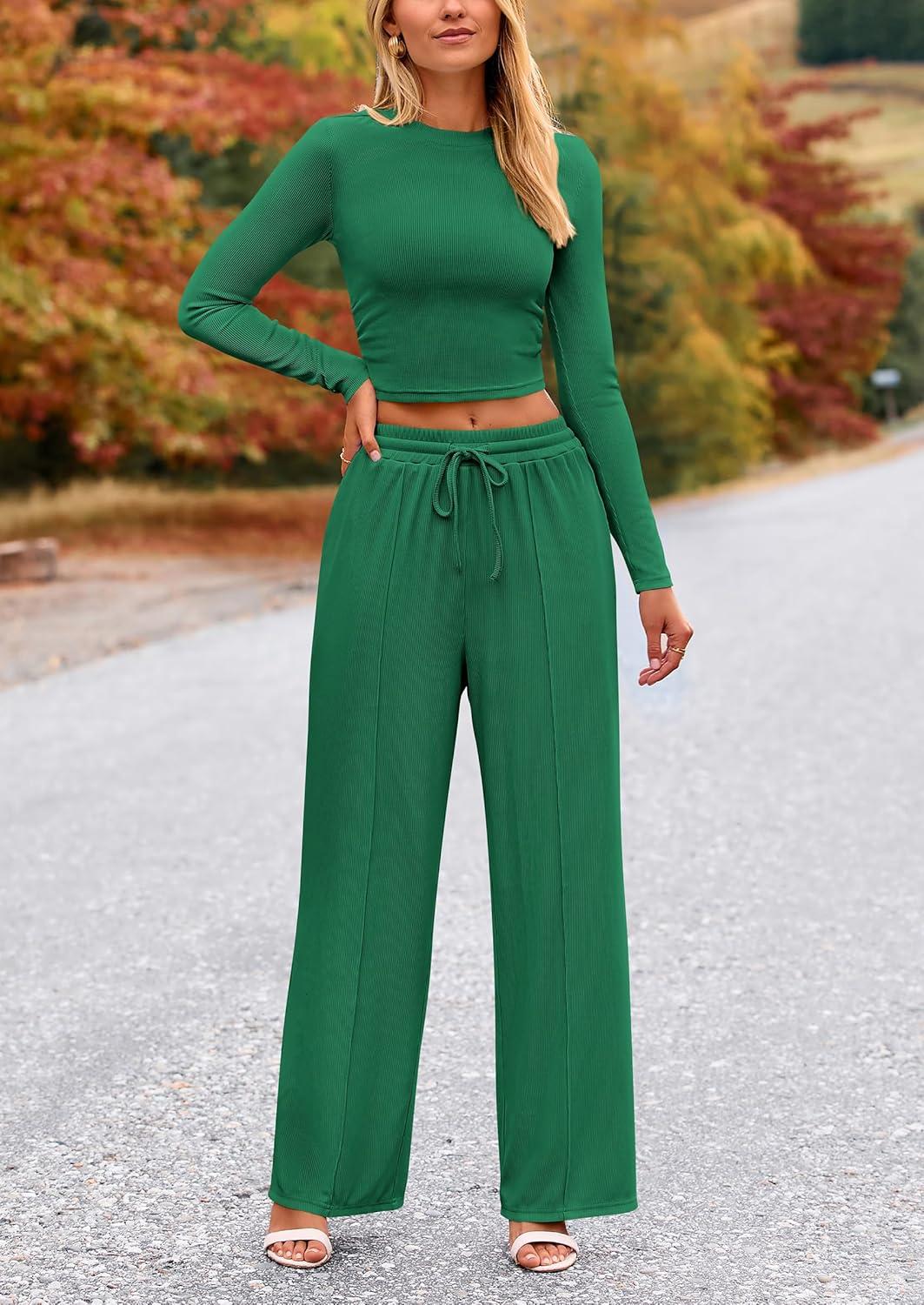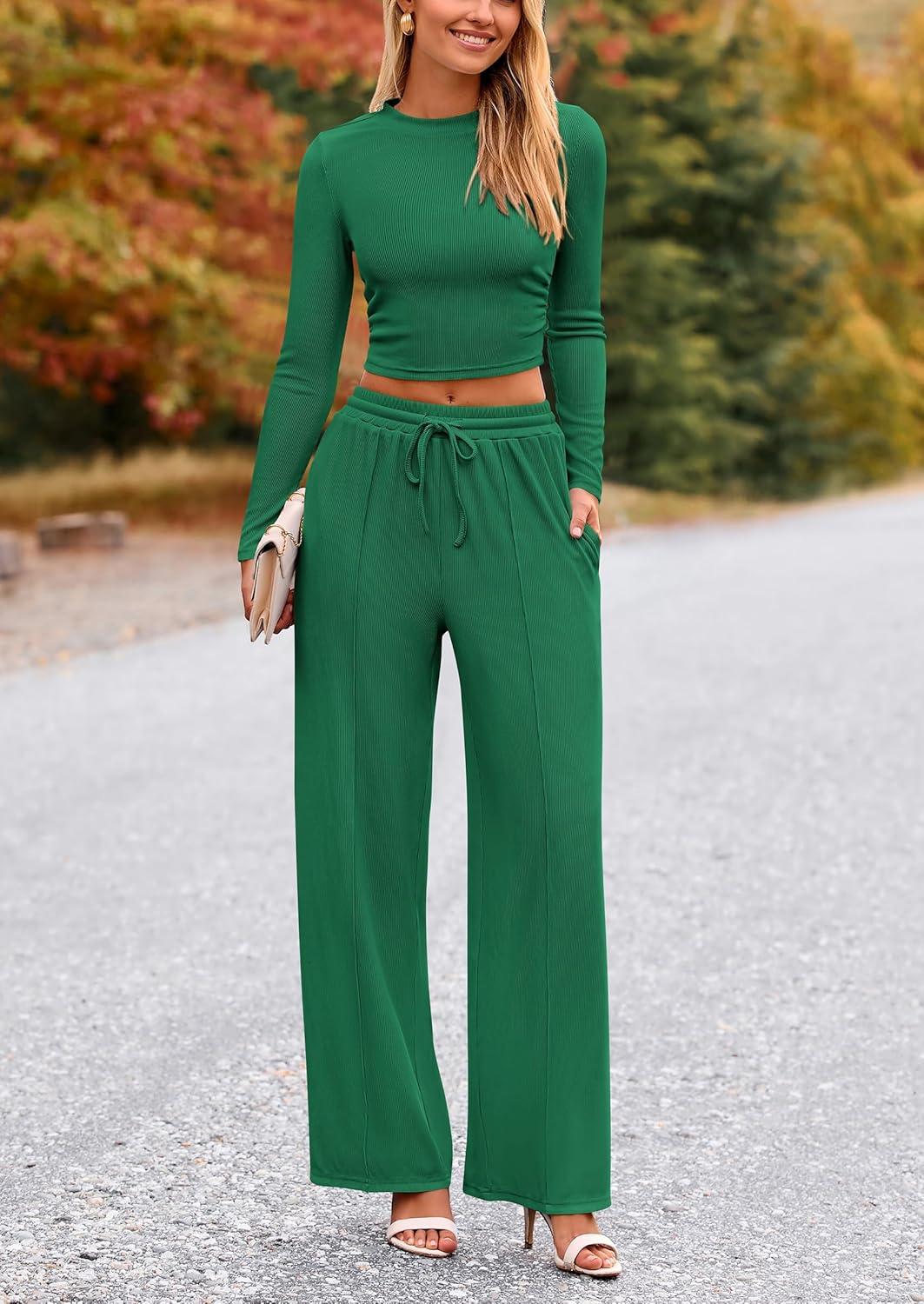 PRETTYGARDEN Women's 2 Piece Sets 2025 Fall Long Sleeve Crop Tops Wide Leg Pants Matching Outfit Tracksuits Fashion Clothing(Green)