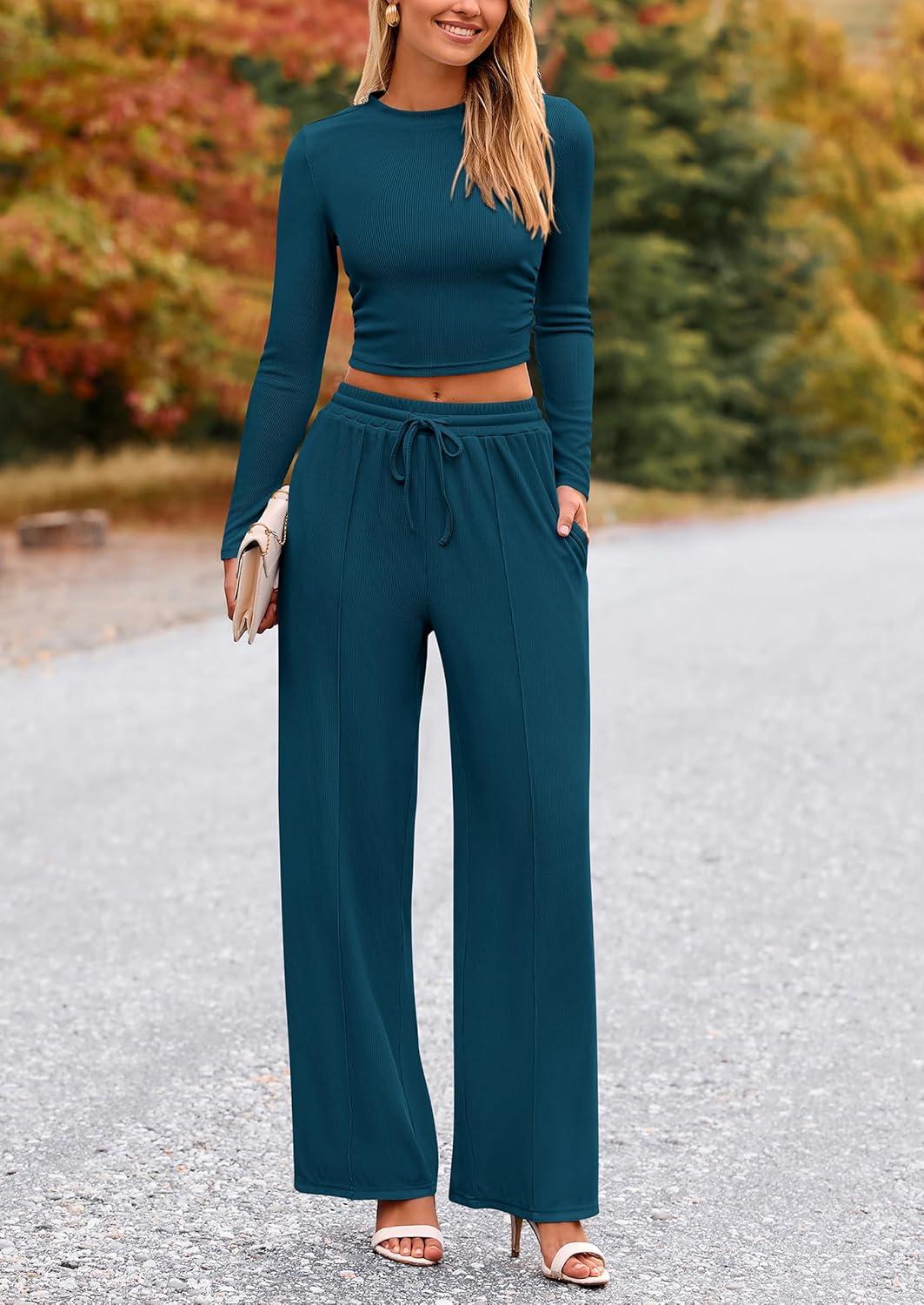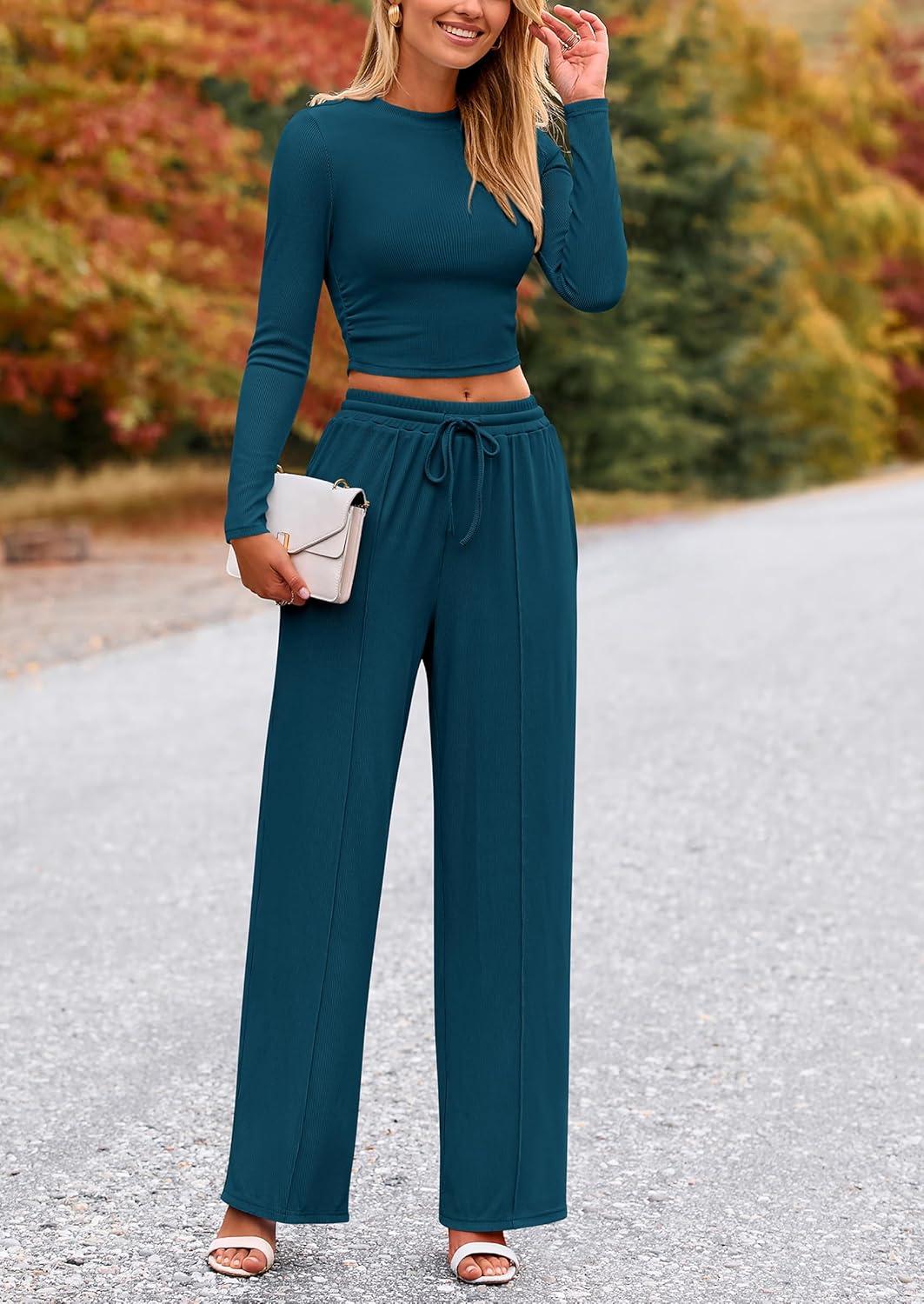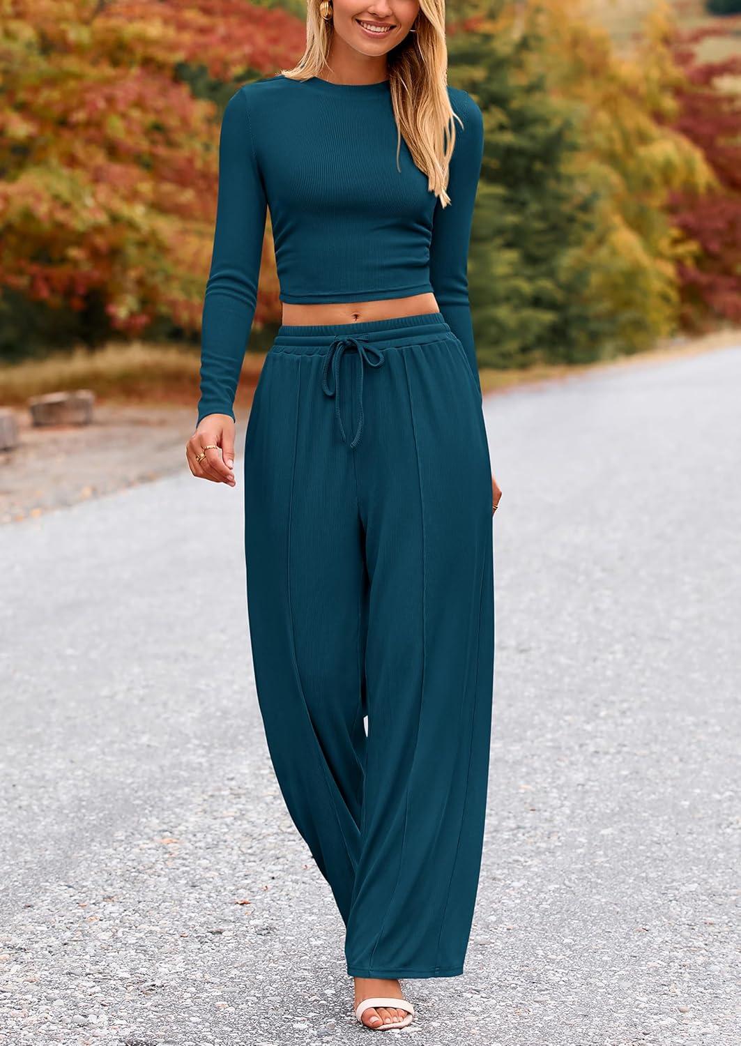 PRETTYGARDEN Women's 2 Piece Sets 2025 Fall Long Sleeve Crop Tops Wide Leg Pants Matching Outfit Tracksuits Fashion Clothing(Lake Blue)