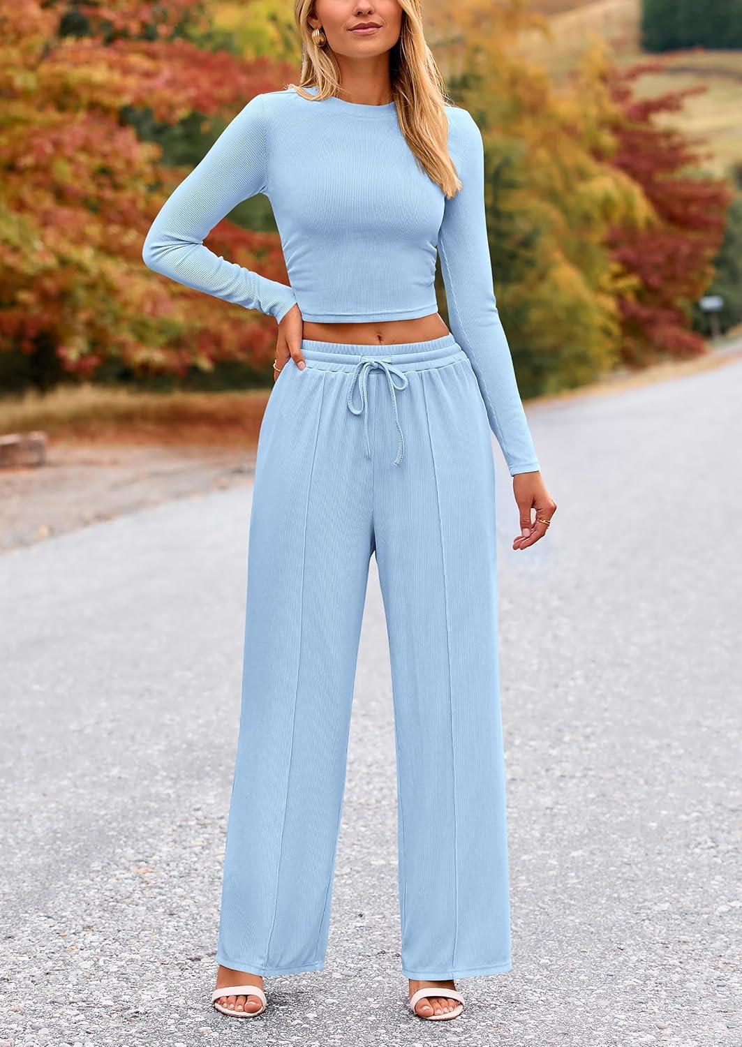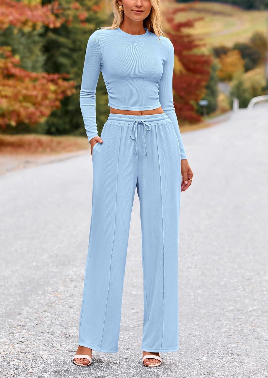 PRETTYGARDEN Women’s 2 Piece Sets 2025 Fall Long Sleeve Crop Tops Wide Leg Pants Matching Outfit Tracksuits Fashion Clothing(Light Blue)