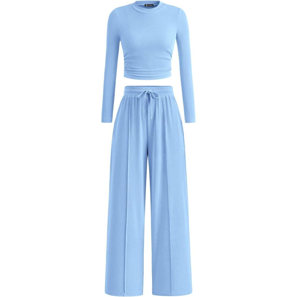 PRETTYGARDEN Women's 2 Piece Sets 2025 Fall Long Sleeve Crop Tops Wide Leg Pants Matching Outfit Tracksuits Fashion Clothing(Light Blue)