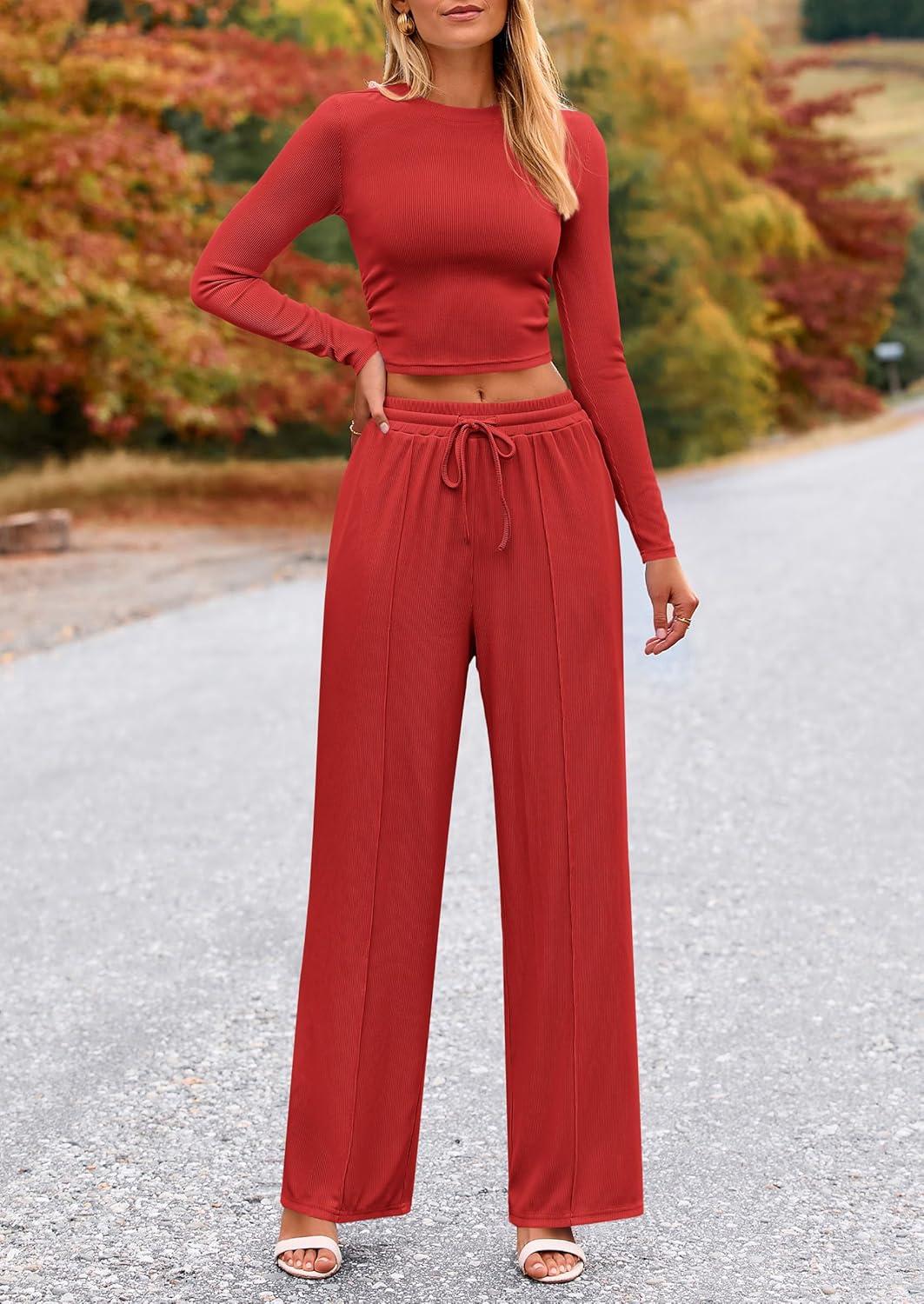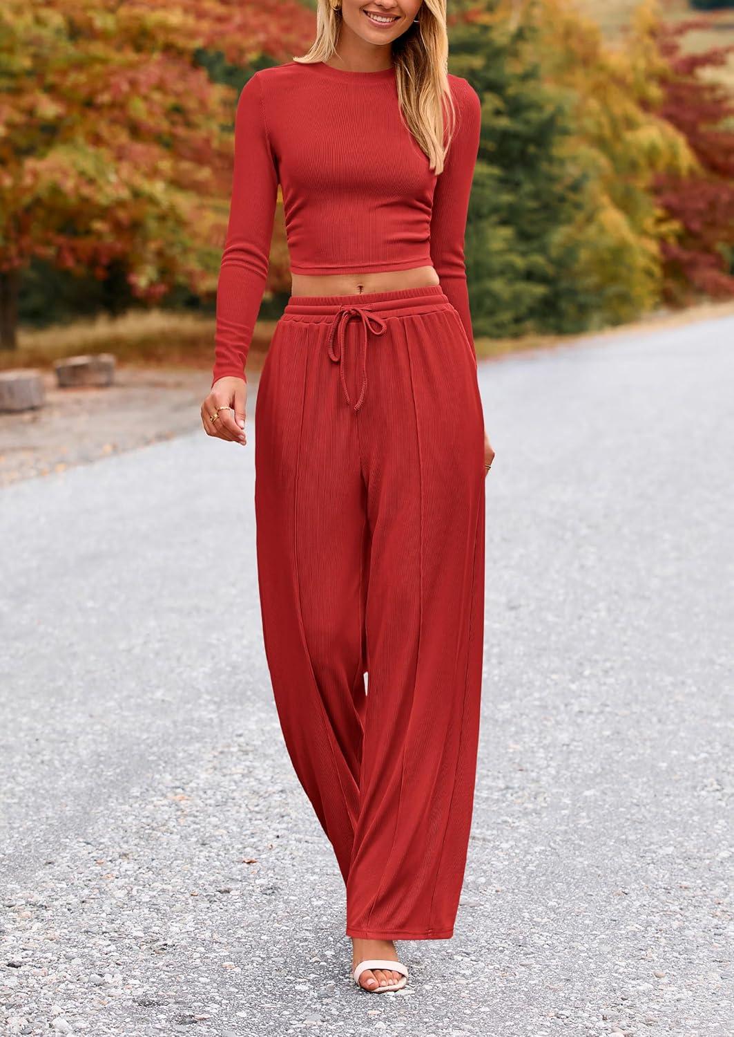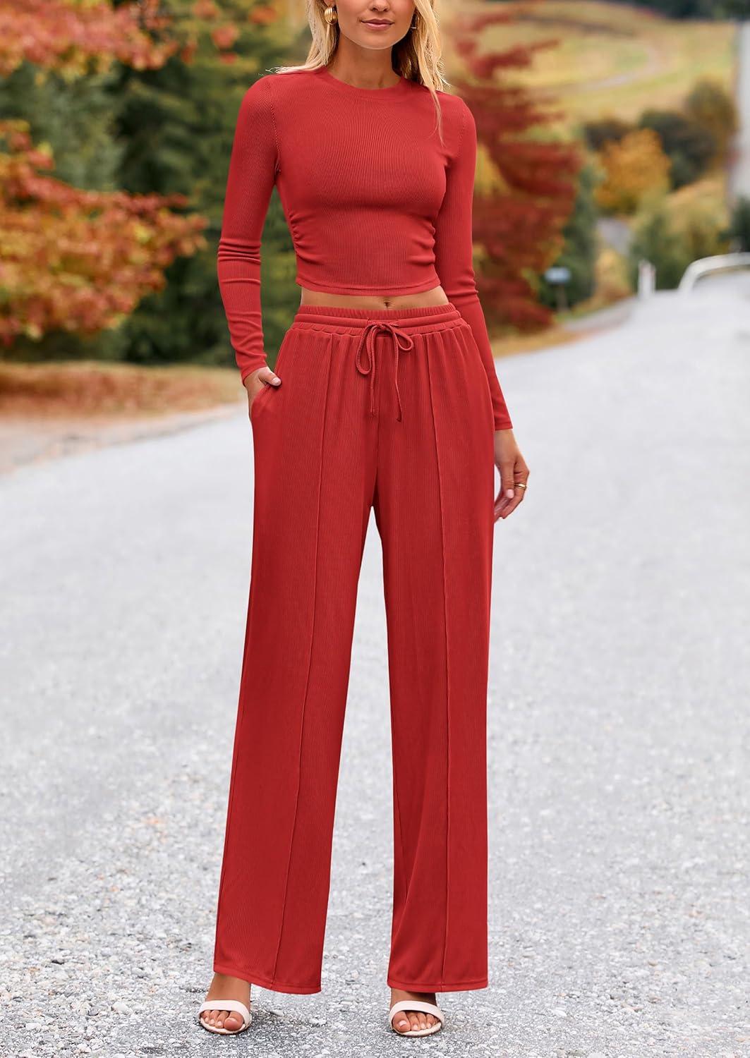 PRETTYGARDEN Women's 2 Piece Sets 2025 Fall Long Sleeve Crop Tops Wide Leg Pants Matching Outfit Tracksuits Fashion Clothing(Red)
