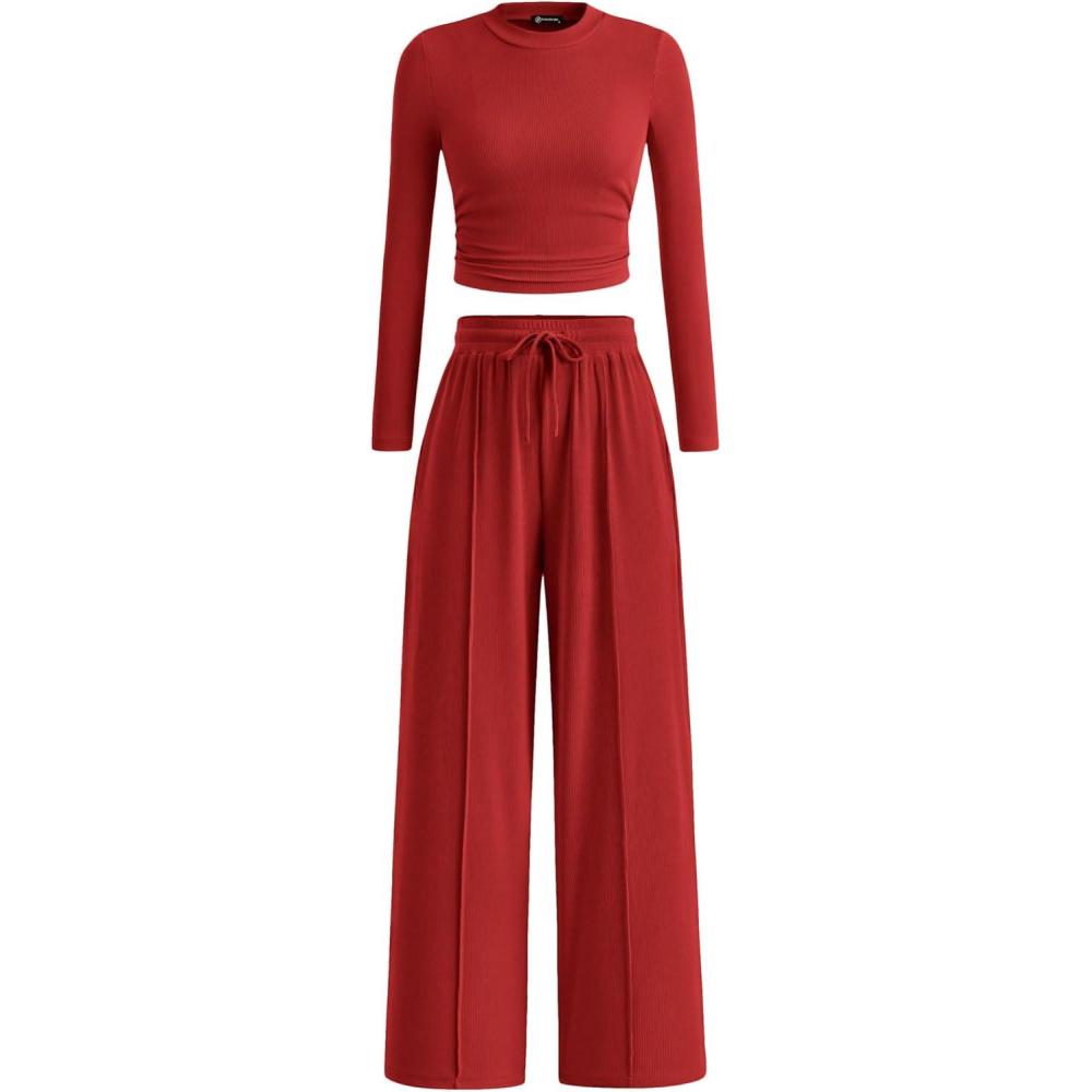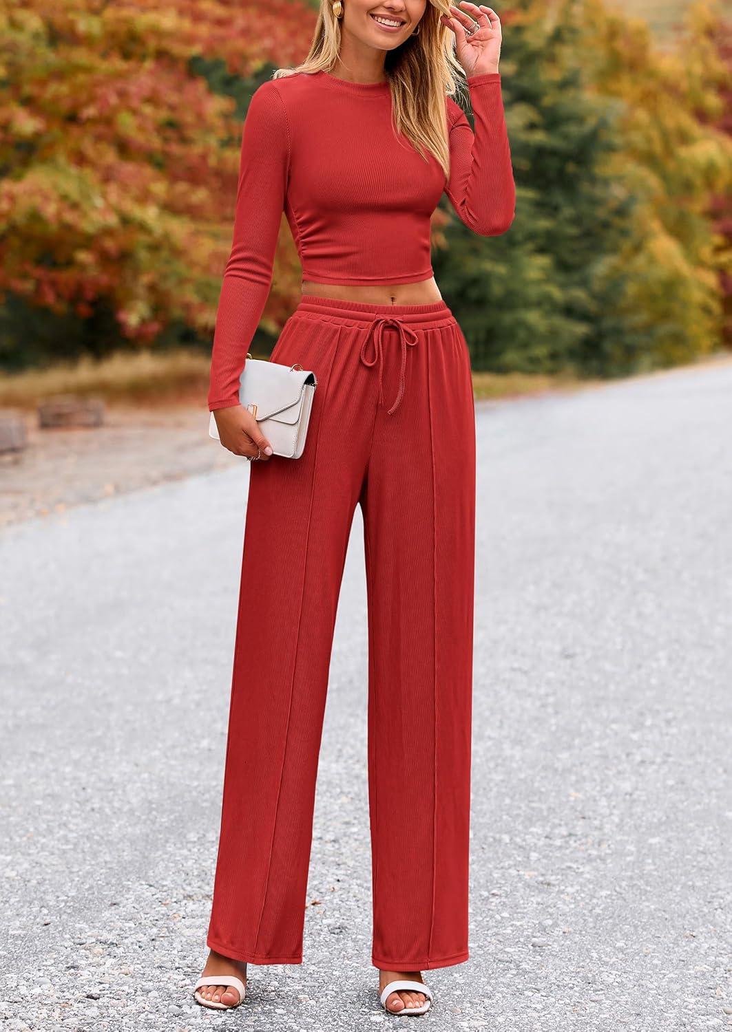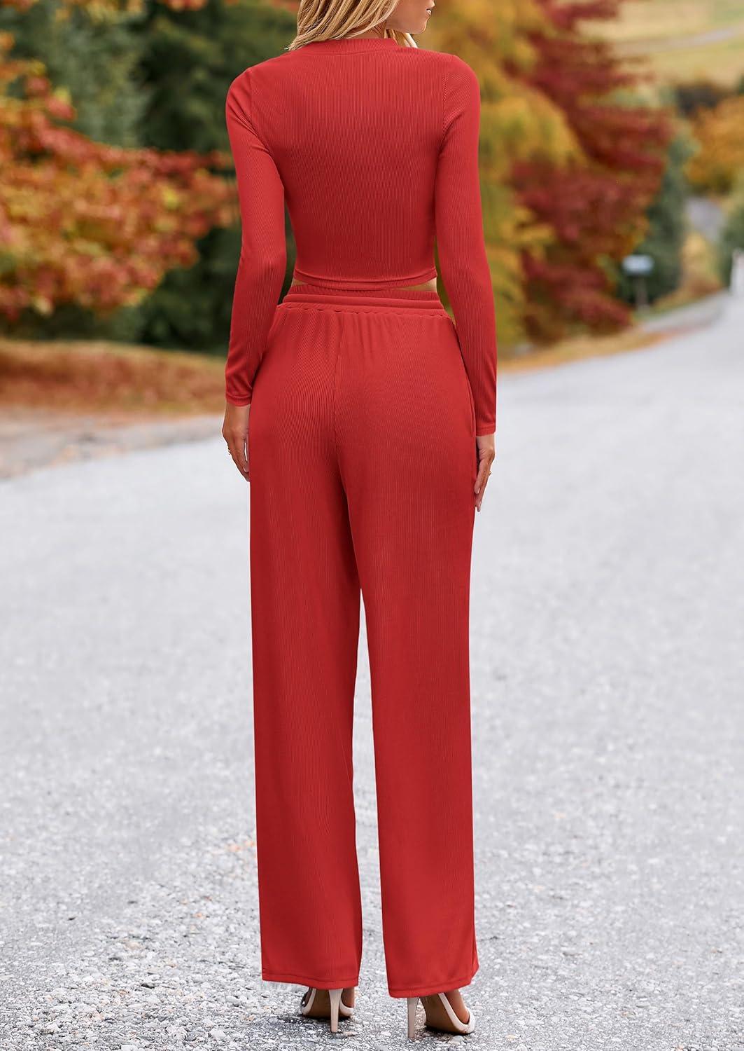 PRETTYGARDEN Women's 2 Piece Sets 2025 Fall Long Sleeve Crop Tops Wide Leg Pants Matching Outfit Tracksuits Fashion Clothing(Red)