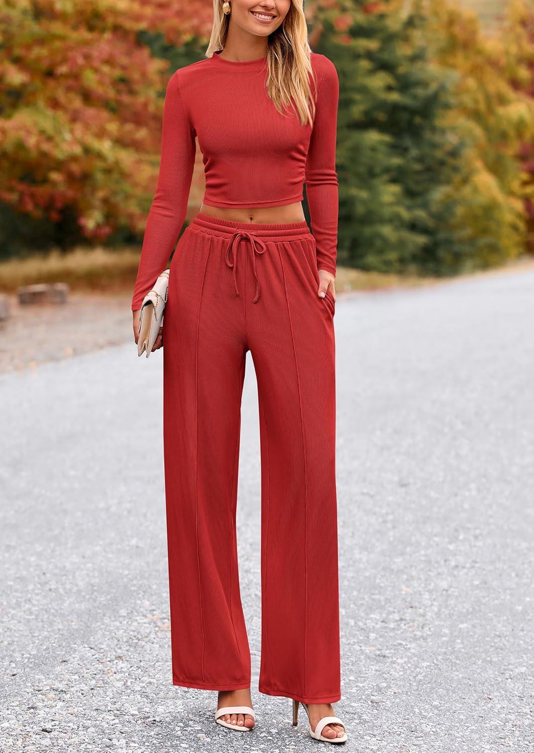PRETTYGARDEN Women’s 2 Piece Sets 2025 Fall Long Sleeve Crop Tops Wide Leg Pants Matching Outfit Tracksuits Fashion Clothing(Red)