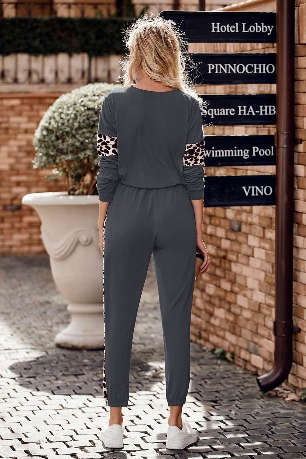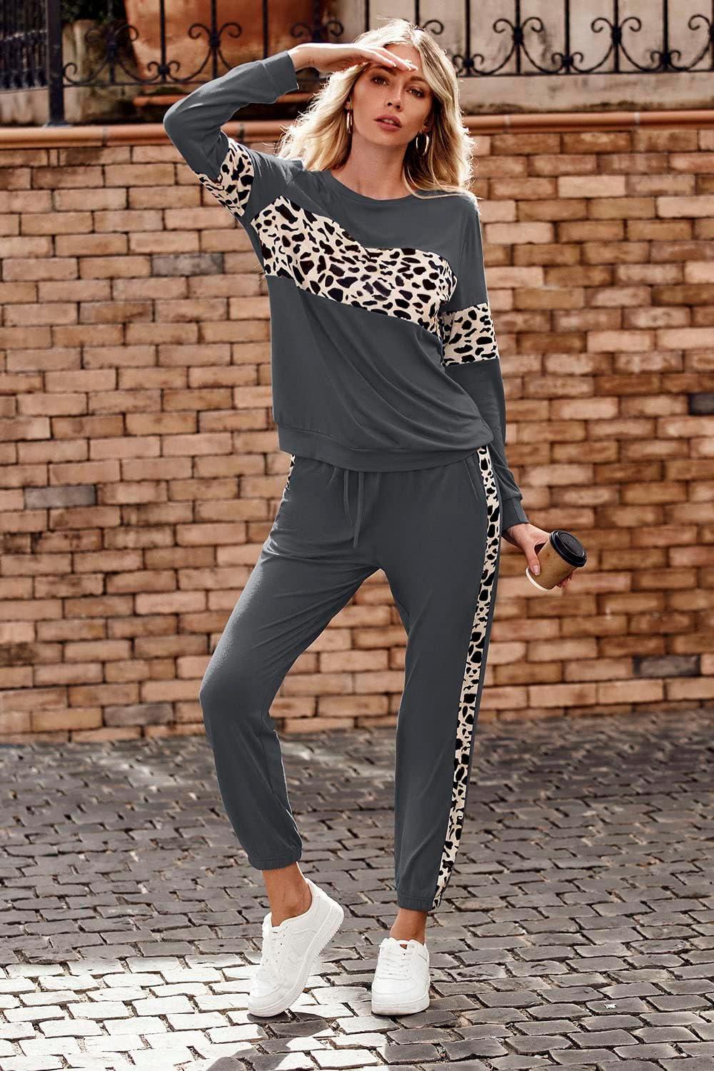 PRETTYGARDEN Womens 2 Piece Sets 2025 Long Sleeve Tops High Waisted Sweatpants Lounge Set Fall Fashion Travel Outfits(Leopard Dark Grey)
