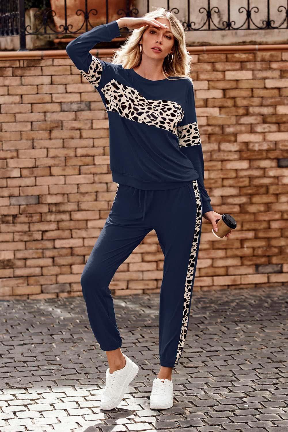 imagePRETTYGARDEN Womens 2 Piece Sets 2025 Long Sleeve Tops High Waisted Sweatpants Lounge Set Fall Fashion Travel OutfitsLeopard Navy