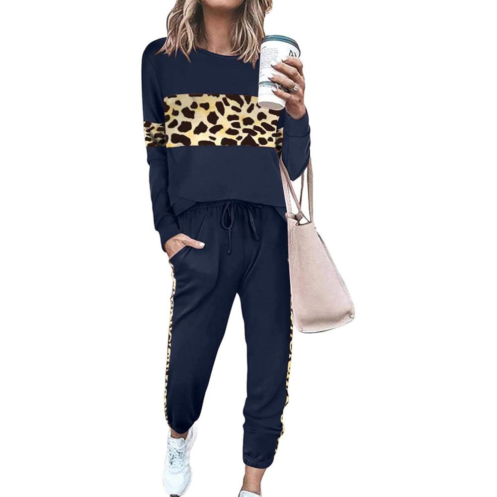 PRETTYGARDEN Womens 2 Piece Sets 2025 Long Sleeve Tops High Waisted Sweatpants Lounge Set Fall Fashion Travel Outfits(Leopard Navy)