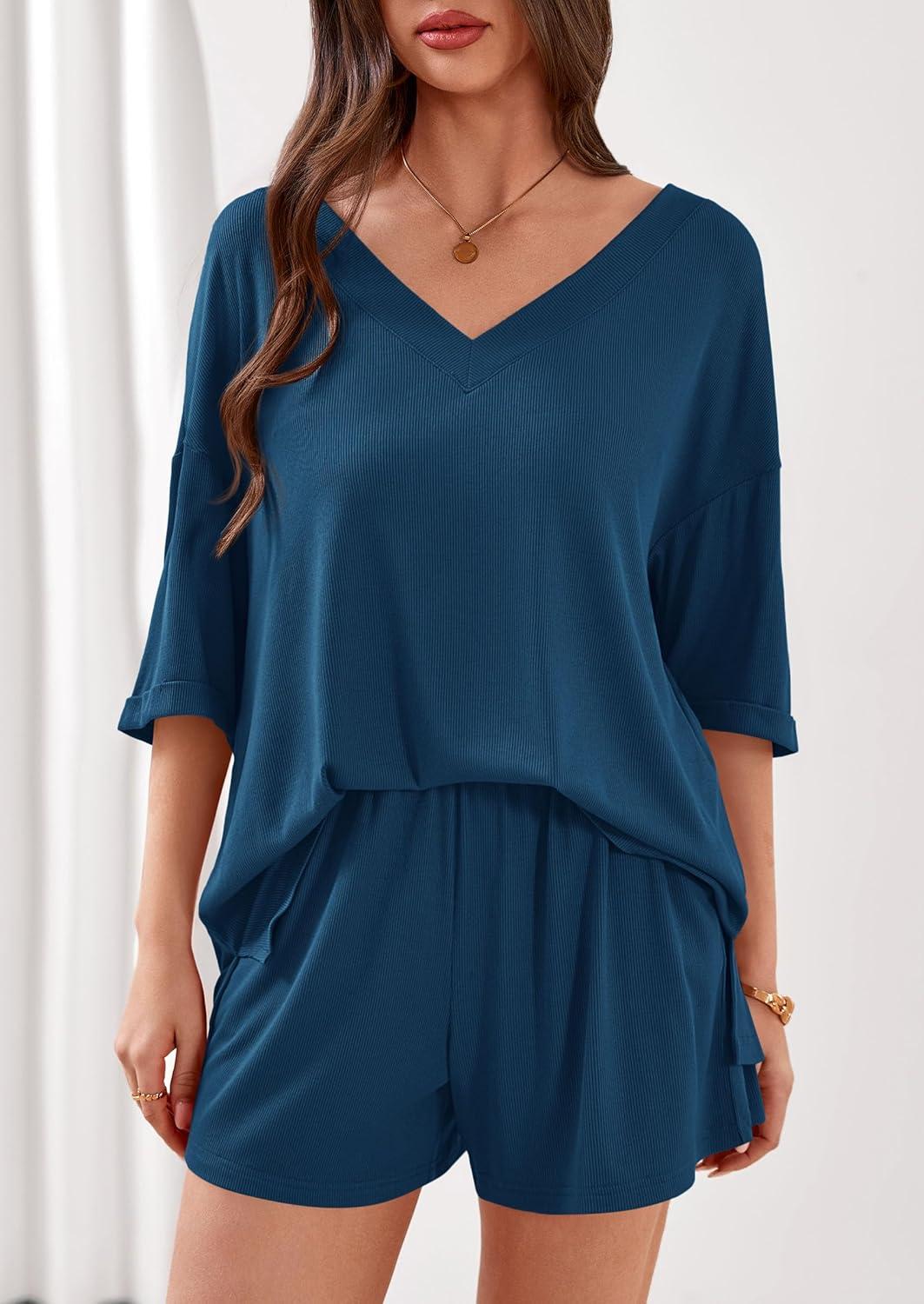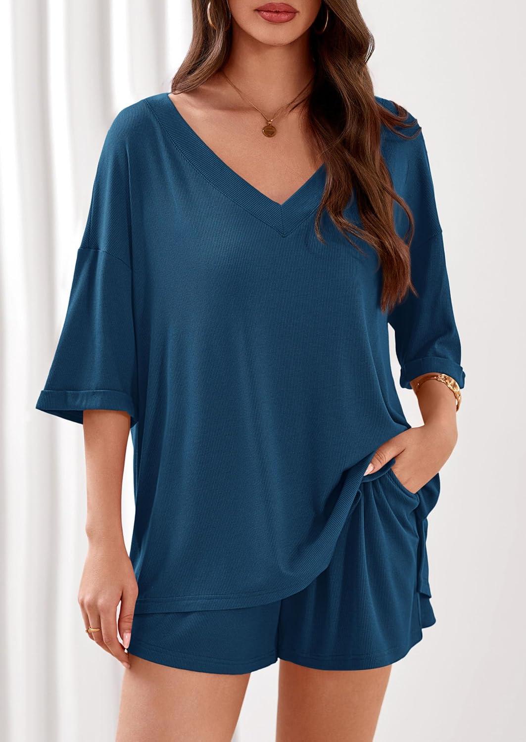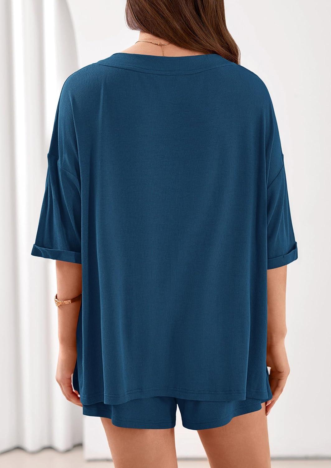 imagePRETTYGARDEN Womens 2 Piece Sets 2026 Oversized Vneck Half Sleeve Tops Shorts Lounge Set Casual Summer Travel Beach OutfitsDark Blue