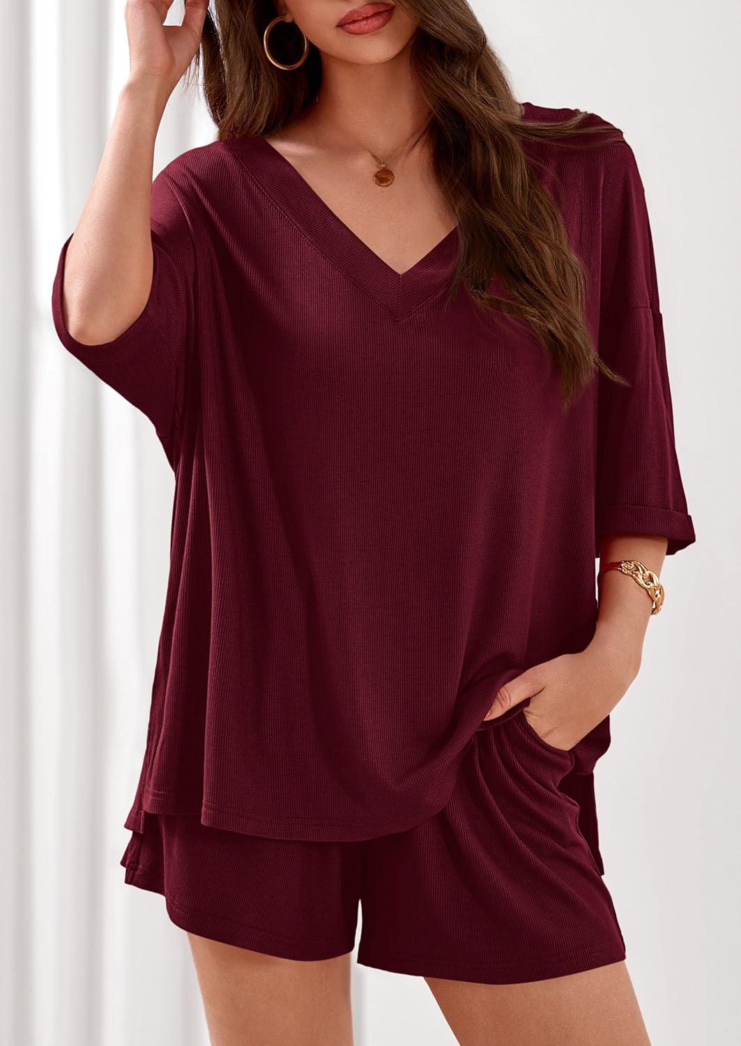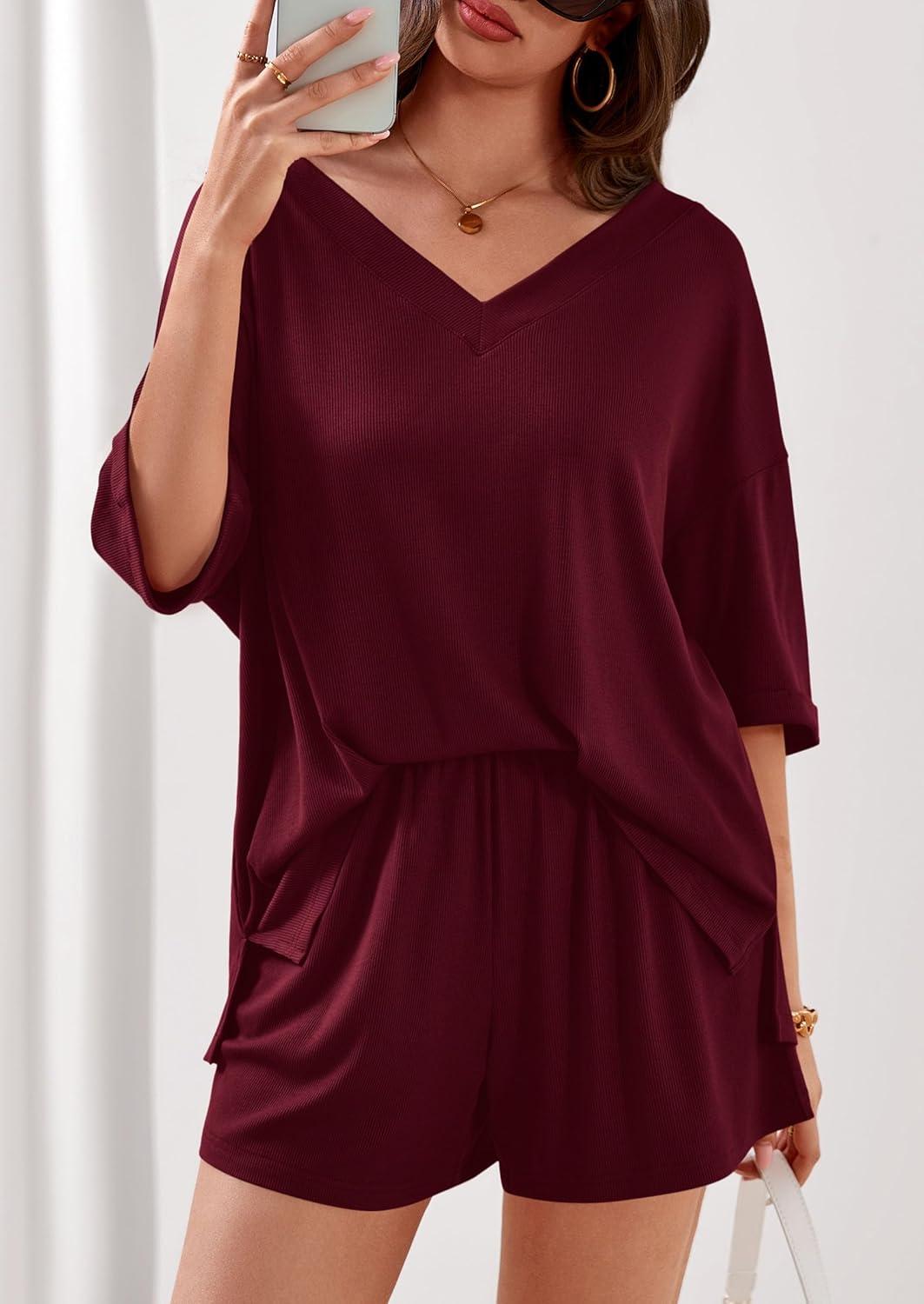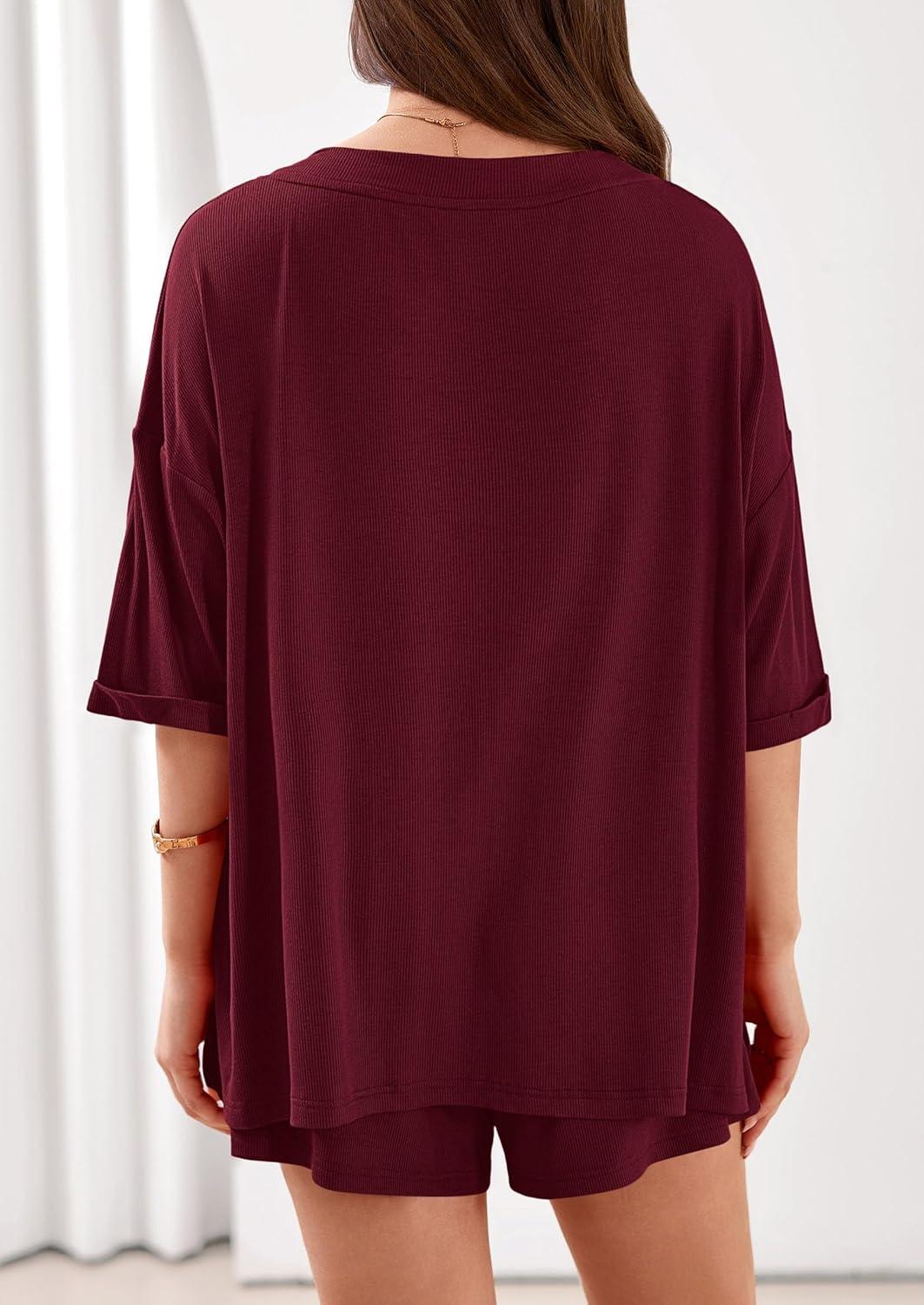 PRETTYGARDEN Womens 2 Piece Sets 2026 Oversized Vneck Half Sleeve Tops Shorts Lounge Set Casual Summer Travel Beach Outfits(Wine Red)
