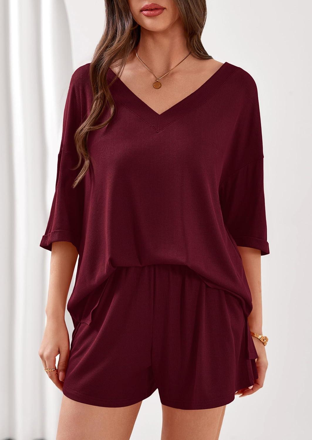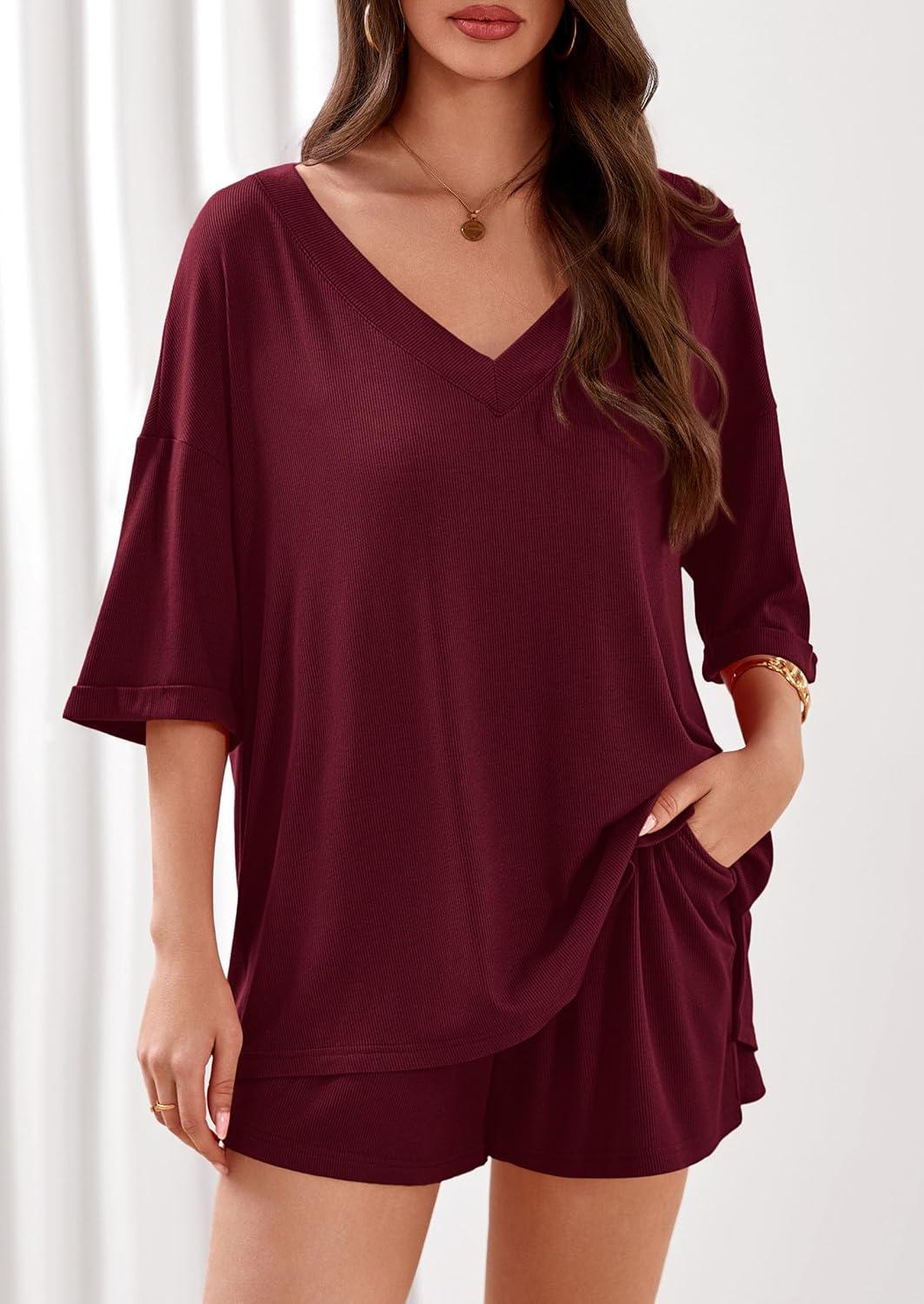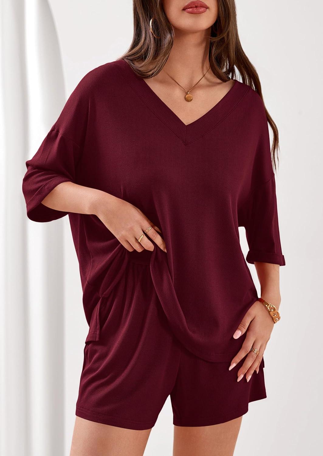 PRETTYGARDEN Womens 2 Piece Sets 2026 Oversized Vneck Half Sleeve Tops Shorts Lounge Set Casual Summer Travel Beach Outfits(Wine Red)