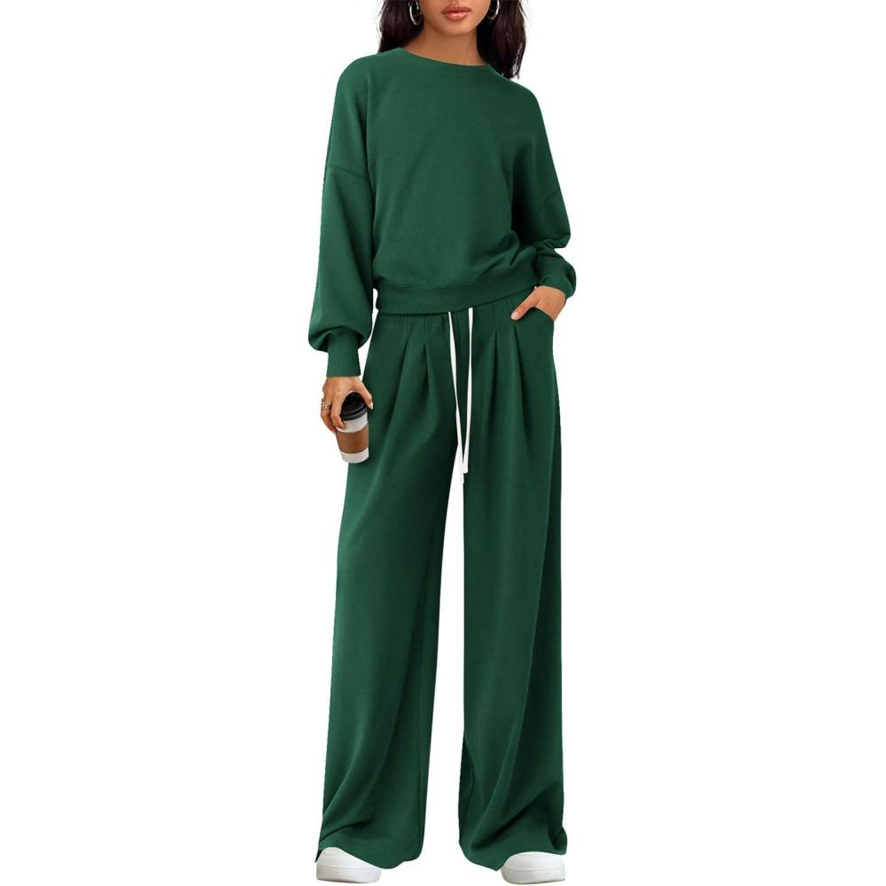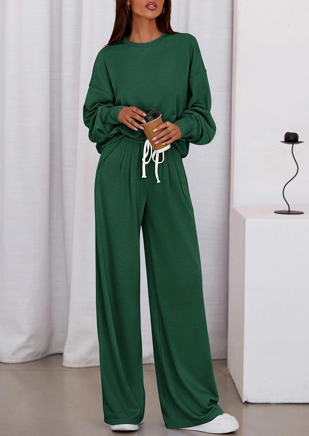 PRETTYGARDEN Womens 2 Piece Sets Long Sleeve Sweatshirt Wide Leg Pants Loose Matching Lounge Set Trendy Fall Outfits(Dark Green)