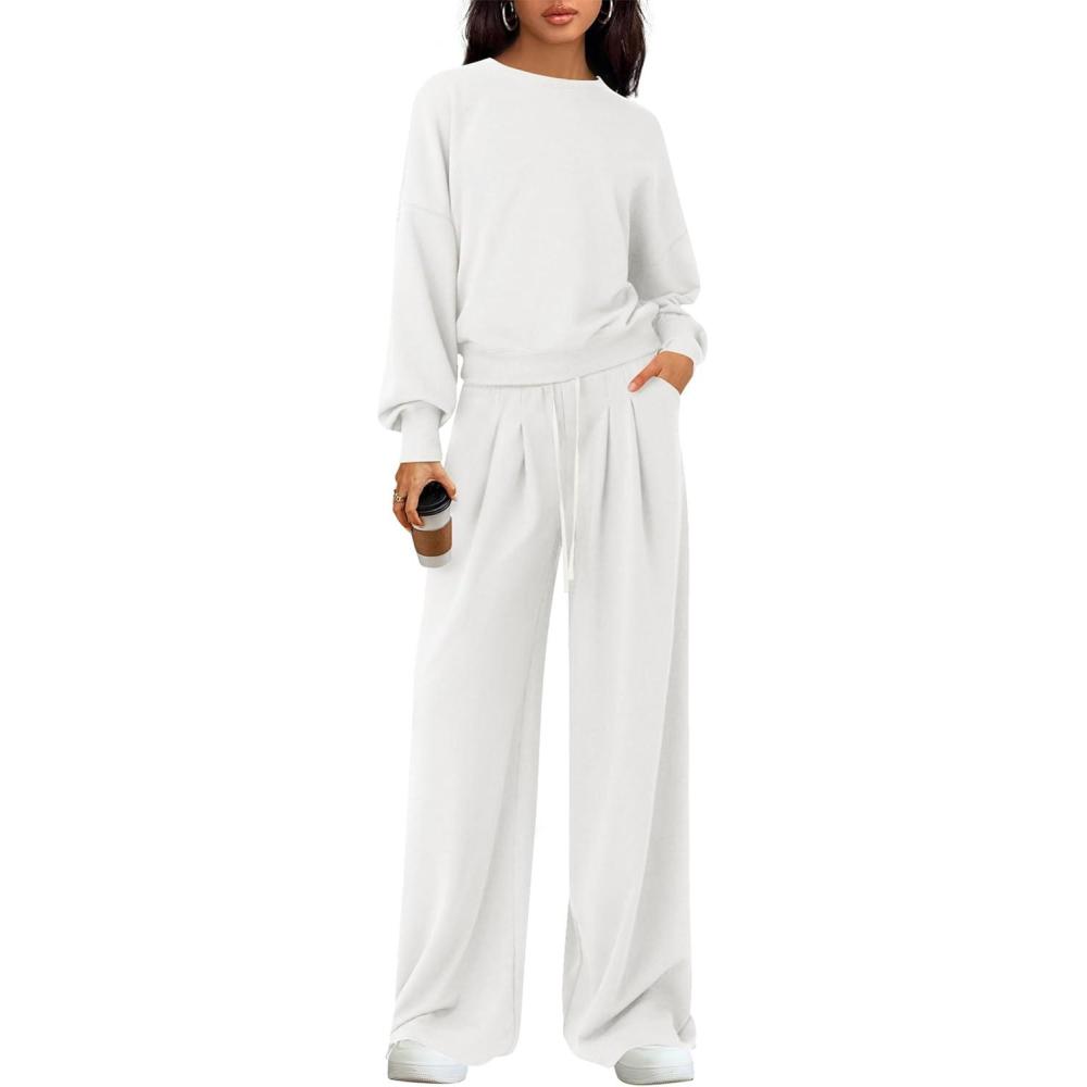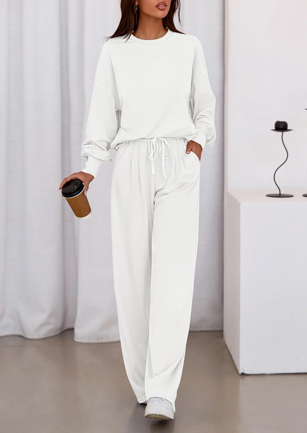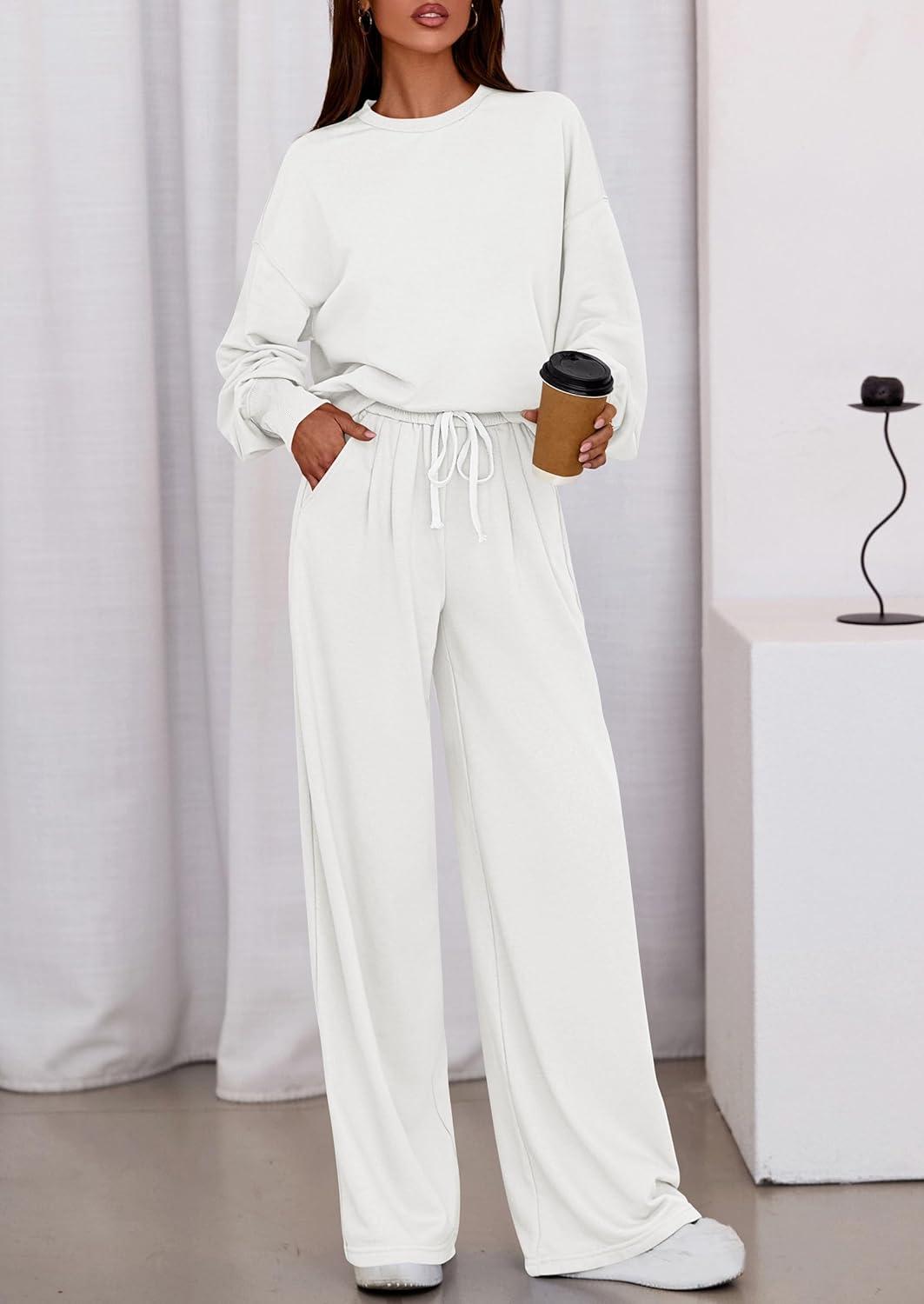PRETTYGARDEN Womens 2 Piece Sets Long Sleeve Sweatshirt Wide Leg Pants Loose Matching Lounge Set Trendy Fall Outfits(White)