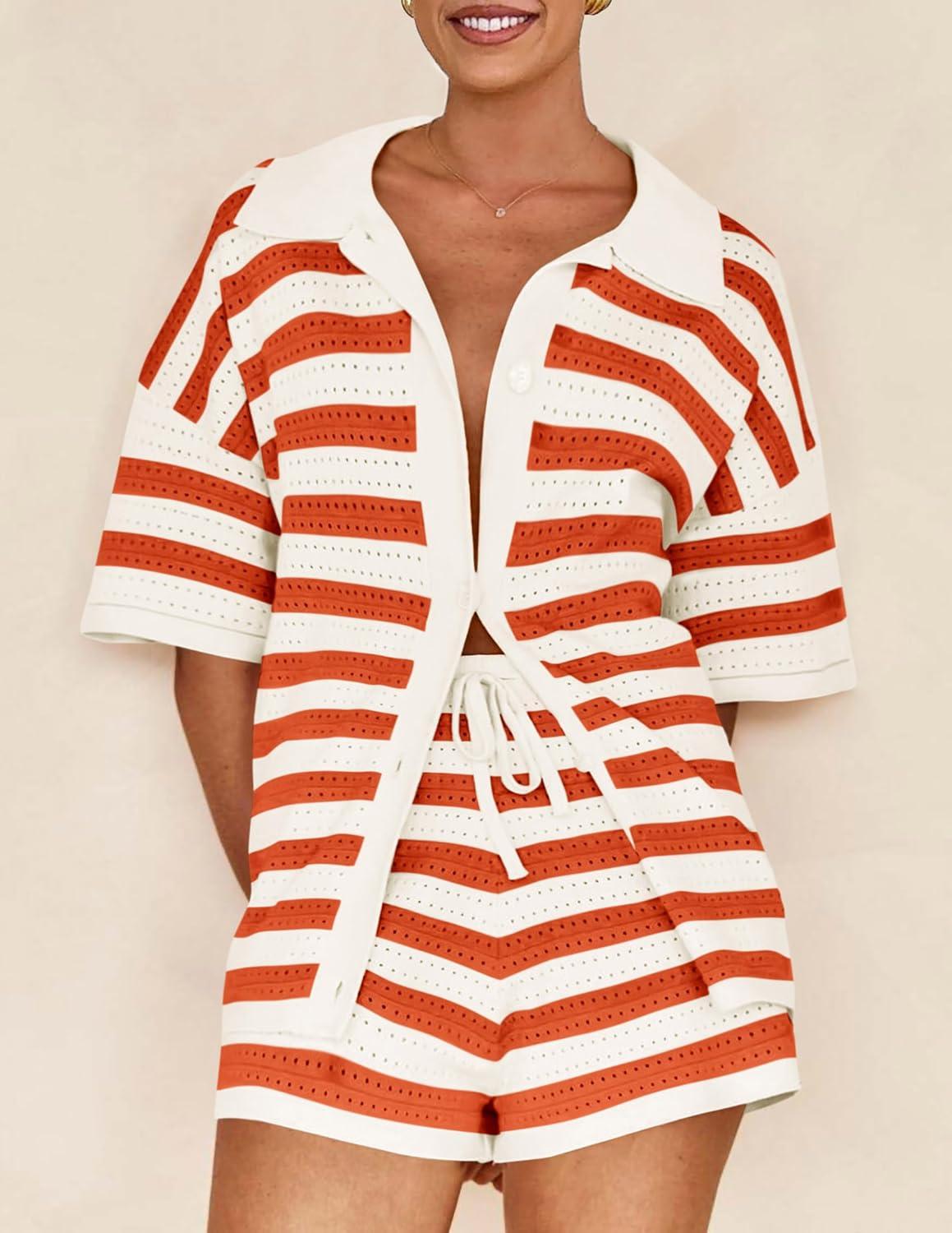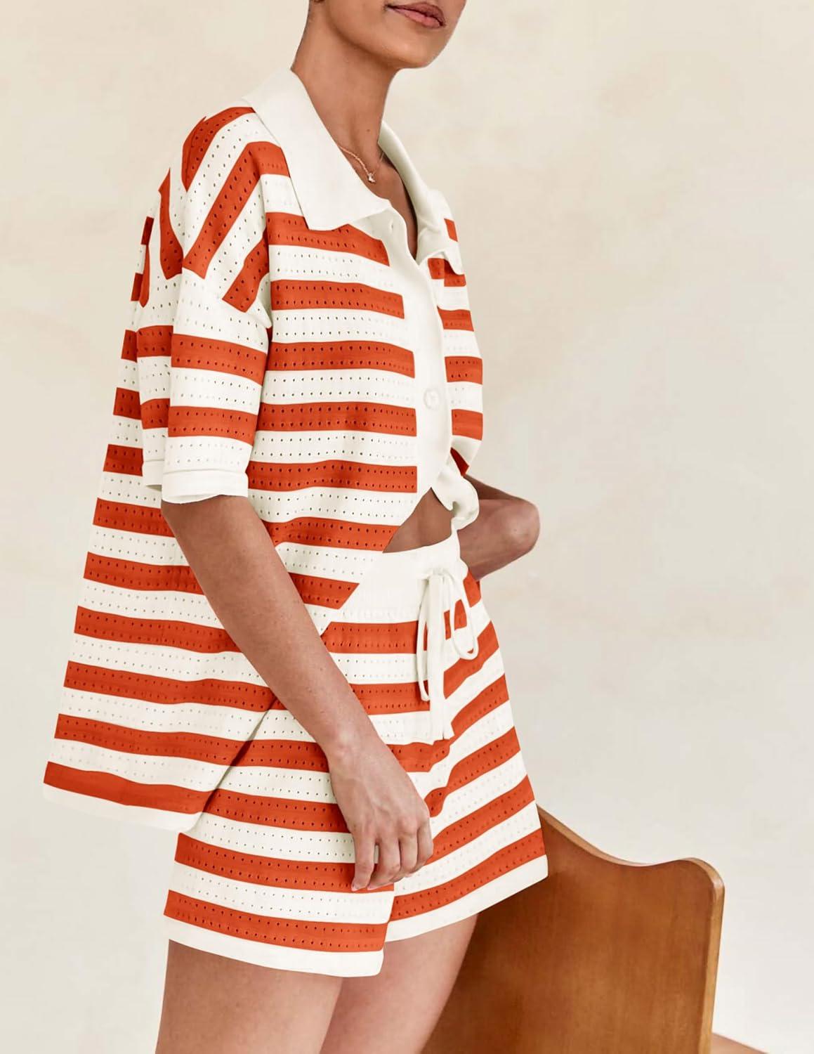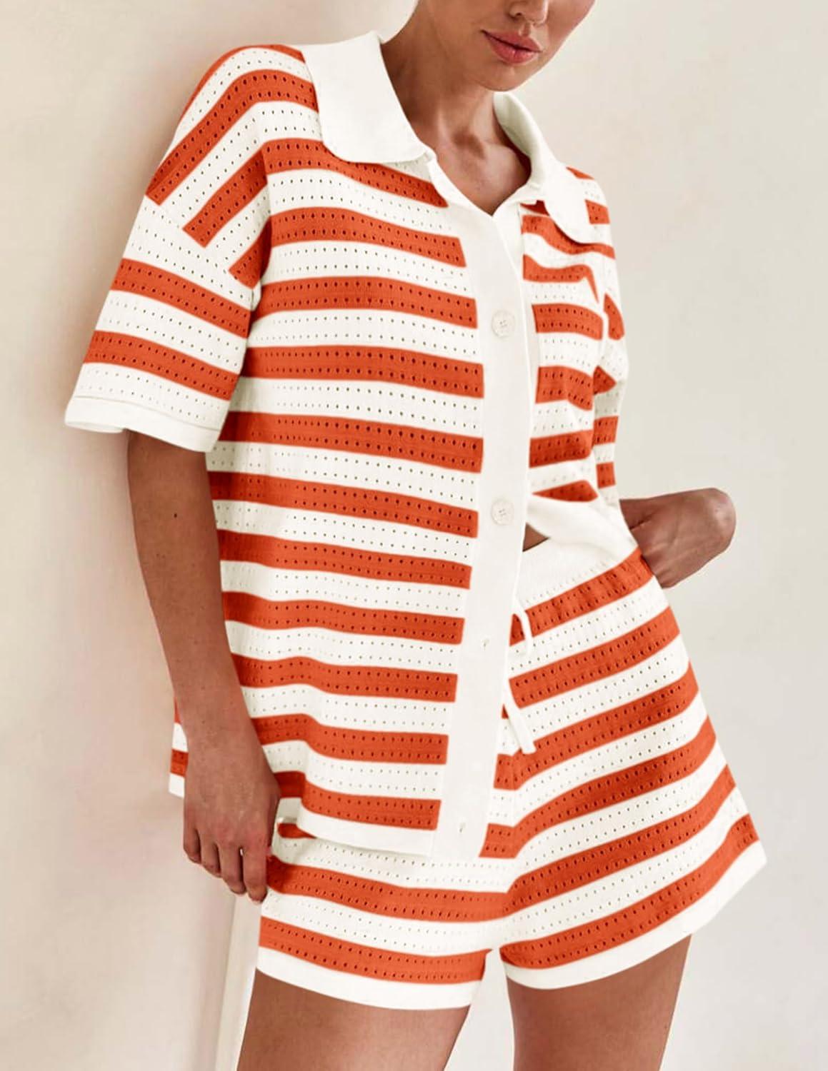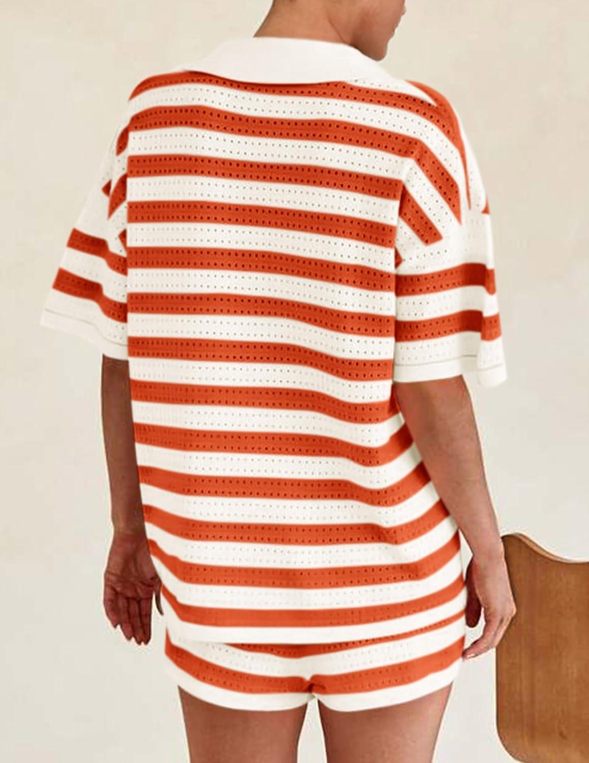 PRETTYGARDEN Women’s 2 Piece Shorts Sets Casual Summer 2025 Short Sleeve Striped Sweater Set Matching Beach Vacation Outfit(Orange)