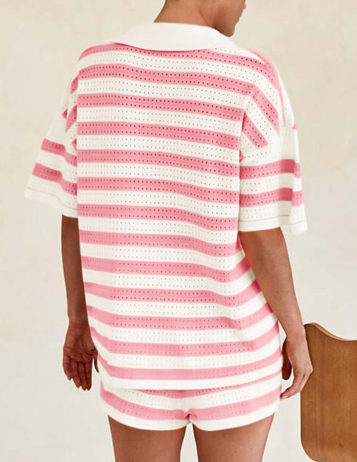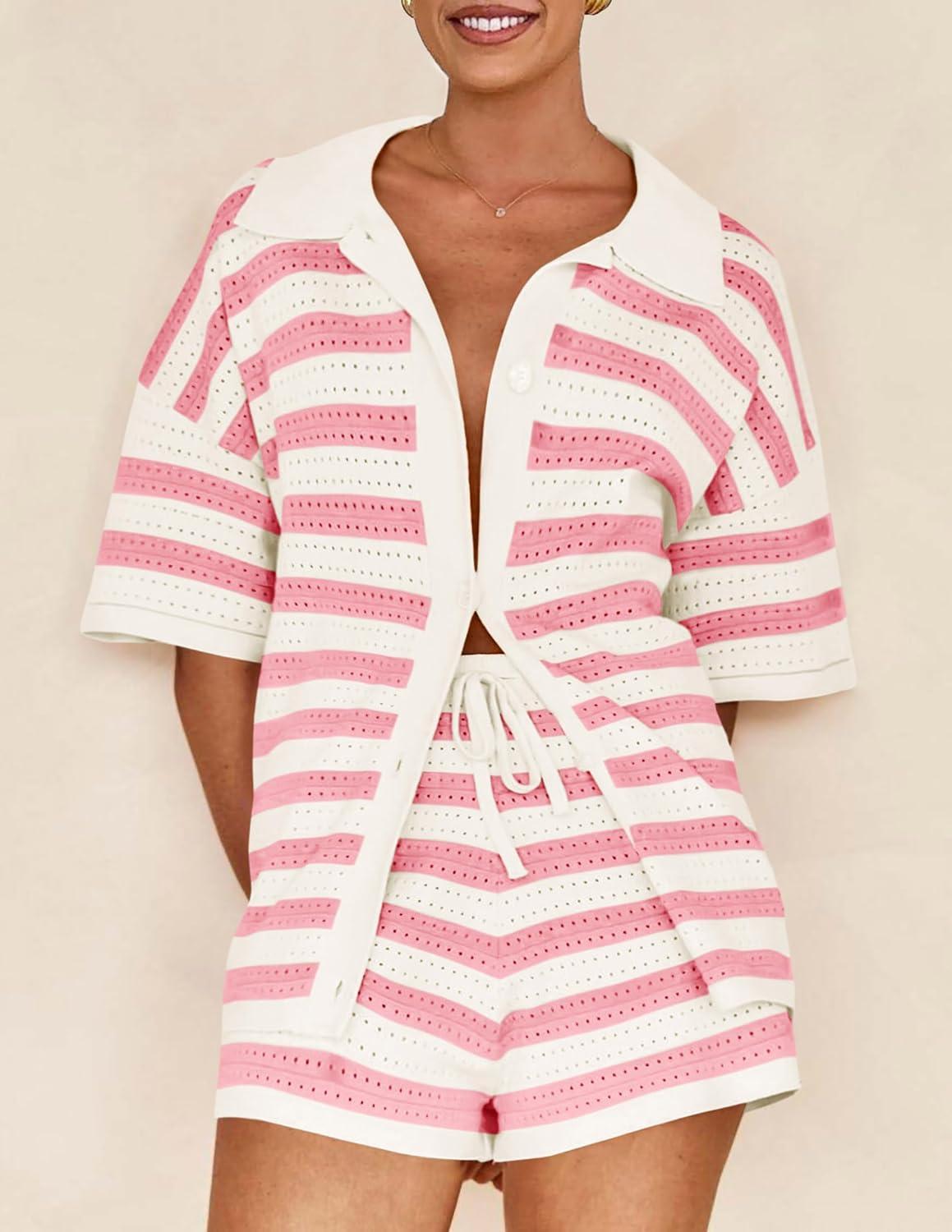 PRETTYGARDEN Women's 2 Piece Shorts Sets Casual Summer 2025 Short Sleeve Striped Sweater Set Matching Beach Vacation Outfit(Pink)