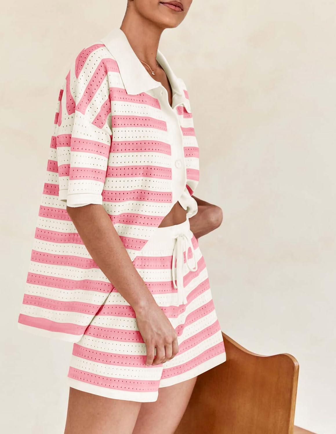 imagePRETTYGARDEN Womens 2 Piece Shorts Sets Casual Summer 2025 Short Sleeve Striped Sweater Set Matching Beach Vacation OutfitPink