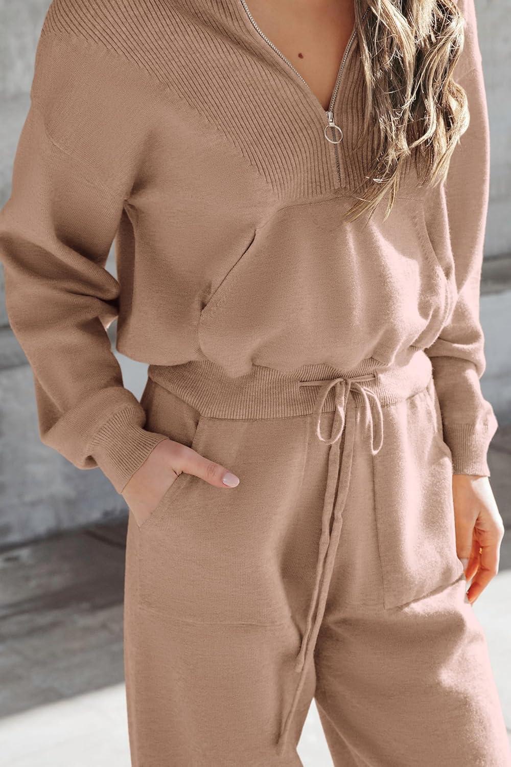PRETTYGARDEN Women's 2 Piece Sweater Set Pullover Zip Up Sweatshirt Jogger Sweatpants Tracksuit Casual Outfit(Khaki)