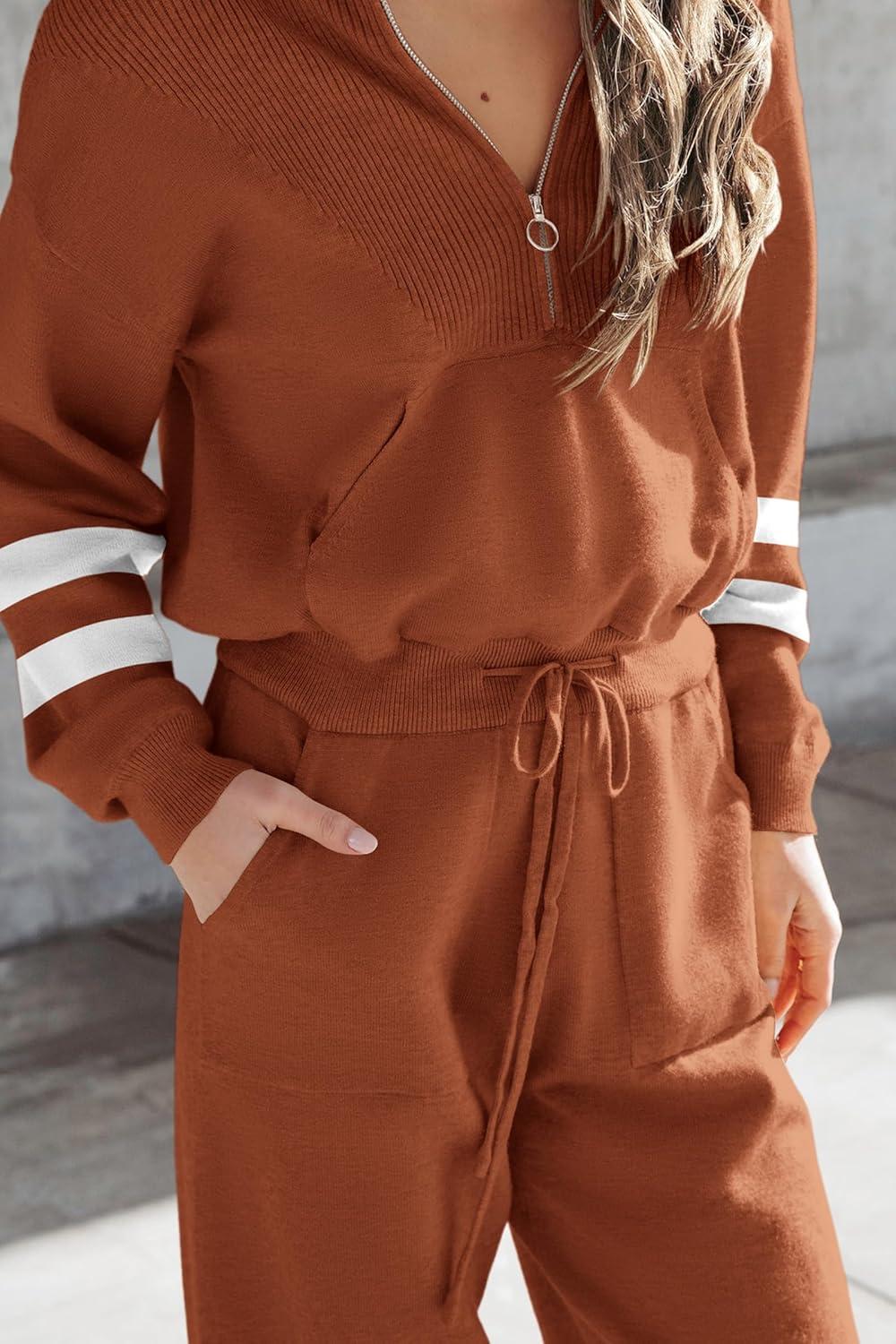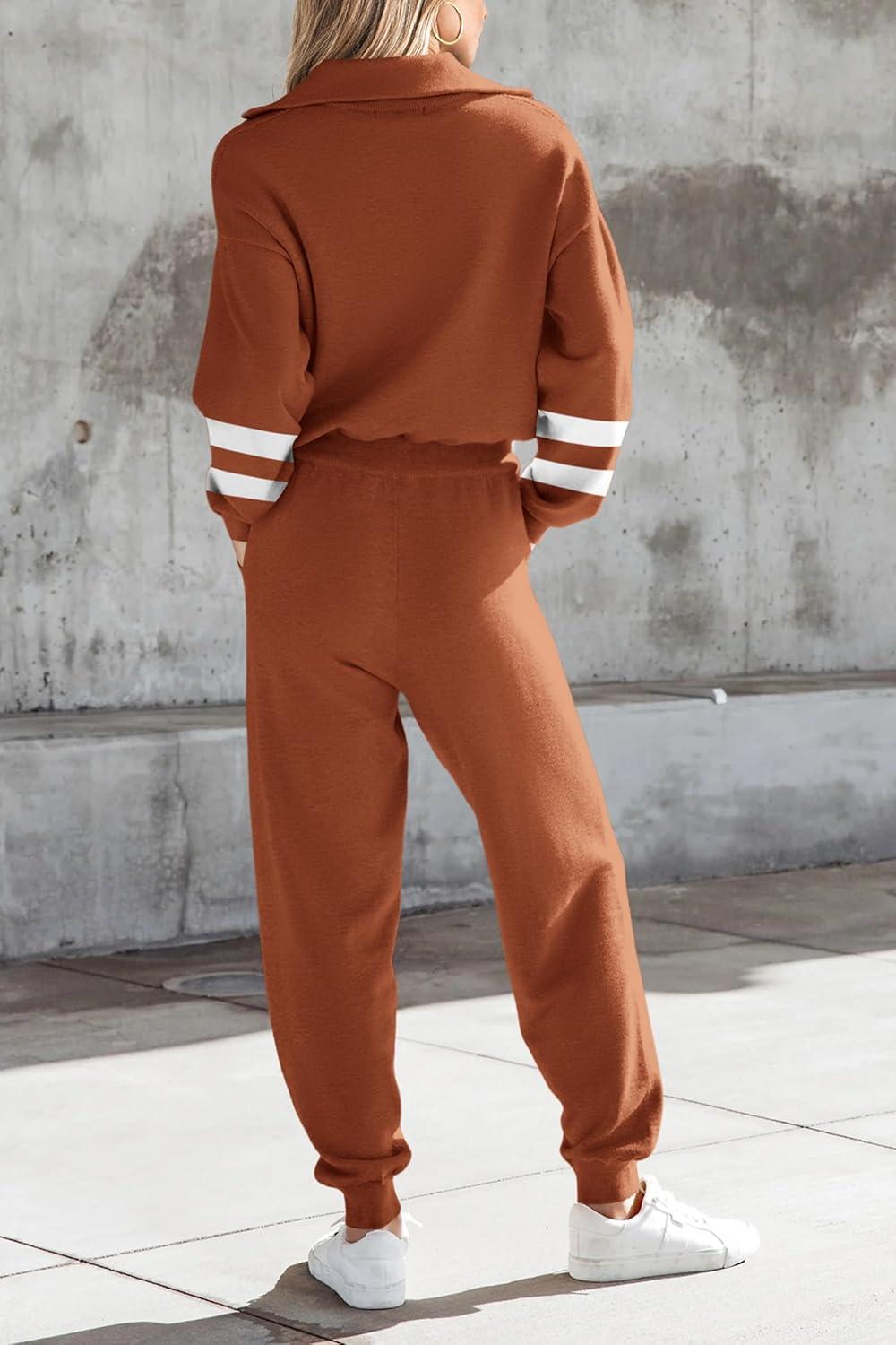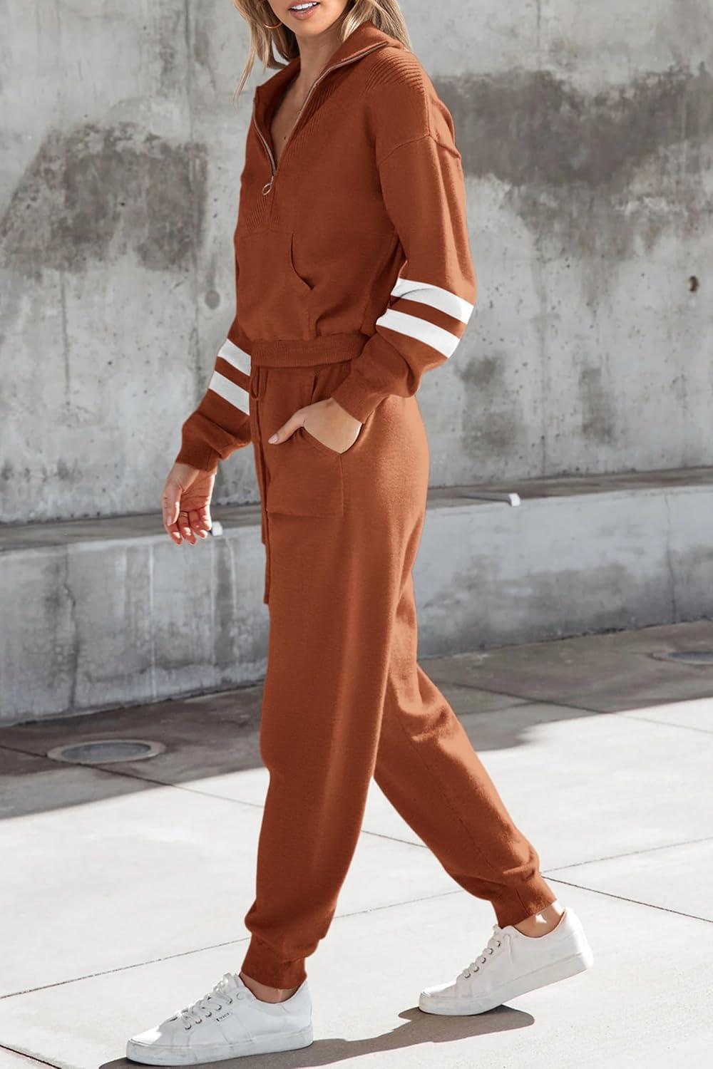 PRETTYGARDEN Women's 2 Piece Sweater Set Pullover Zip Up Sweatshirt Jogger Sweatpants Tracksuit Casual Outfit(Striped Caramel)