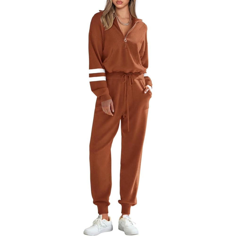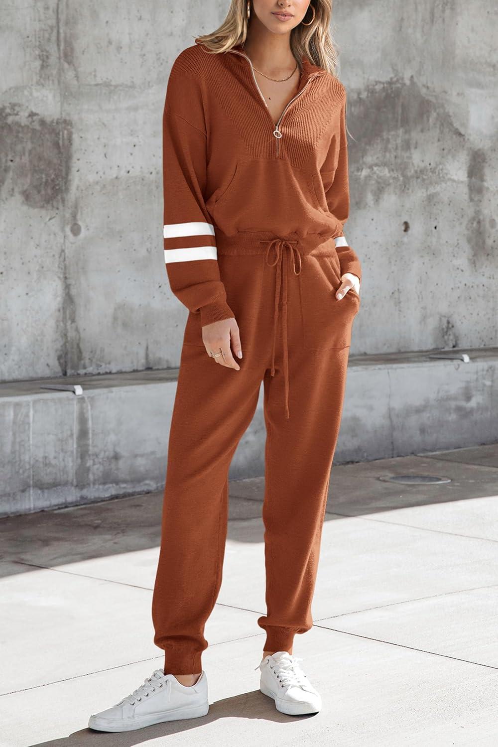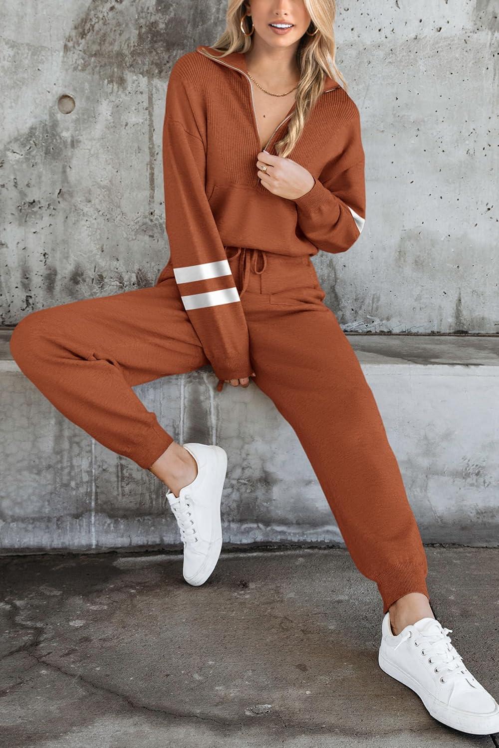 PRETTYGARDEN Women's 2 Piece Sweater Set Pullover Zip Up Sweatshirt Jogger Sweatpants Tracksuit Casual Outfit(Striped Caramel)