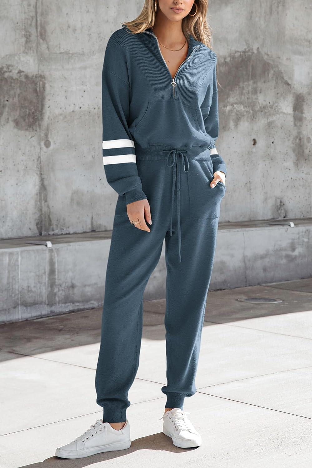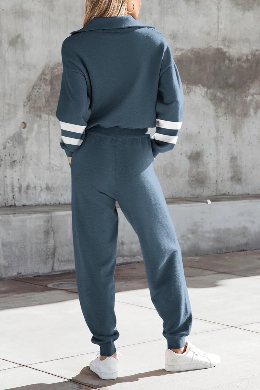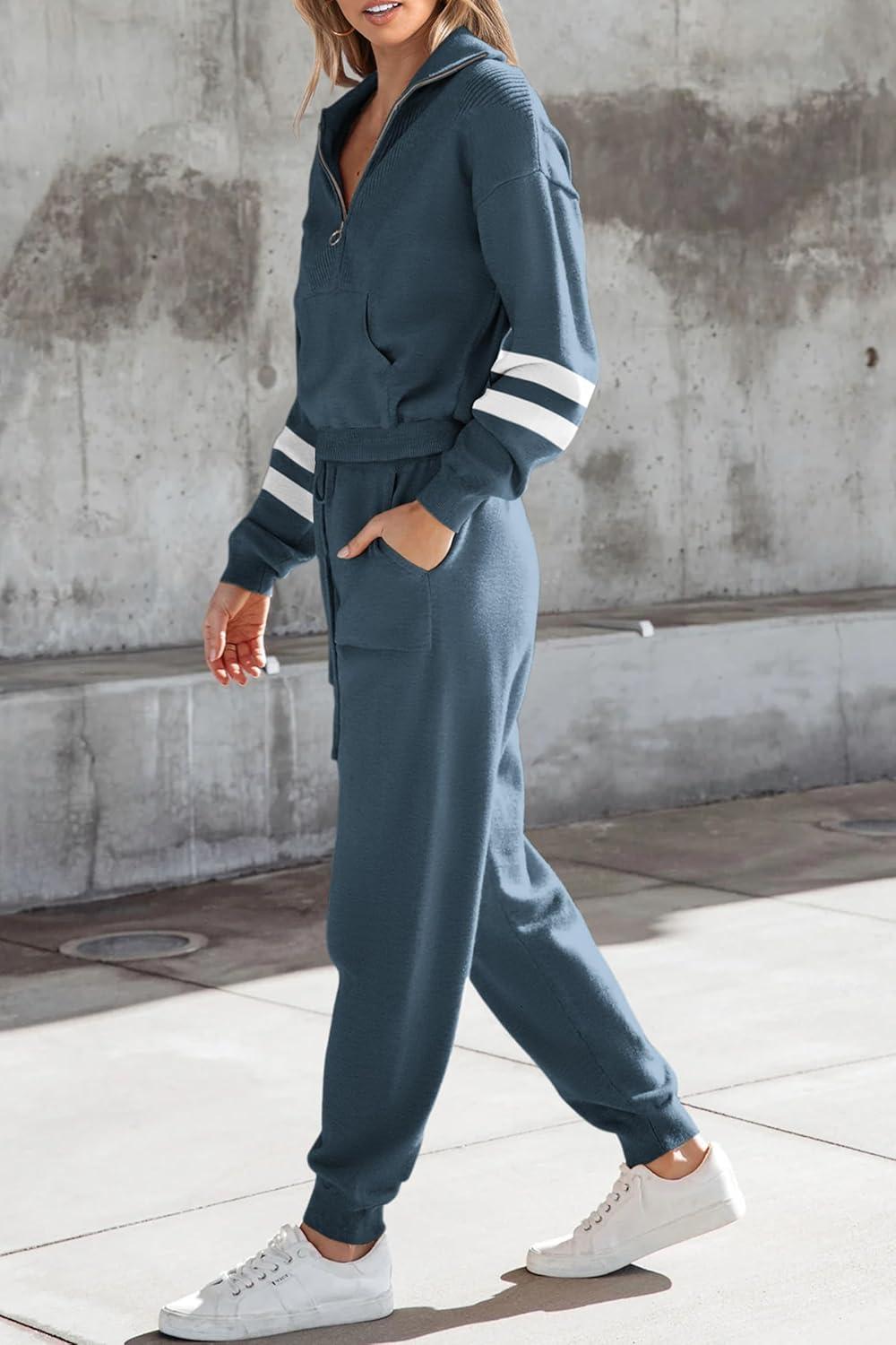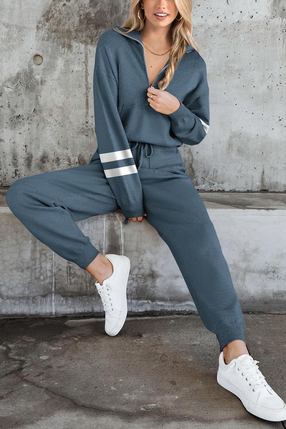 PRETTYGARDEN Women's 2 Piece Sweater Set Pullover Zip Up Sweatshirt Jogger Sweatpants Tracksuit Casual Outfit(Striped Grey Blue)
