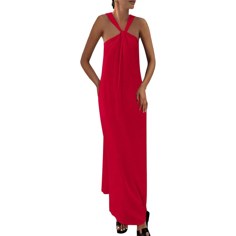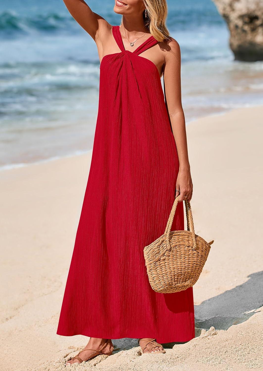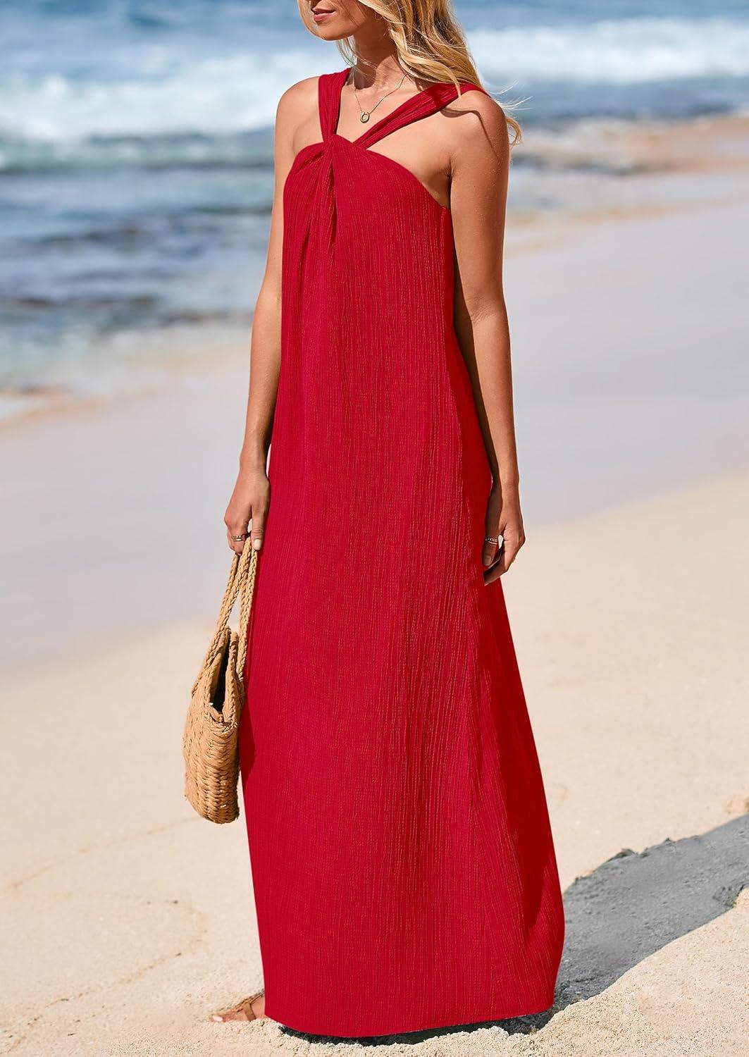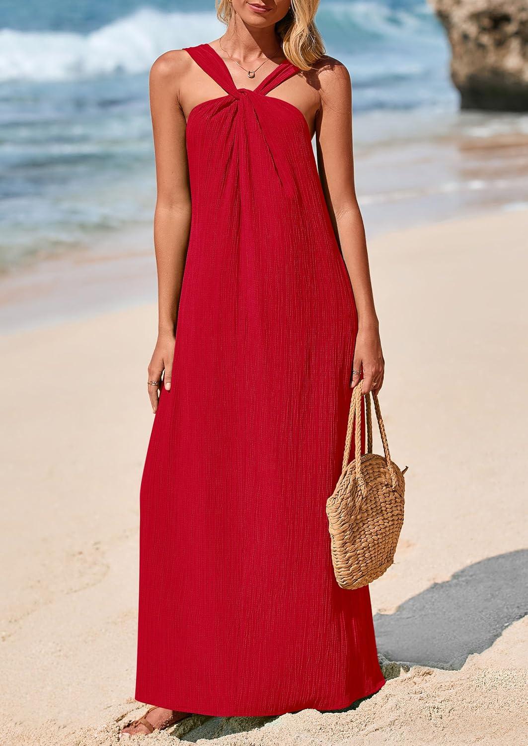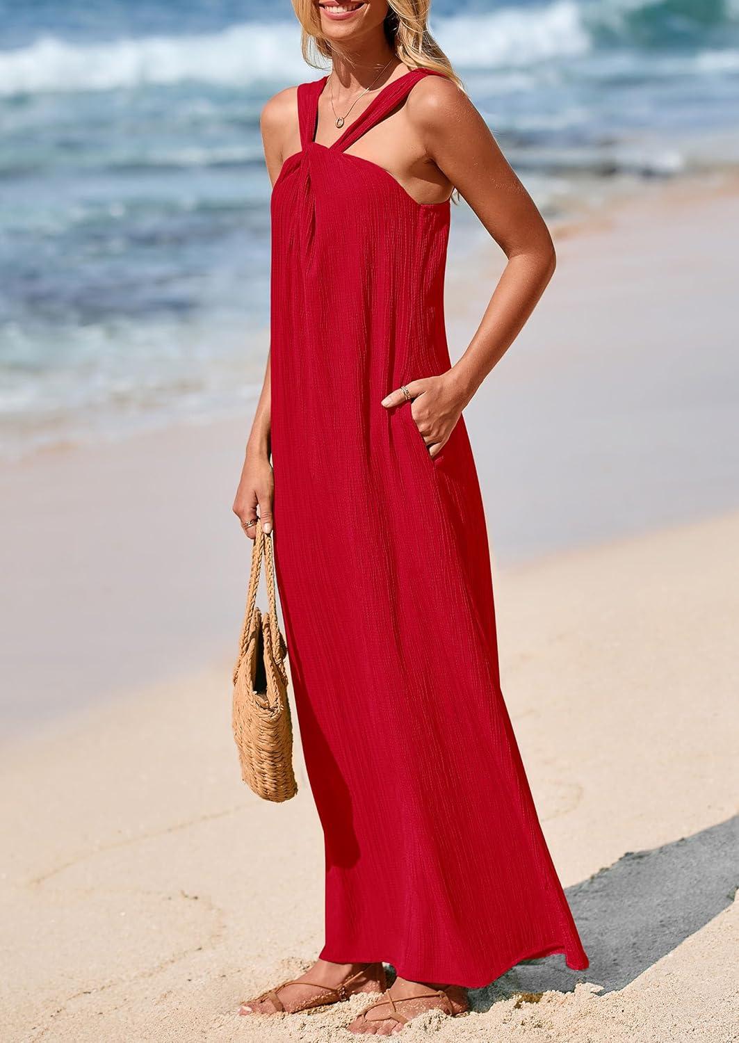 PRETTYGARDEN Womens 2025 Casual Long Summer Dresses Sleeveless Strappy Loose Flowy Beach Vacation Maxi Dress with Pockets(Red)