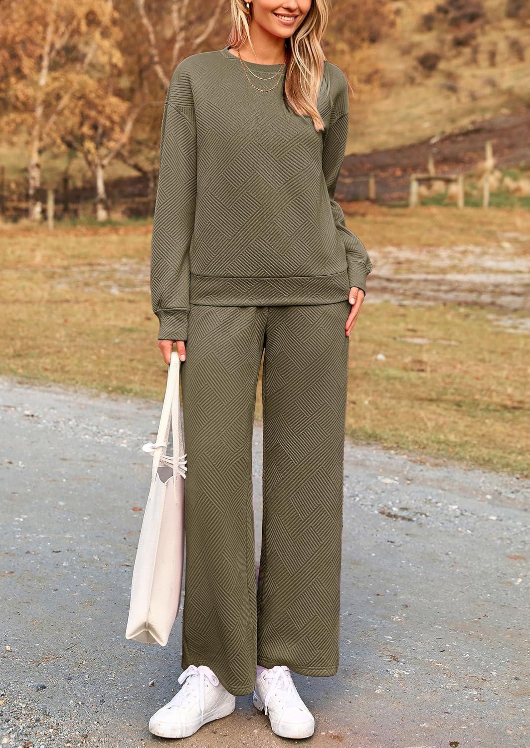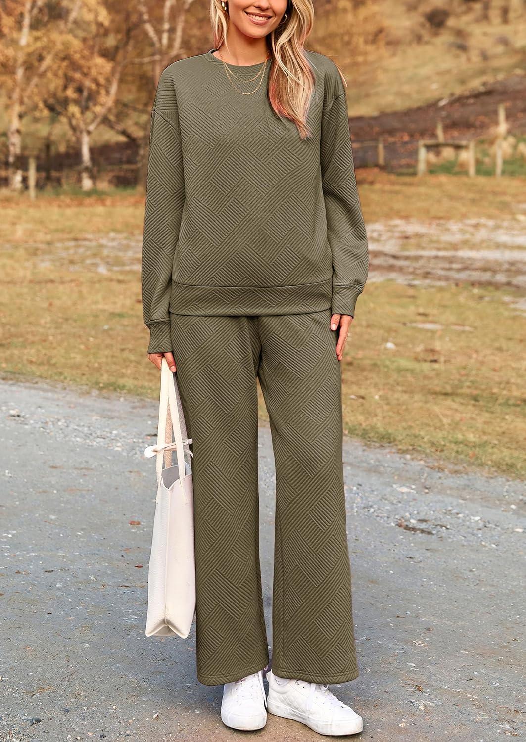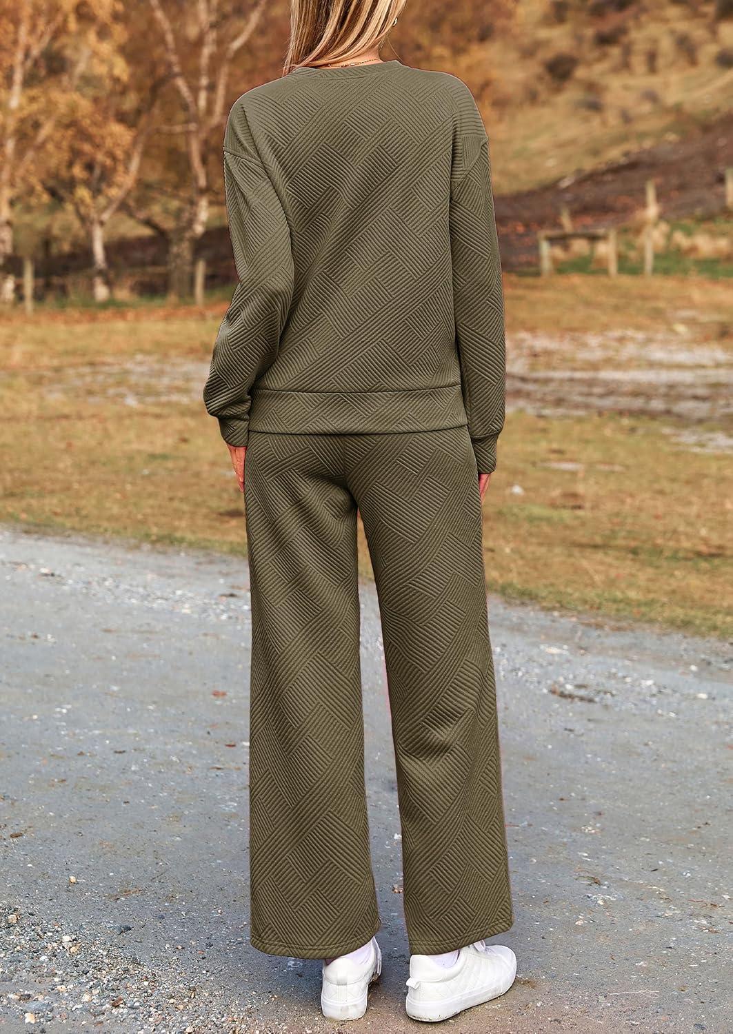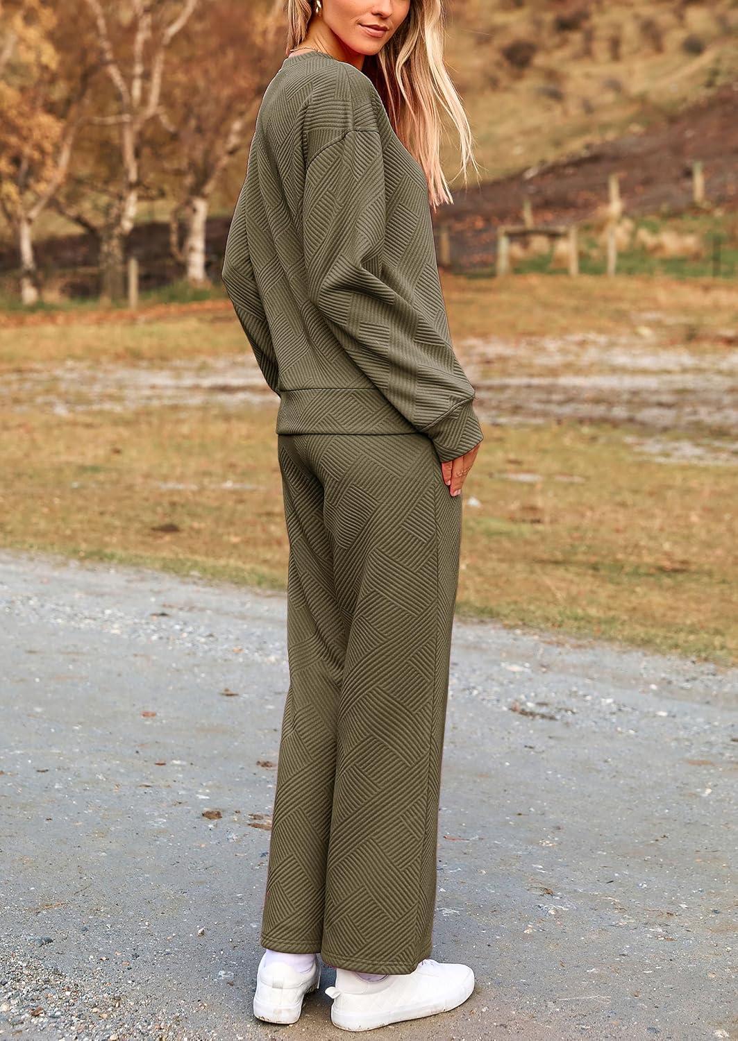 PRETTYGARDEN Womens 2025 Fall 2 Piece Outfits Long Sleeve Pullover Tops Wide Leg Pants Matching Lounge Sets Fashion Clothing(Army Green)
