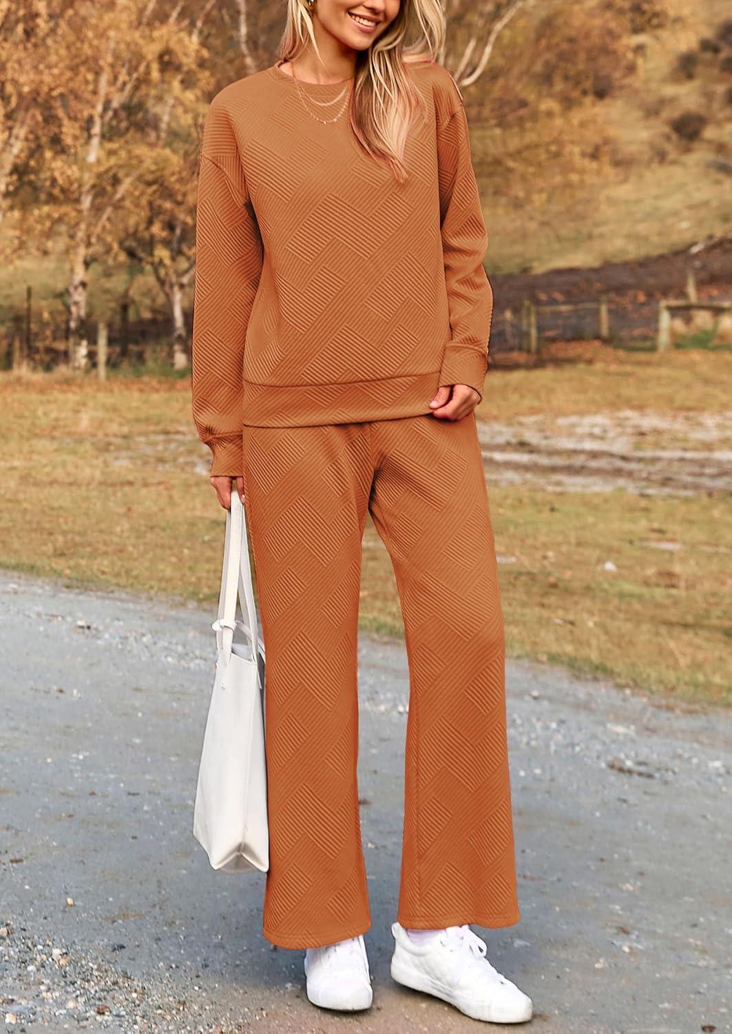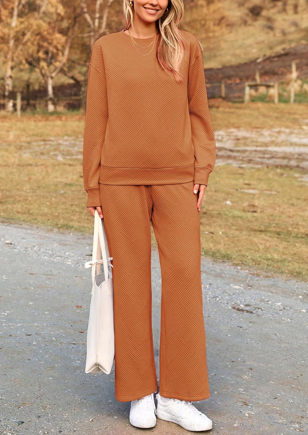 PRETTYGARDEN Womens 2025 Fall 2 Piece Outfits Long Sleeve Pullover Tops Wide Leg Pants Matching Lounge Sets Fashion Clothing(Brown Orange)