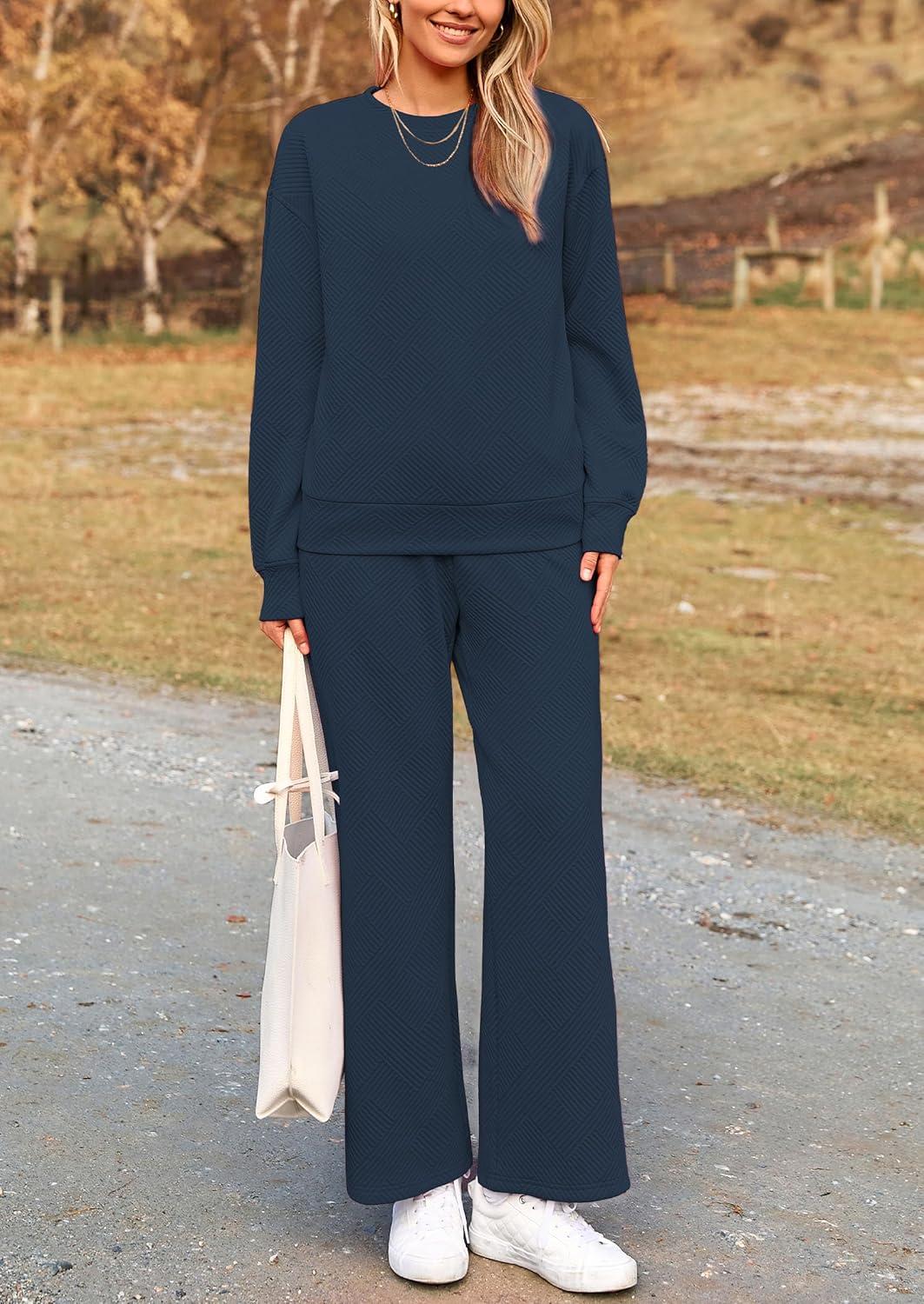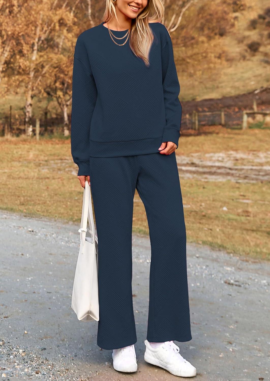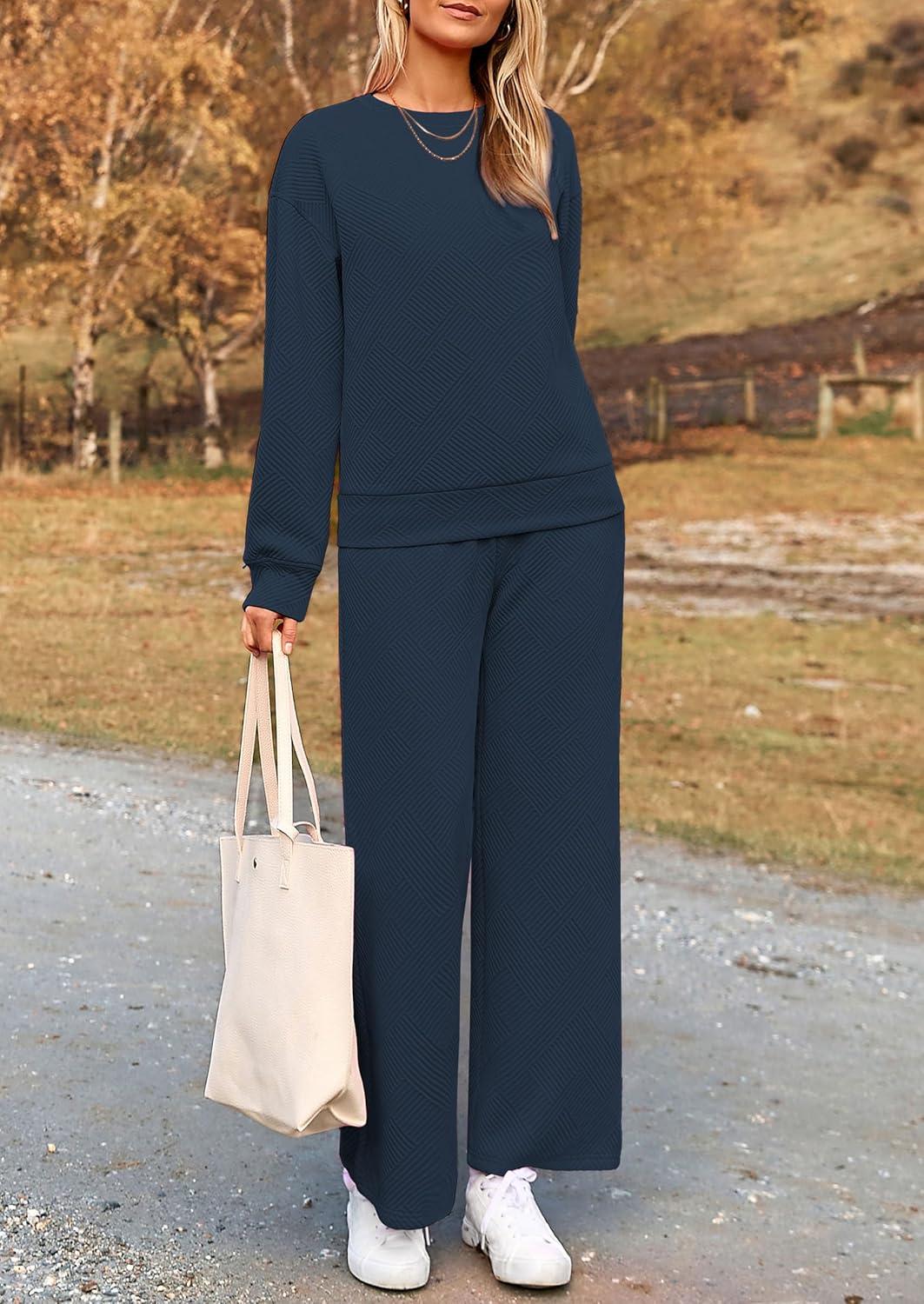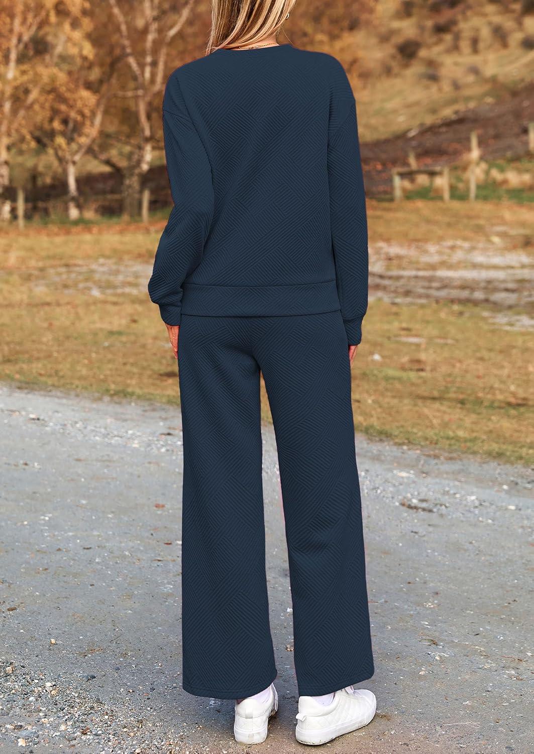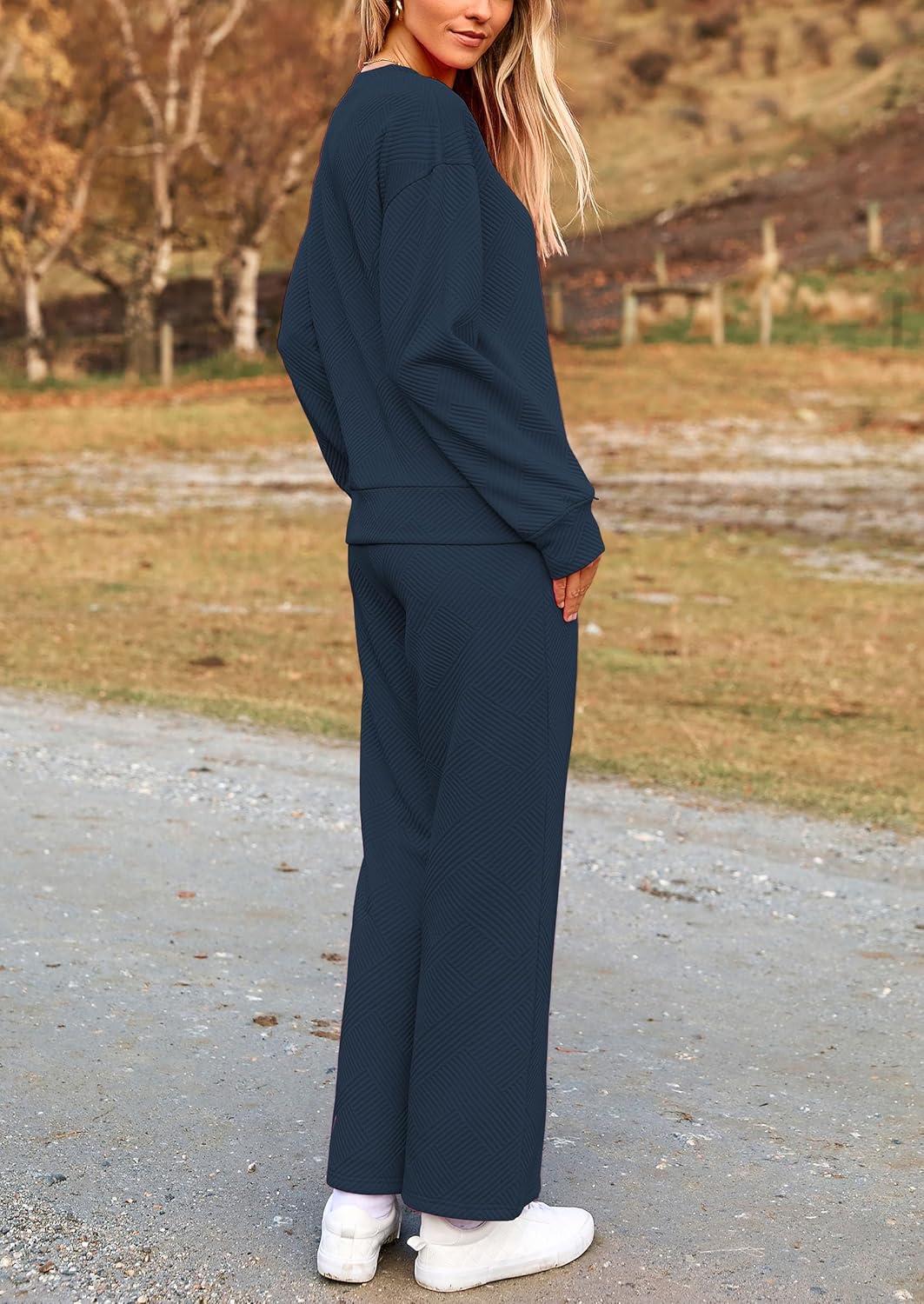 PRETTYGARDEN Womens 2025 Fall 2 Piece Outfits Long Sleeve Pullover Tops Wide Leg Pants Matching Lounge Sets Fashion Clothing(Navy)