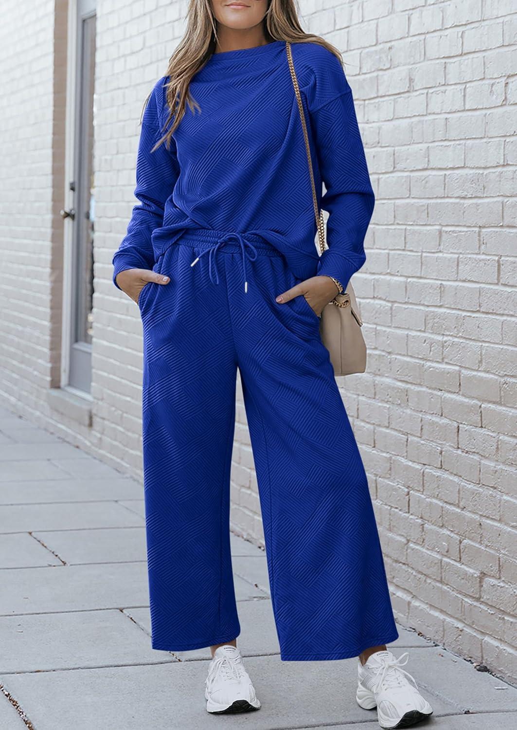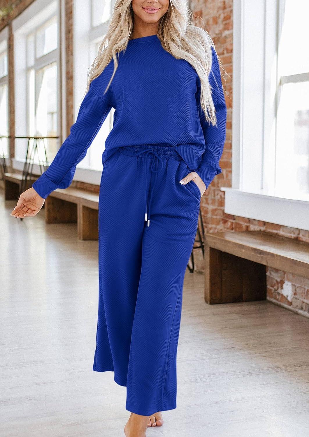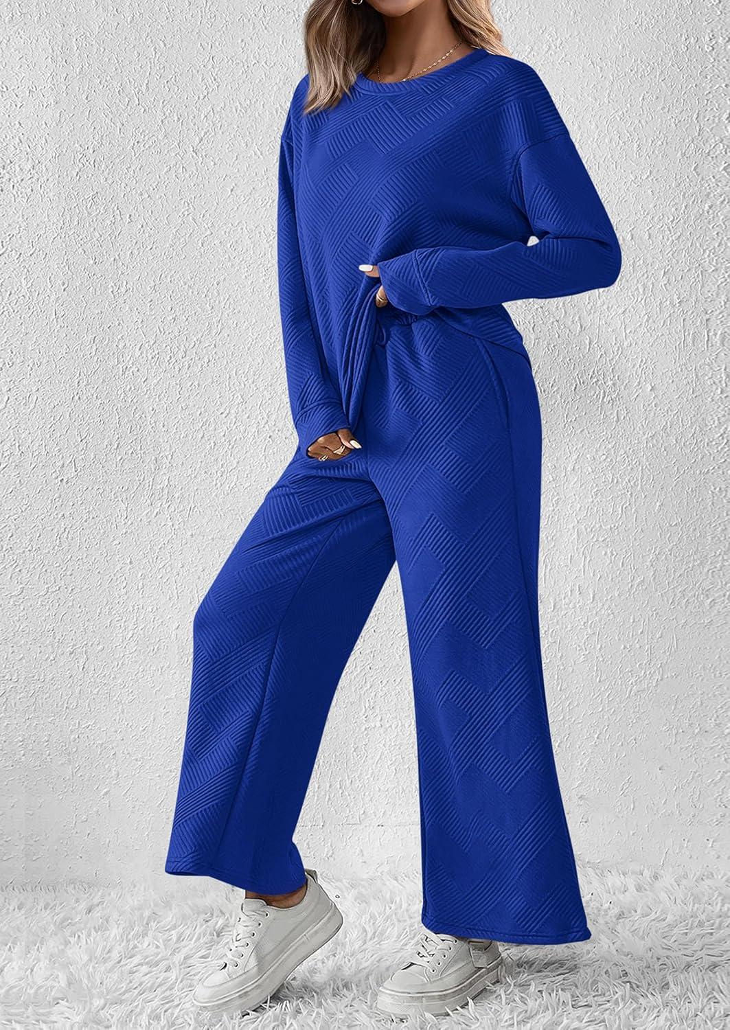 PRETTYGARDEN Womens 2025 Fall 2 Piece Outfits Long Sleeve Pullover Tops Wide Leg Pants Matching Lounge Sets Fashion Clothing(Royal Blue)