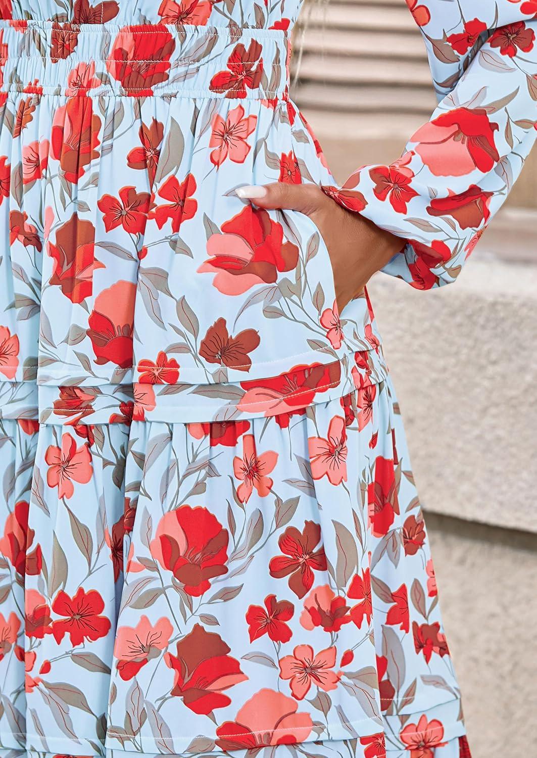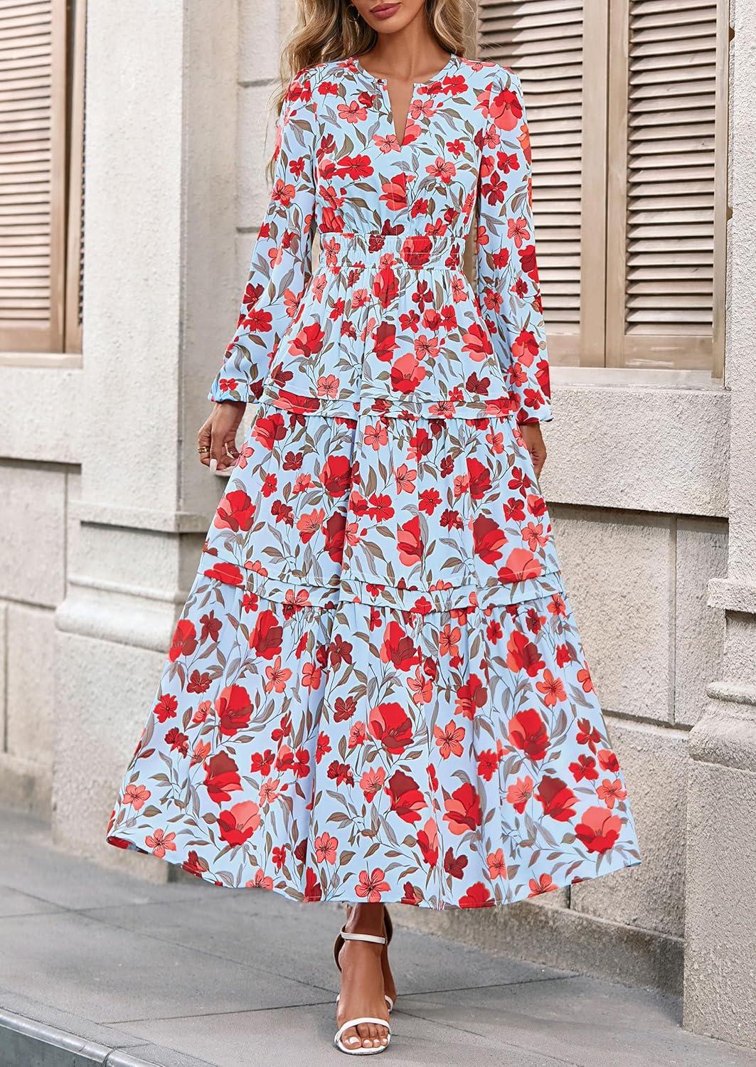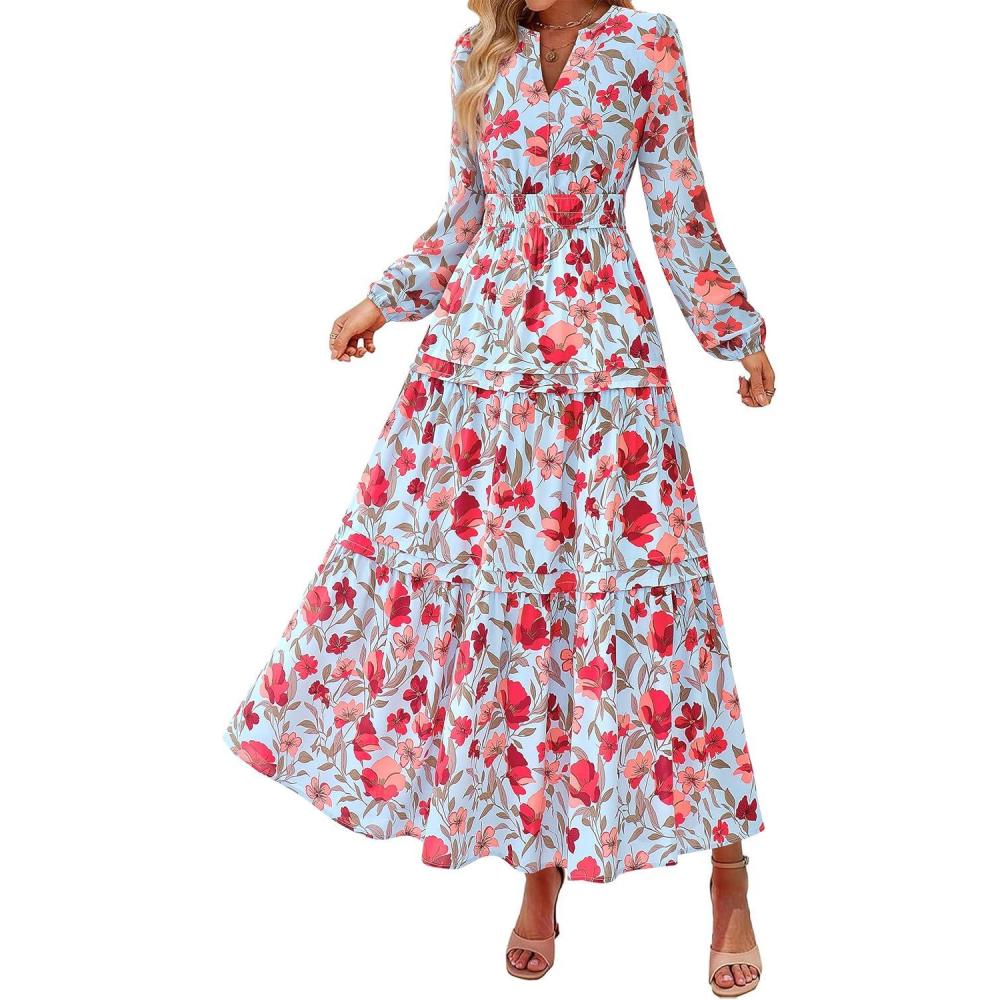 PRETTYGARDEN Women's 2025 Fall Boho Maxi Dresses Floral Long Sleeve V Neck Flowy Elegant Wedding Guest Dress Vacation Outfits(Floral Blue Red)