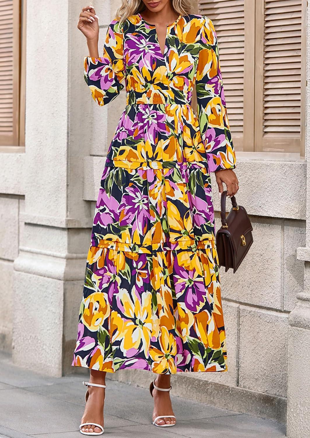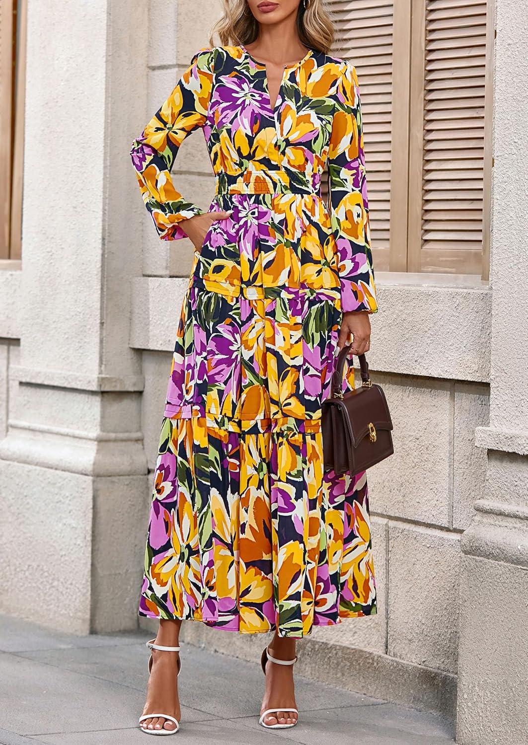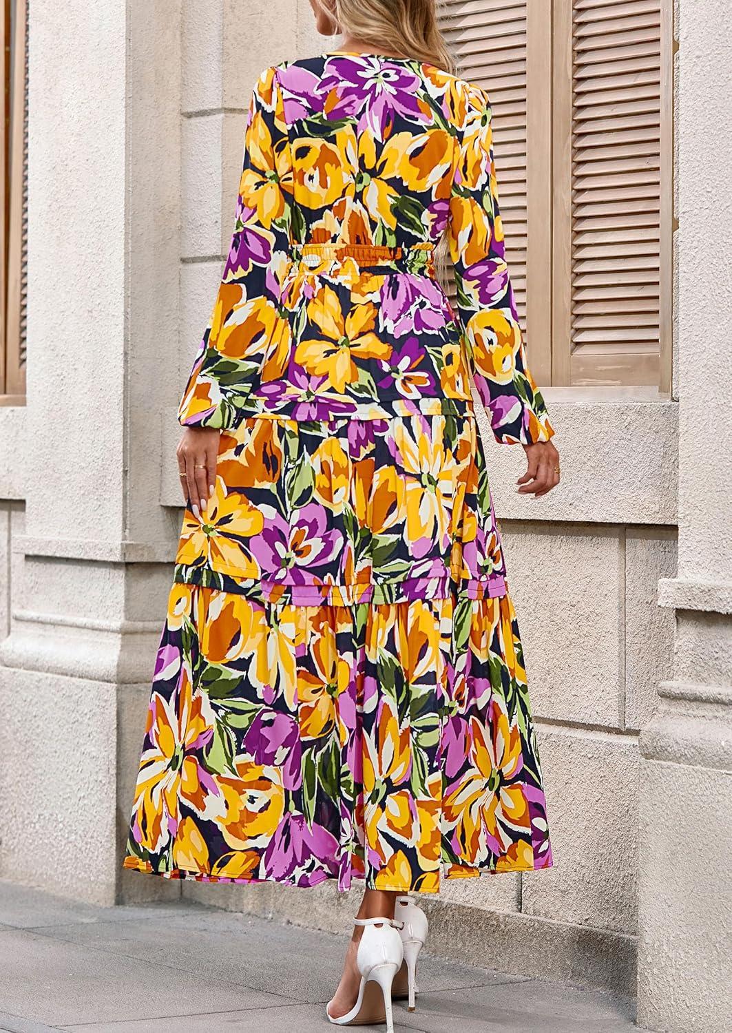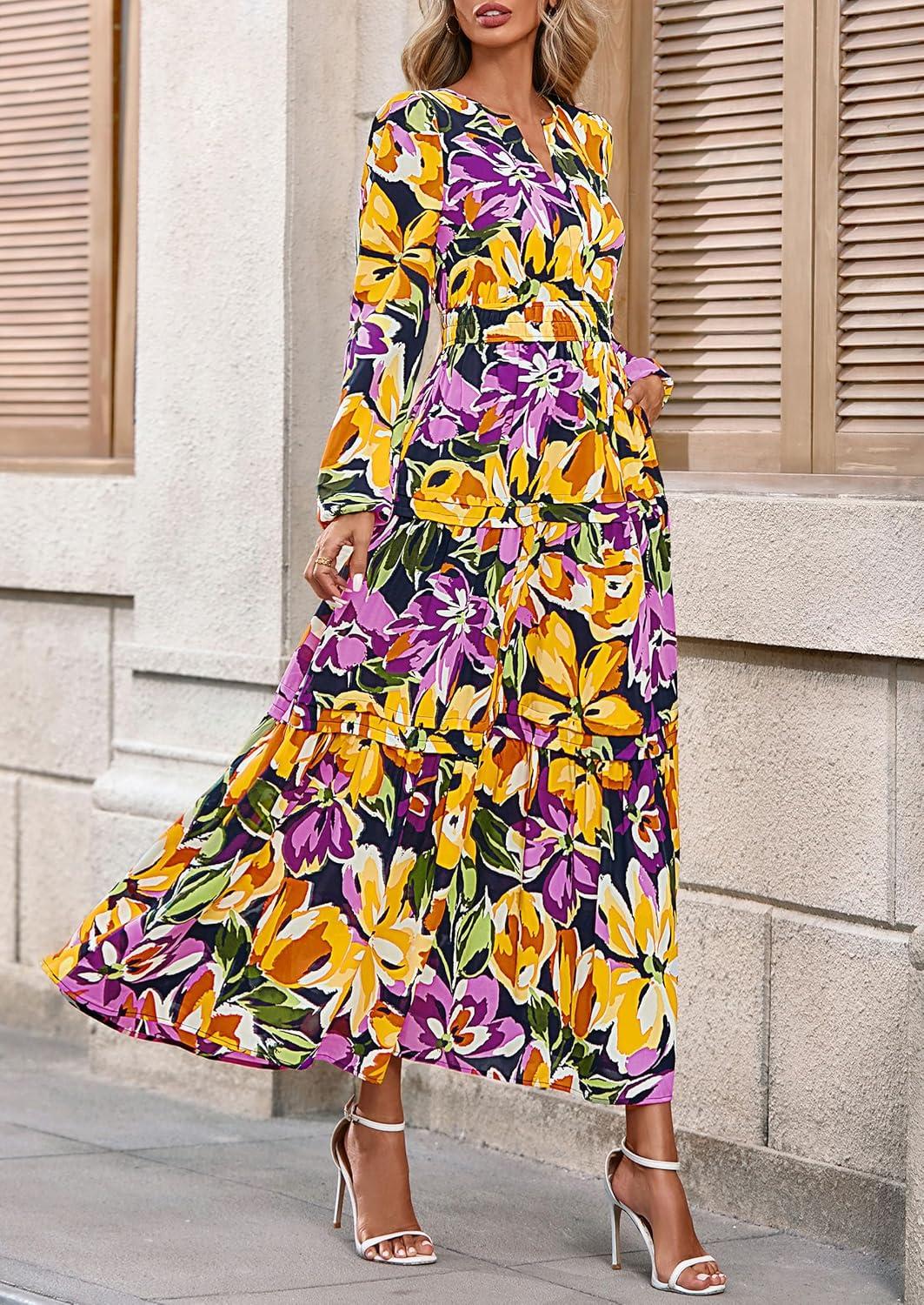 PRETTYGARDEN Women's 2025 Fall Boho Maxi Dresses Floral Long Sleeve V Neck Flowy Elegant Wedding Guest Dress Vacation Outfits(Floral Navy Yellow)
