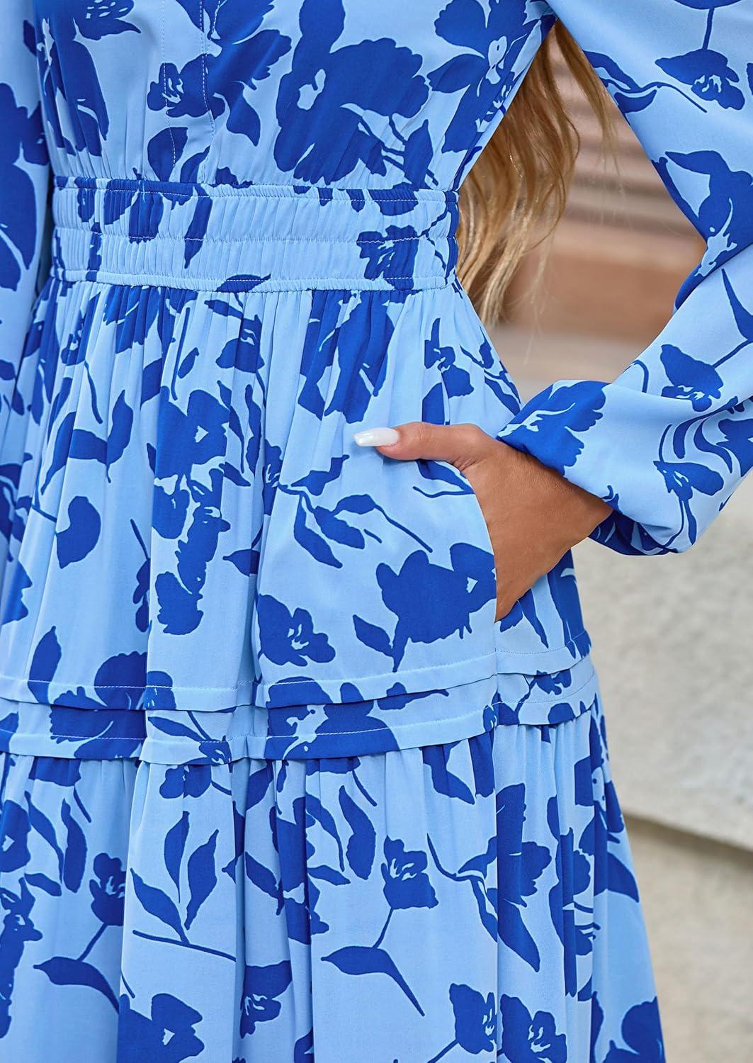 PRETTYGARDEN Women’s 2025 Fall Boho Maxi Dresses Floral Long Sleeve V Neck Flowy Elegant Wedding Guest Dress Vacation Outfits(Sky Blue)