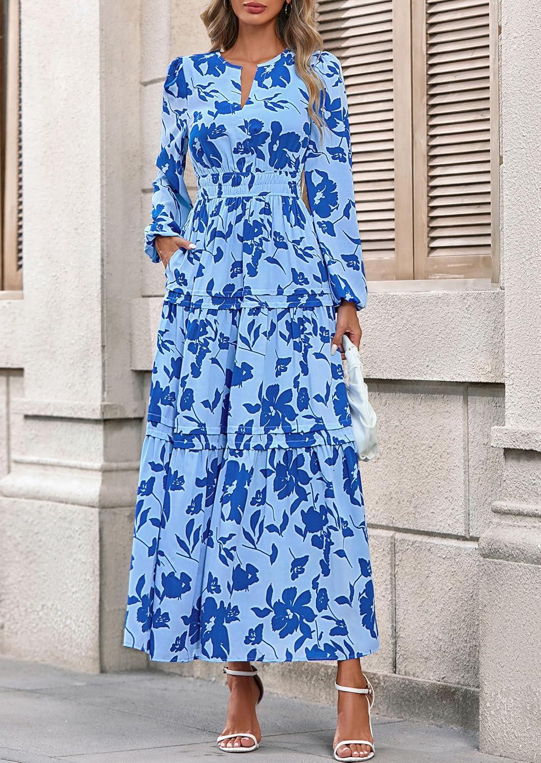 PRETTYGARDEN Women's 2025 Fall Boho Maxi Dresses Floral Long Sleeve V Neck Flowy Elegant Wedding Guest Dress Vacation Outfits(Sky Blue)