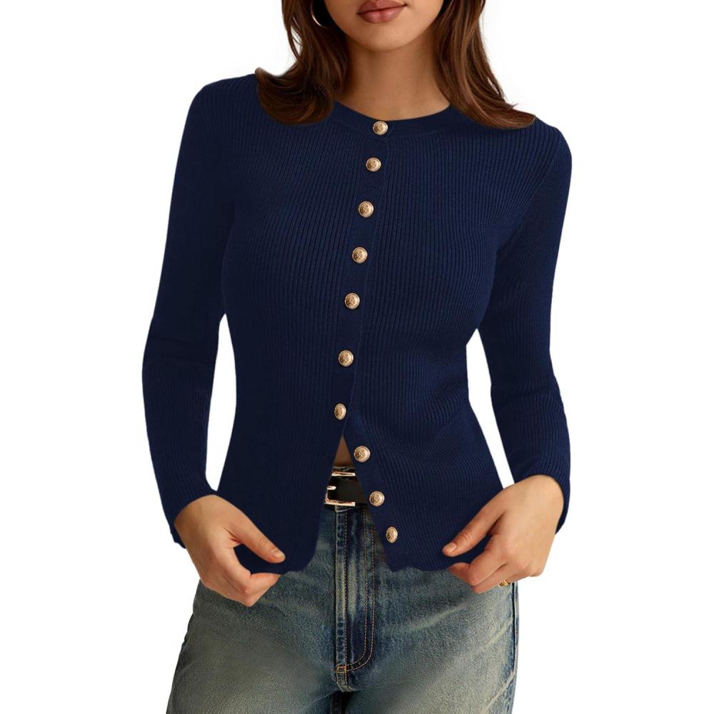 imagePRETTYGARDEN Womens 2025 Fall Cardigan Sweaters Lightweight Long Sleeve Button up Ribbed Knit Tops Winter Fashion ClothesNavy Blue