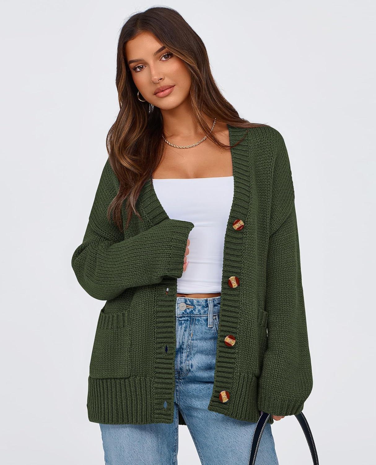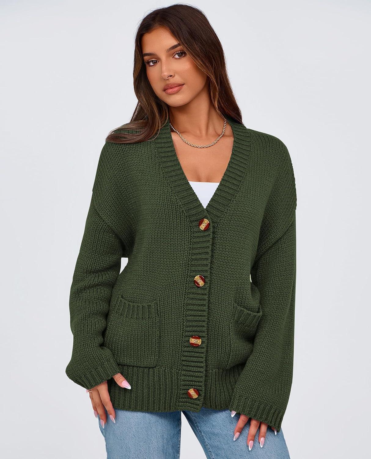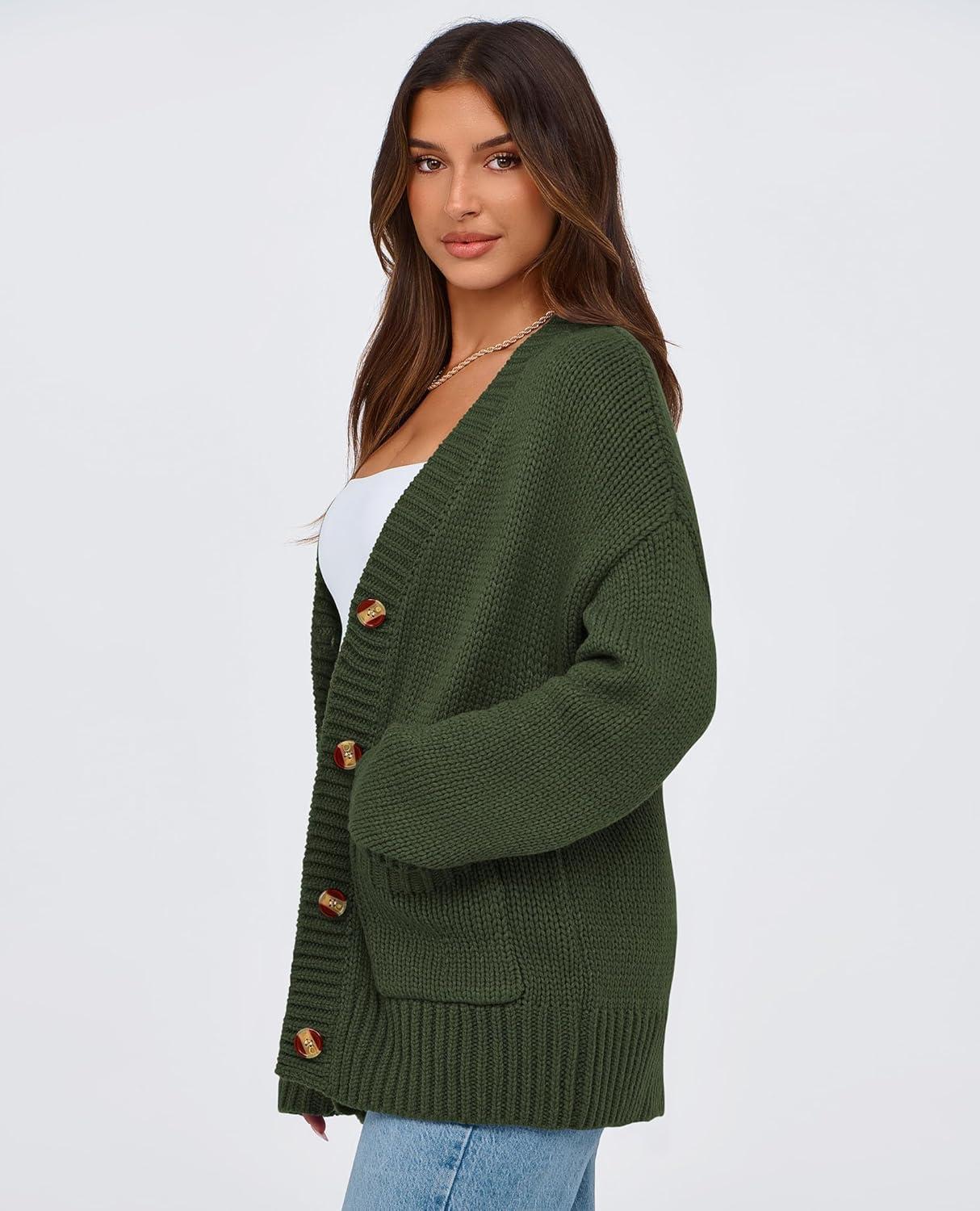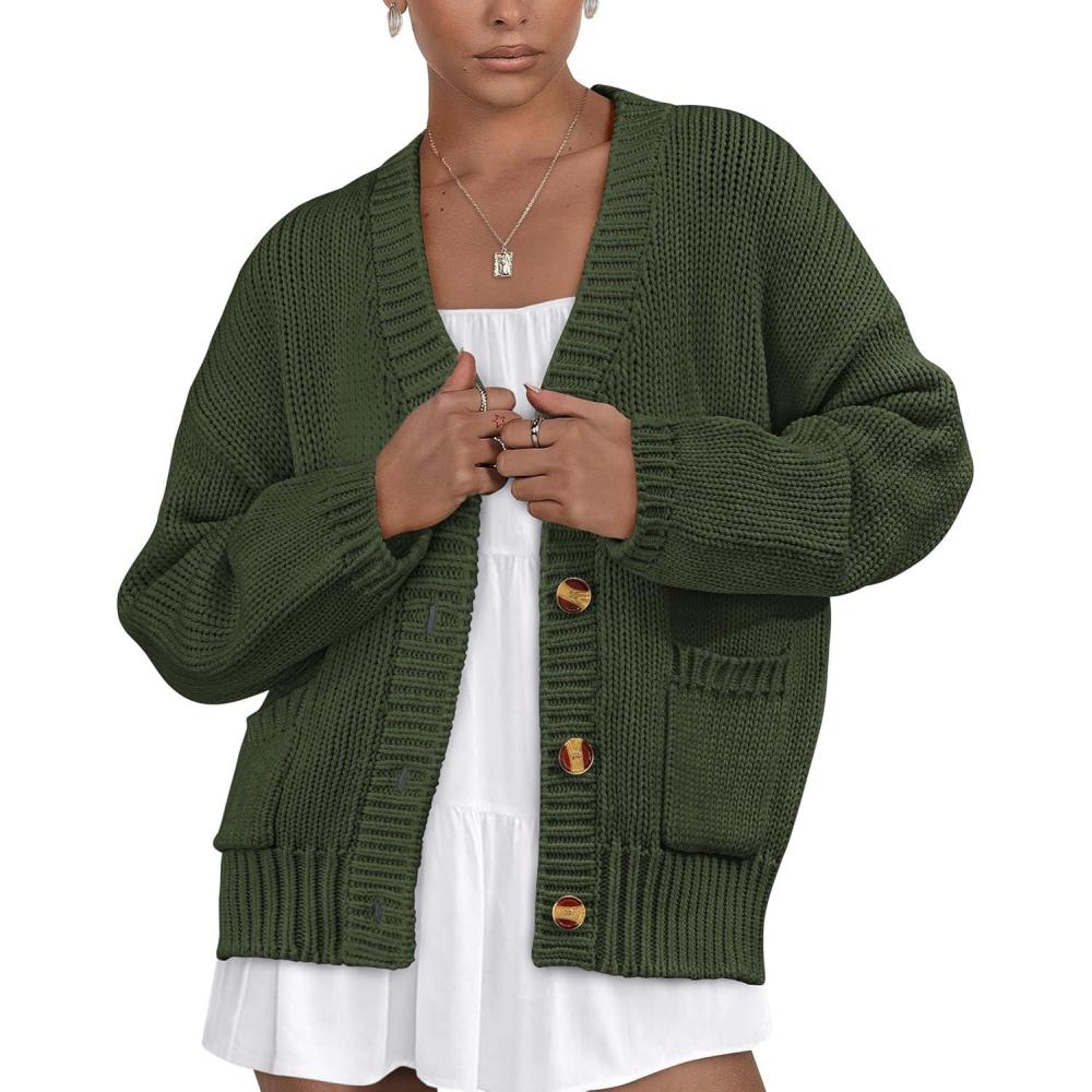 PRETTYGARDEN Women's 2025 Fall Cardigan Sweaters Long Sleeve Open Front Button Up V Neck Knit Winter Fashion Clothes(Army Green)