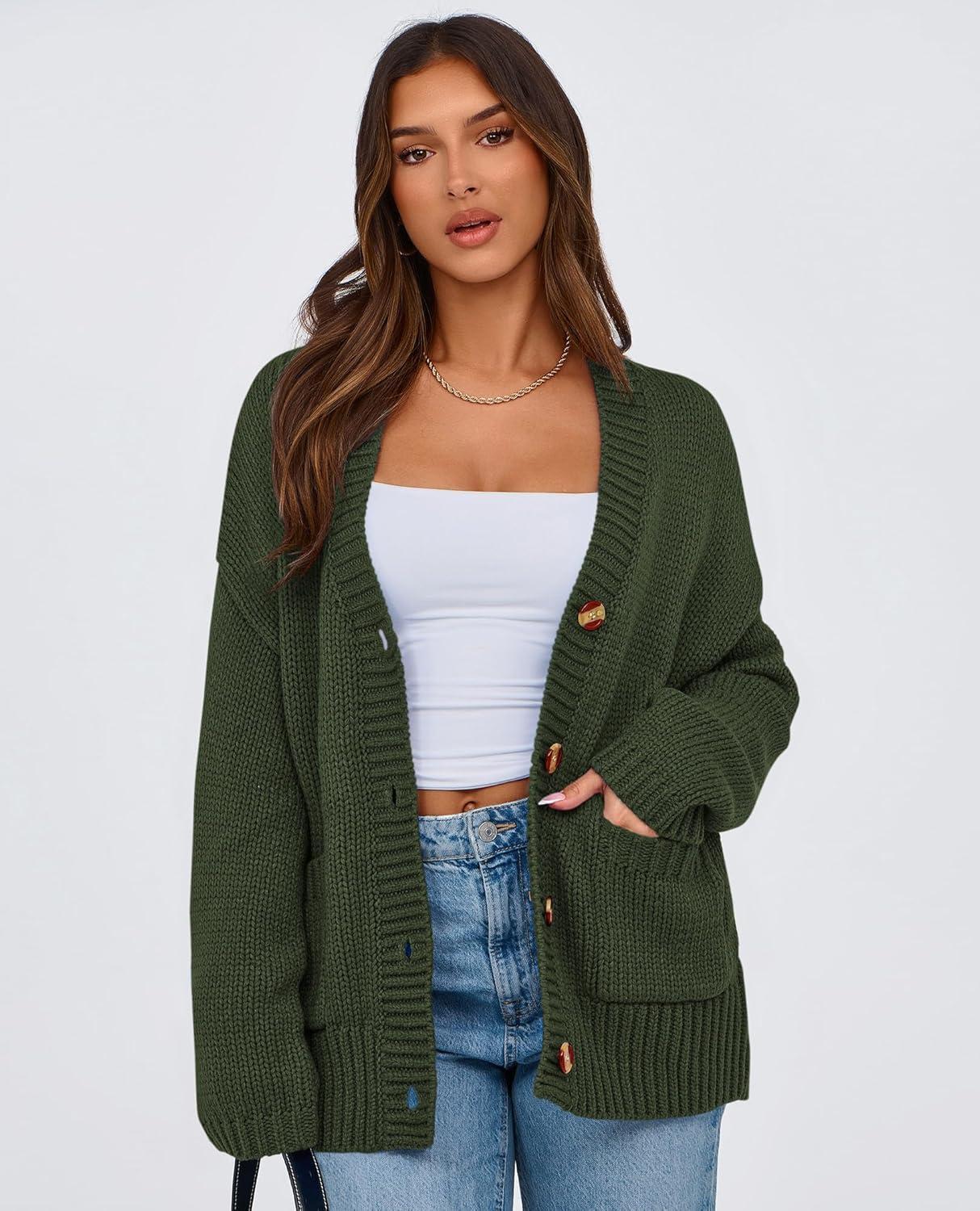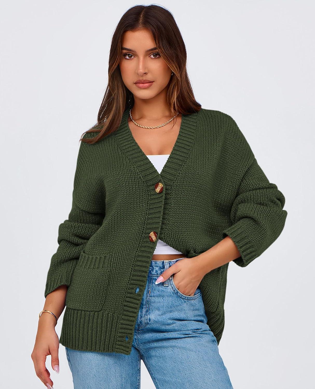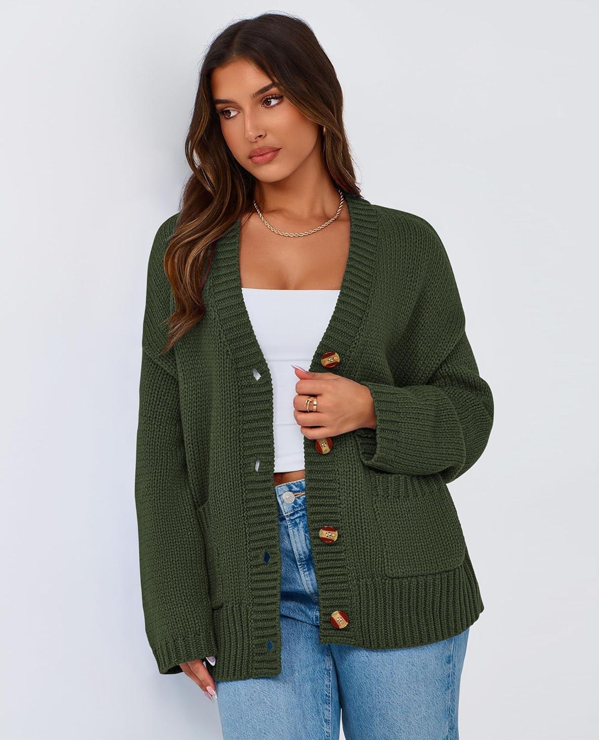 PRETTYGARDEN Women's 2025 Fall Cardigan Sweaters Long Sleeve Open Front Button Up V Neck Knit Winter Fashion Clothes(Army Green)