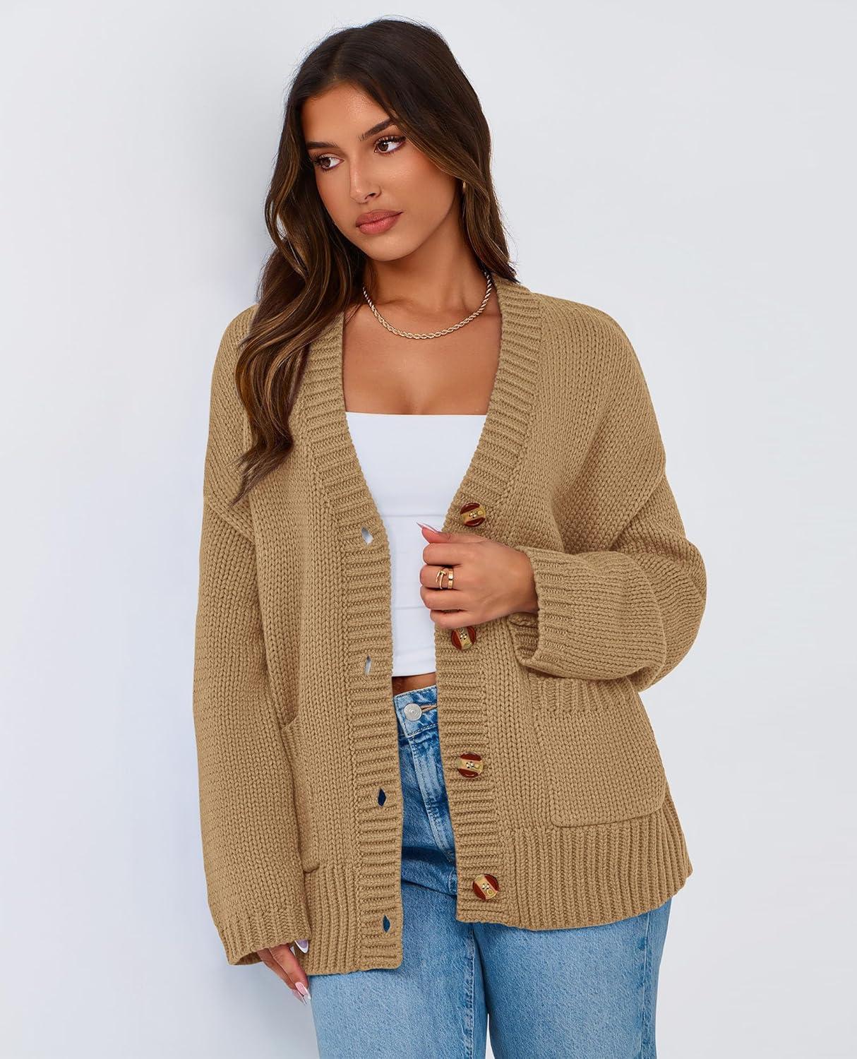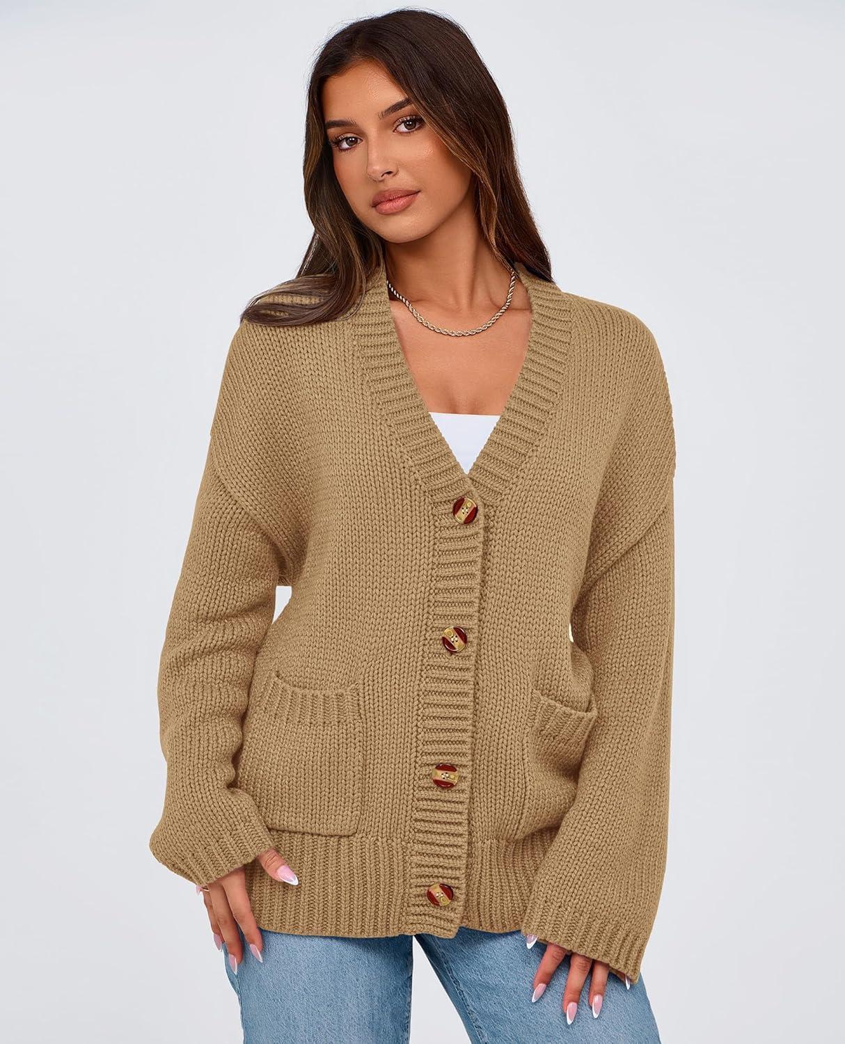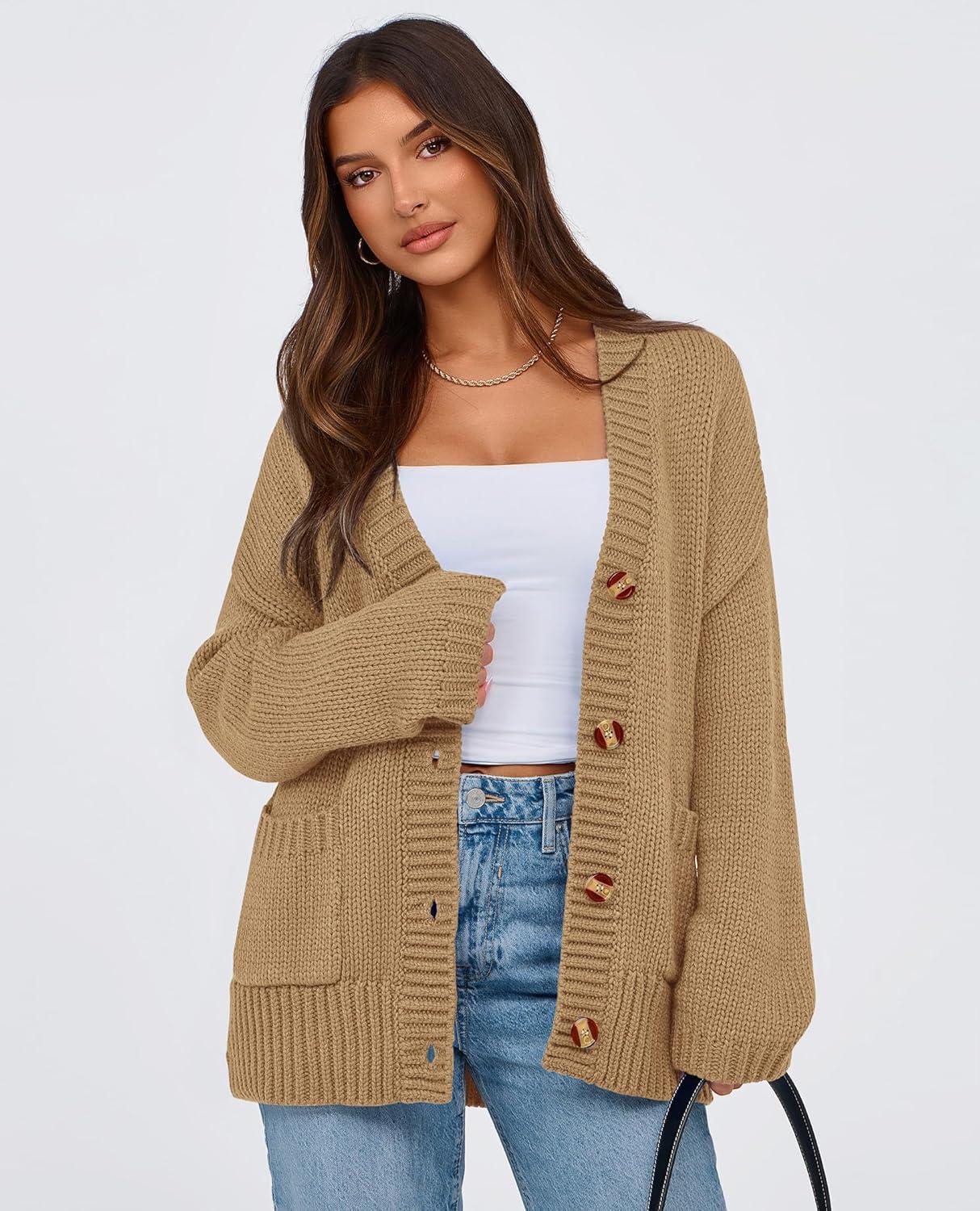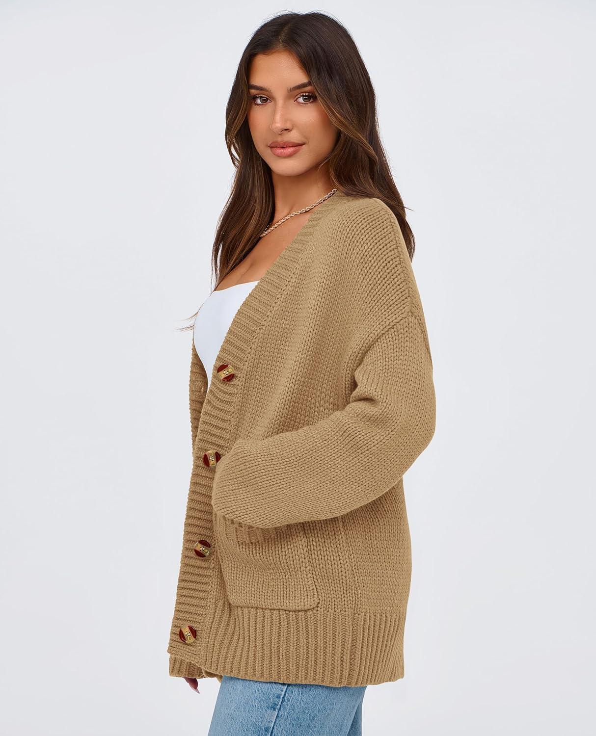 PRETTYGARDEN Women's 2025 Fall Cardigan Sweaters Long Sleeve Open Front Button Up V Neck Knit Winter Fashion Clothes(Khaki)