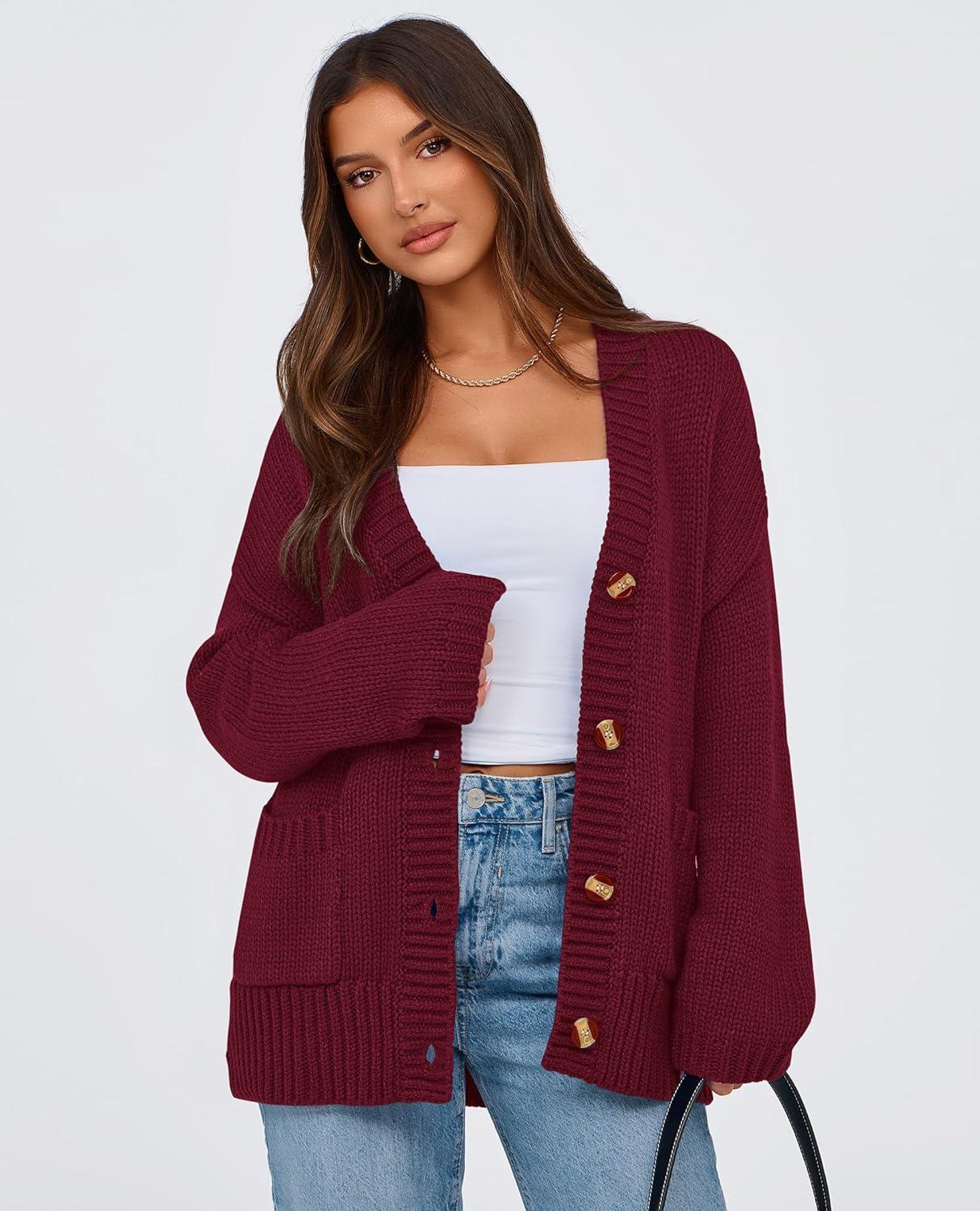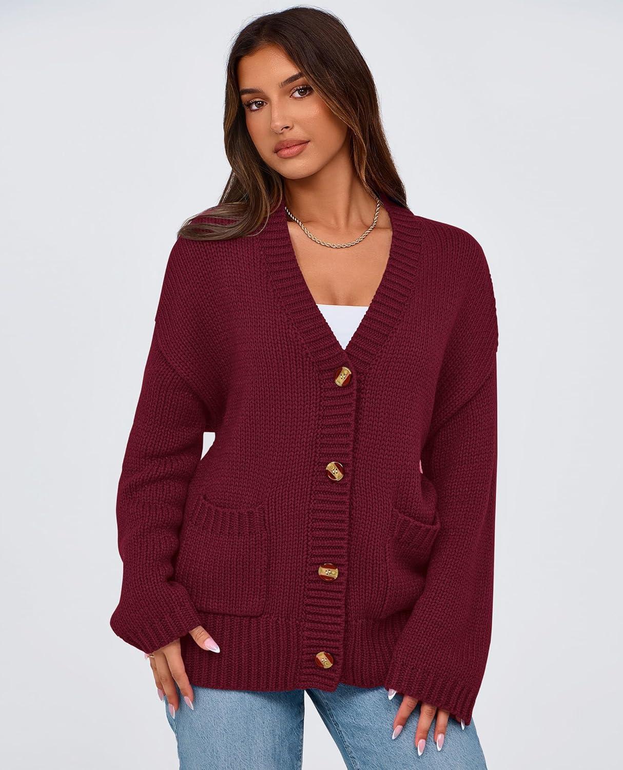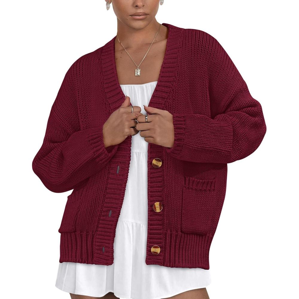 PRETTYGARDEN Women's 2025 Fall Cardigan Sweaters Long Sleeve Open Front Button Up V Neck Knit Winter Fashion Clothes(Wine Red)