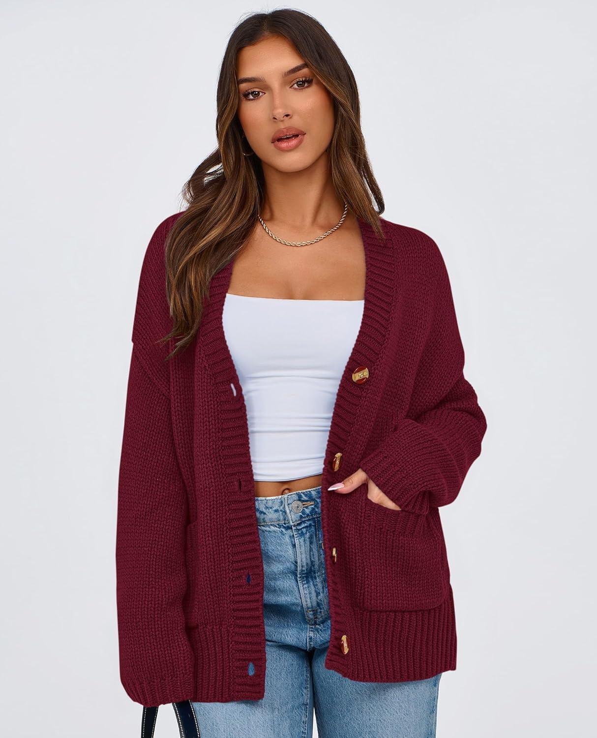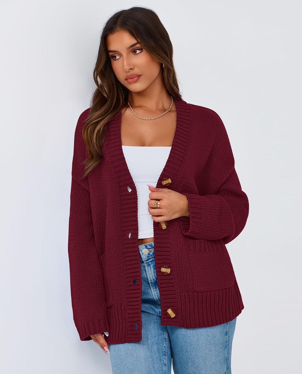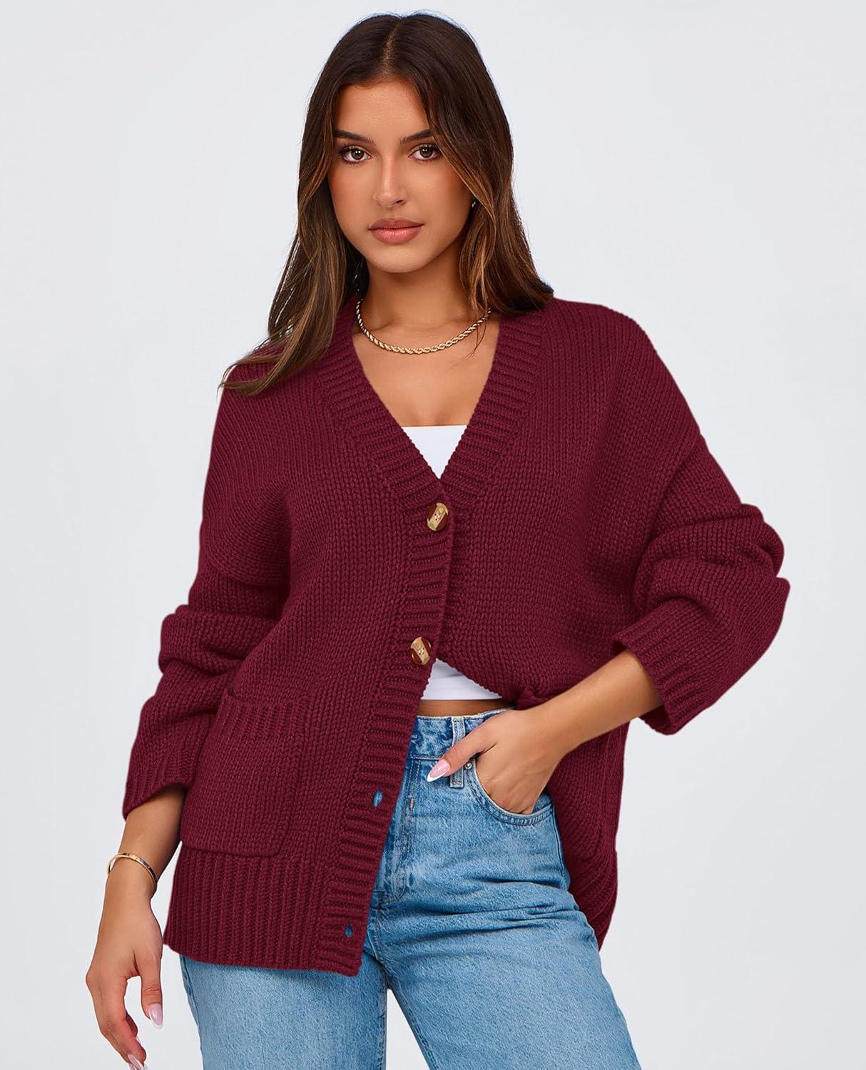 PRETTYGARDEN Women's 2025 Fall Cardigan Sweaters Long Sleeve Open Front Button Up V Neck Knit Winter Fashion Clothes(Wine Red)