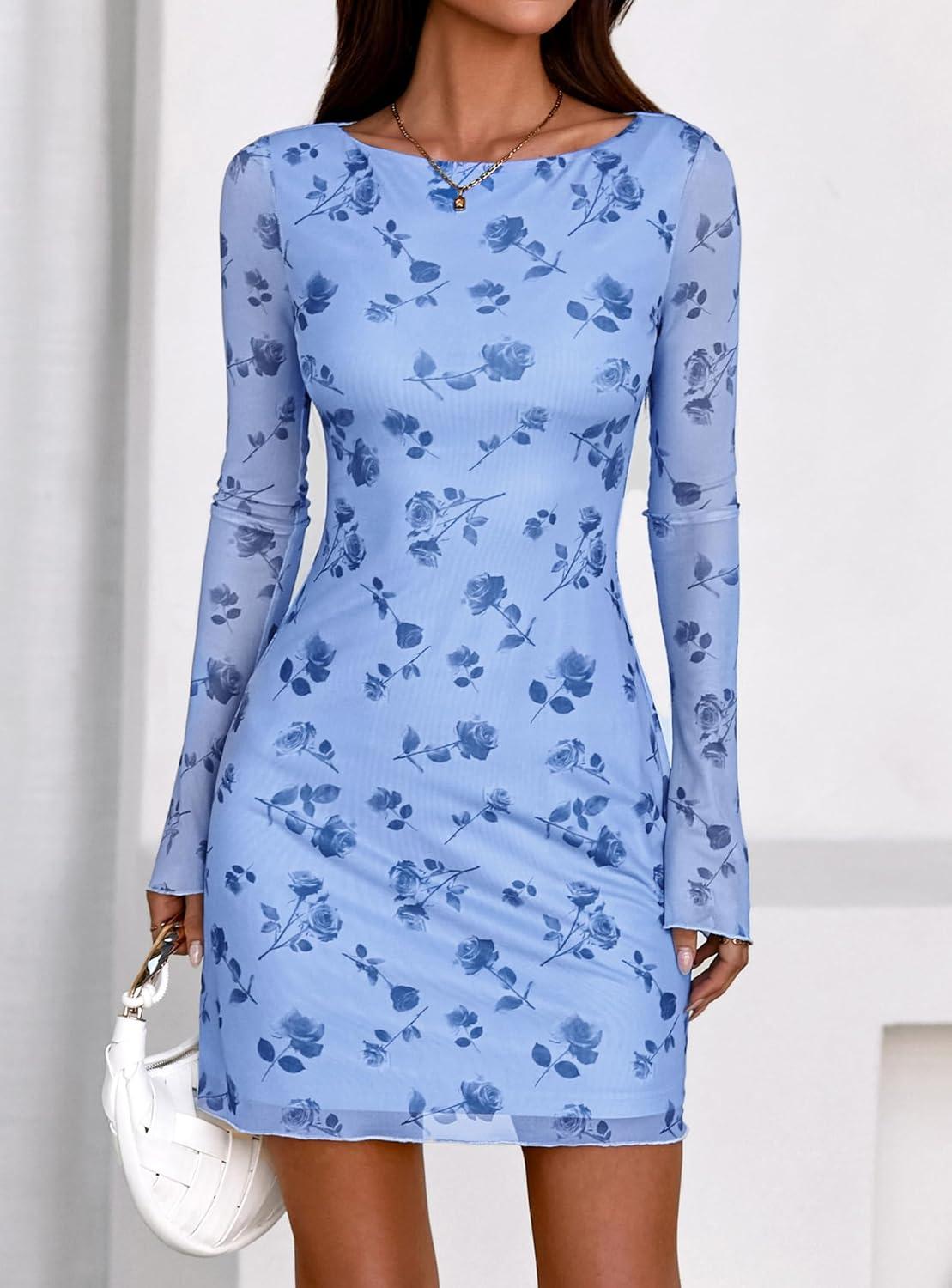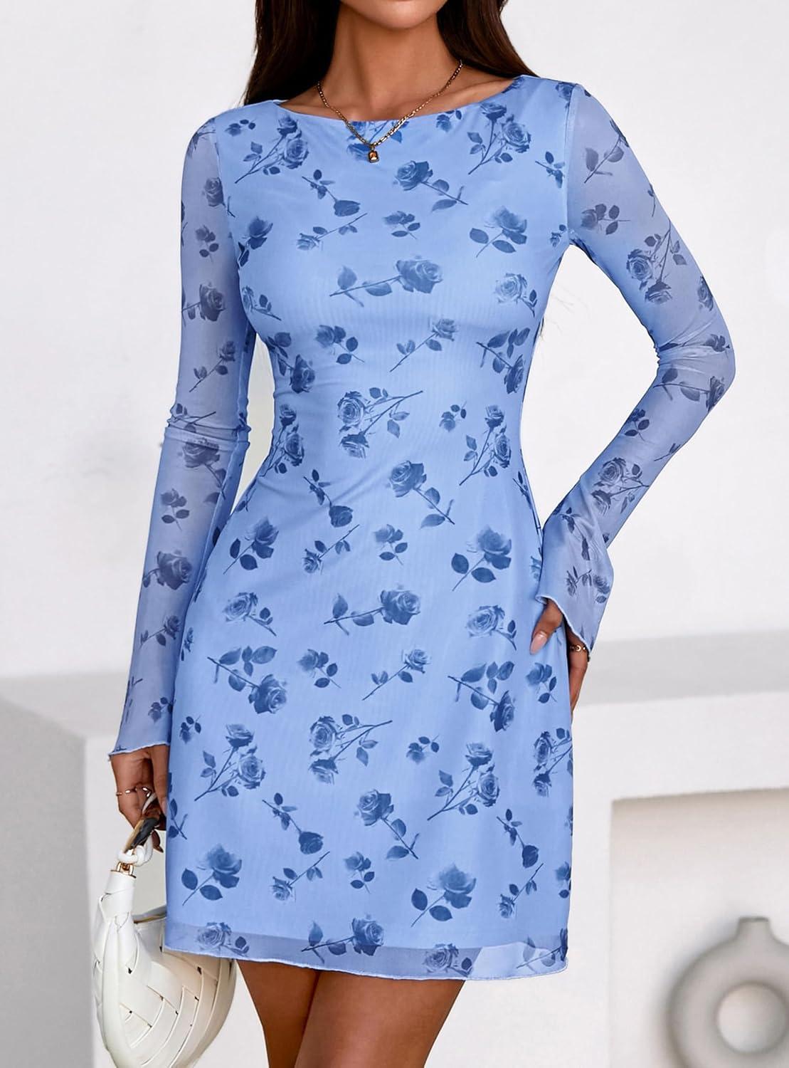 PRETTYGARDEN Women’s 2025 Fall Fashion Floral Long Sleeve Mini Dress Mesh Bodycon Short Party Date Night Going Out Dresses(Floral Light Blue)